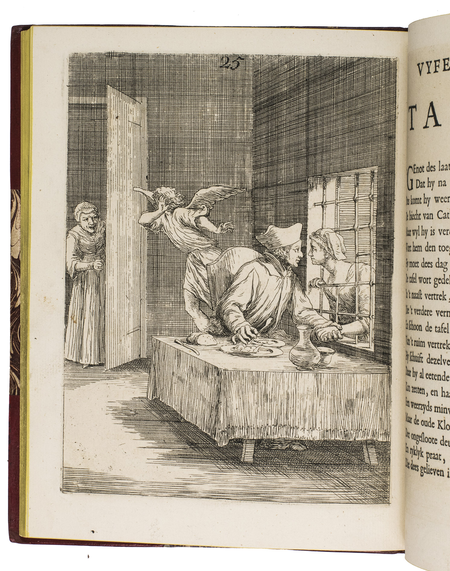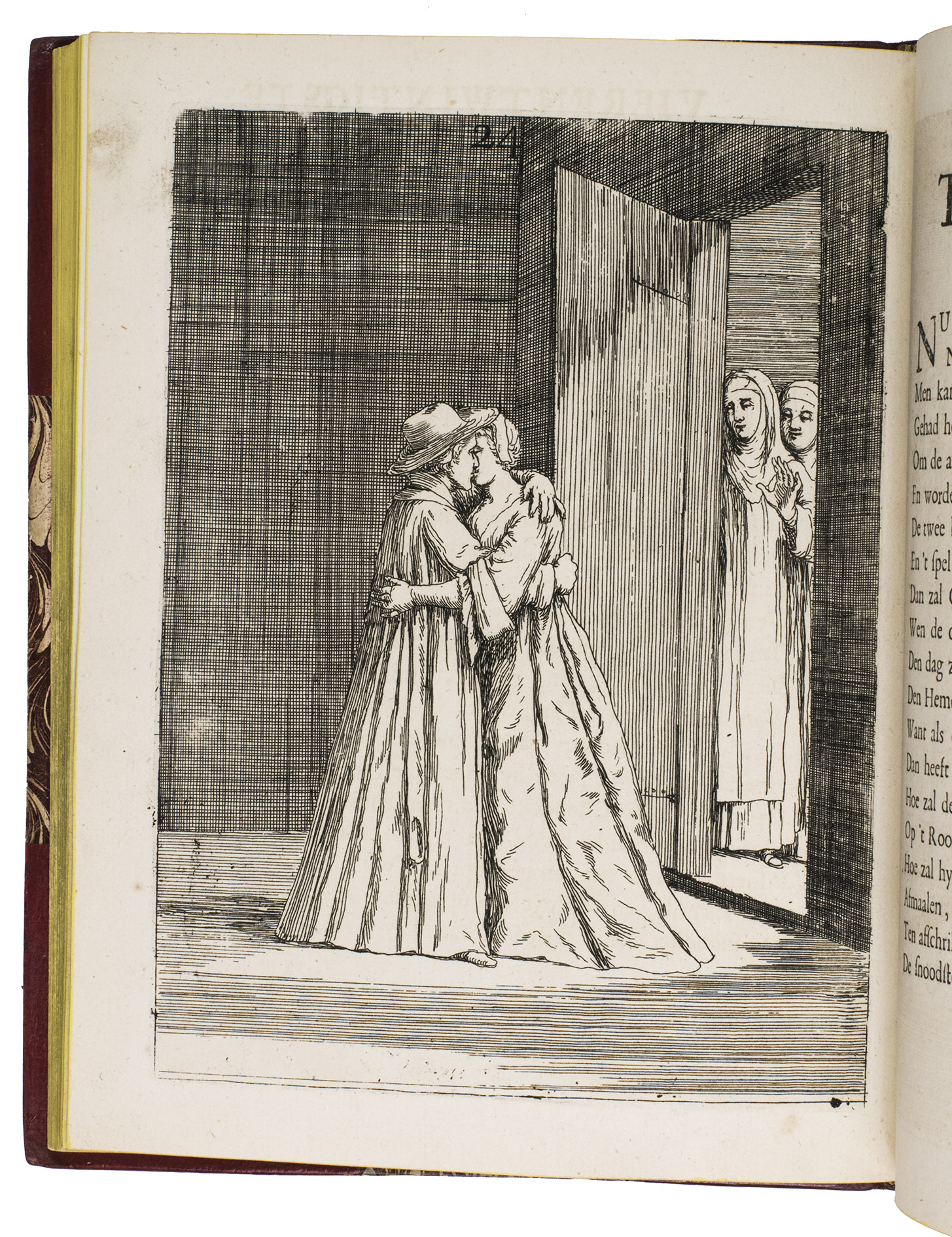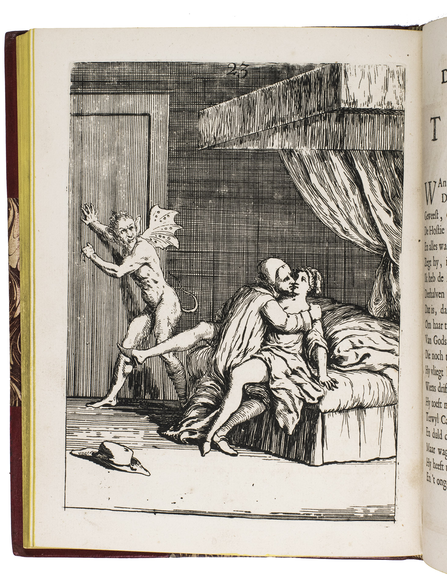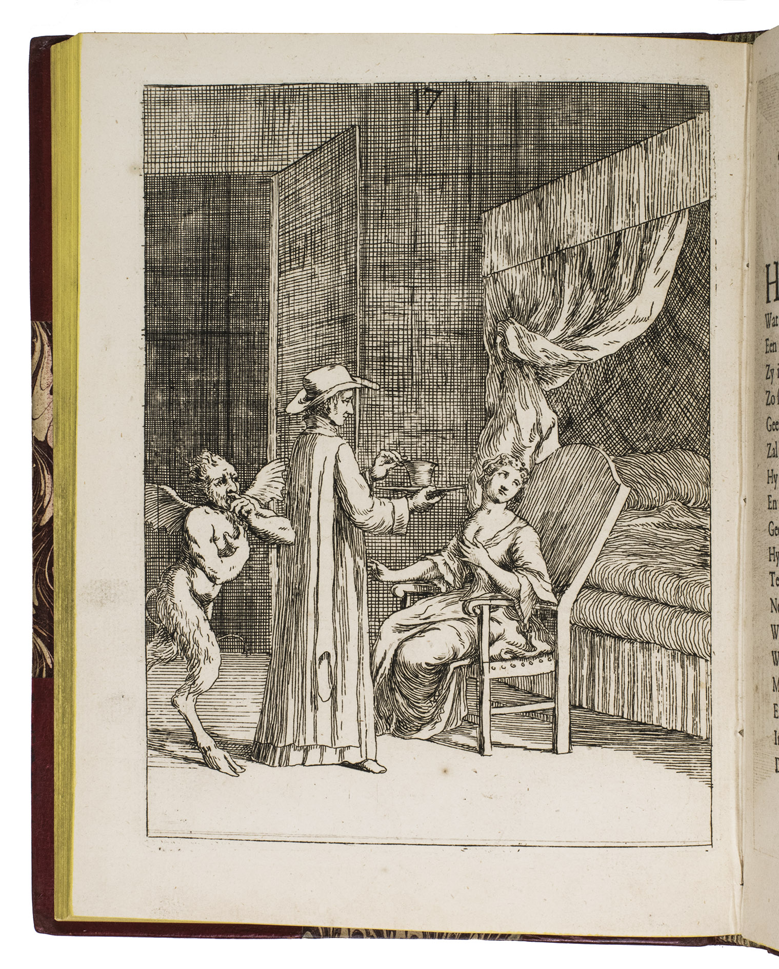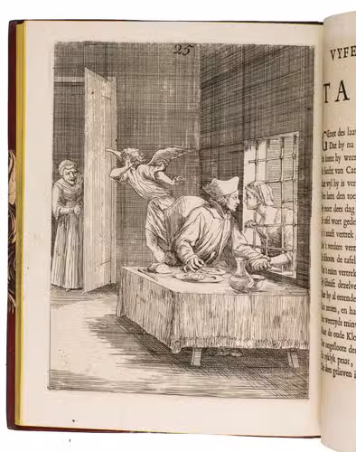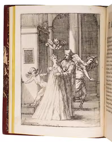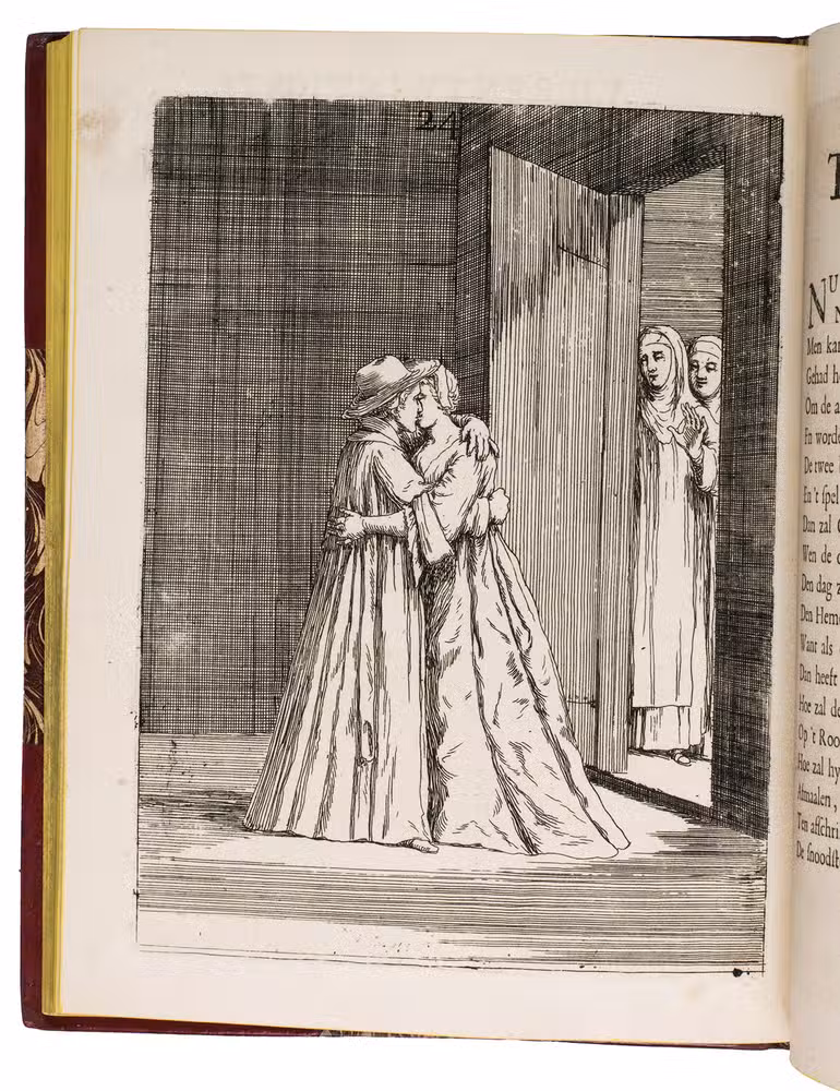 [The Netherlands?], 1735. Small 4to (24 x 18.5 cm). With 32 "scenes", each consisting of an engraved plate with a letterpress poem on the facing page. Gold-tooled red half goatskin morocco (2nd half of the 19th century), richly gold-tooled spine. 24, [128] pp.