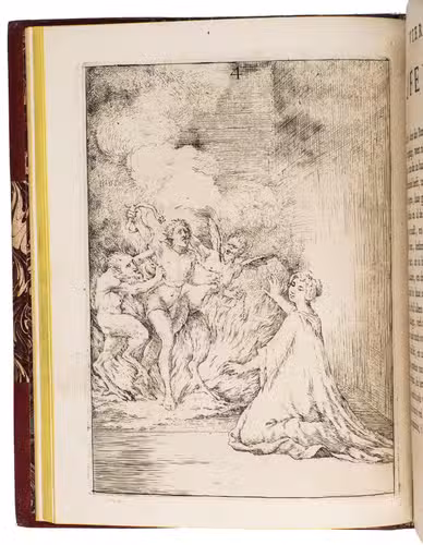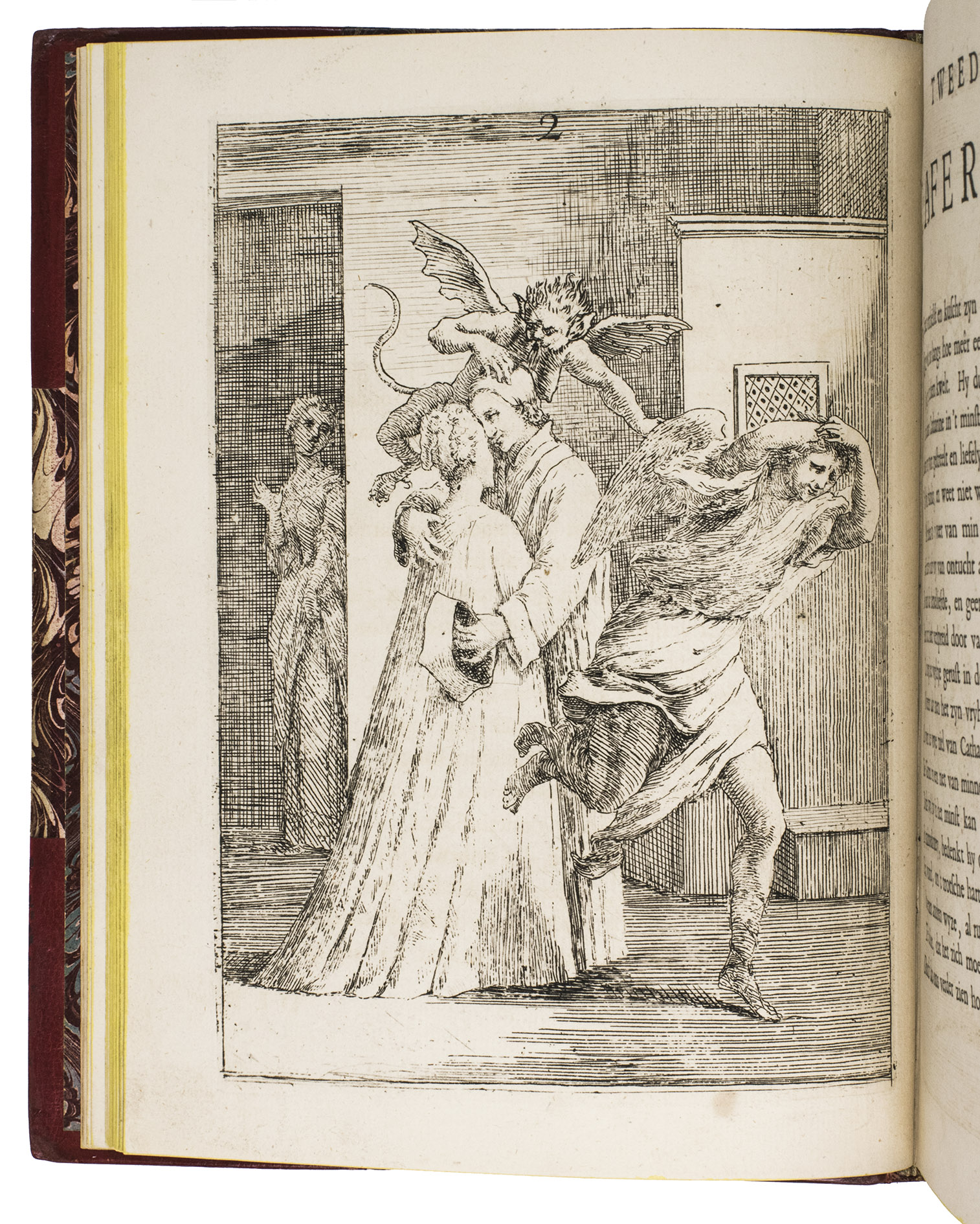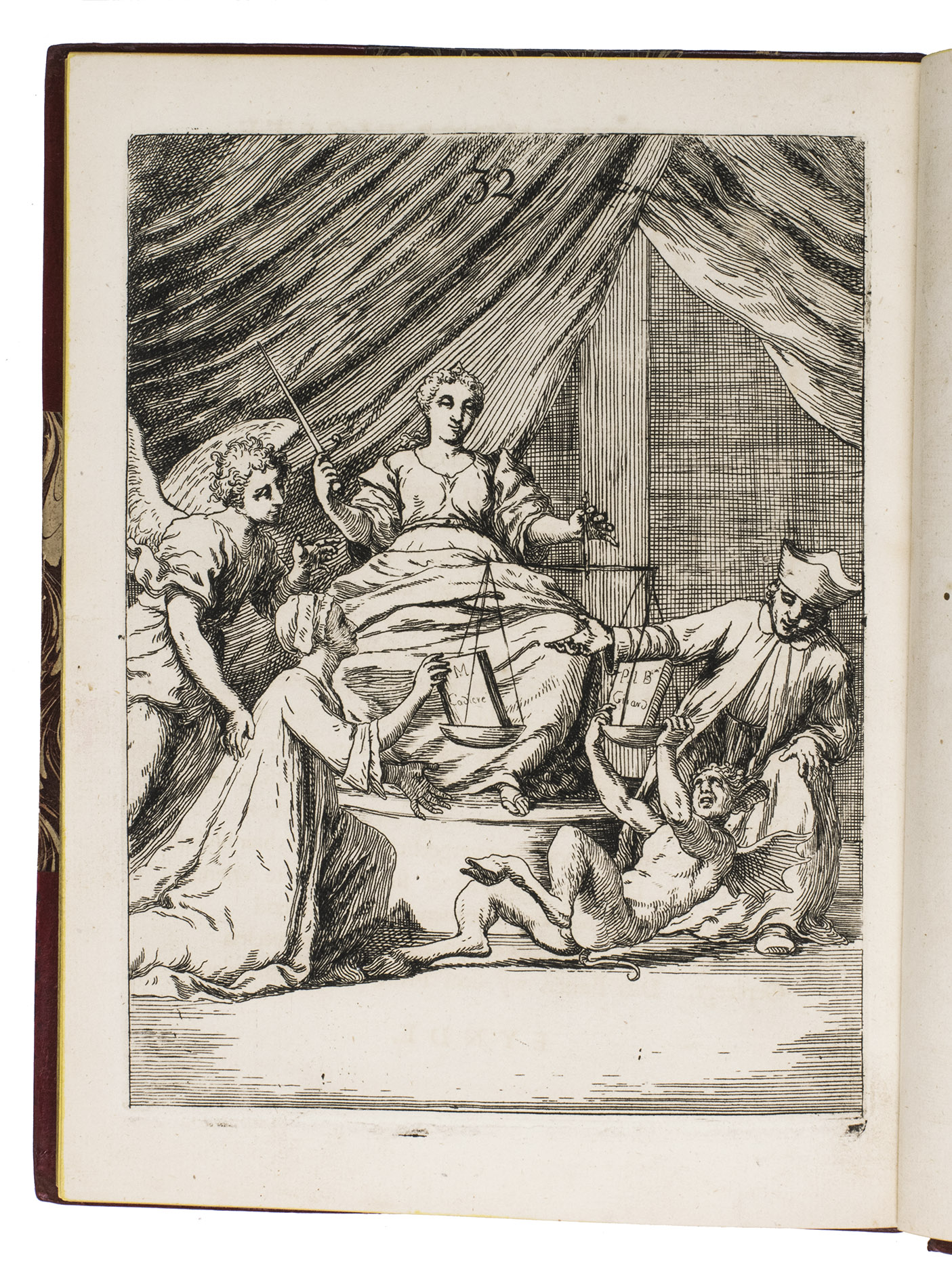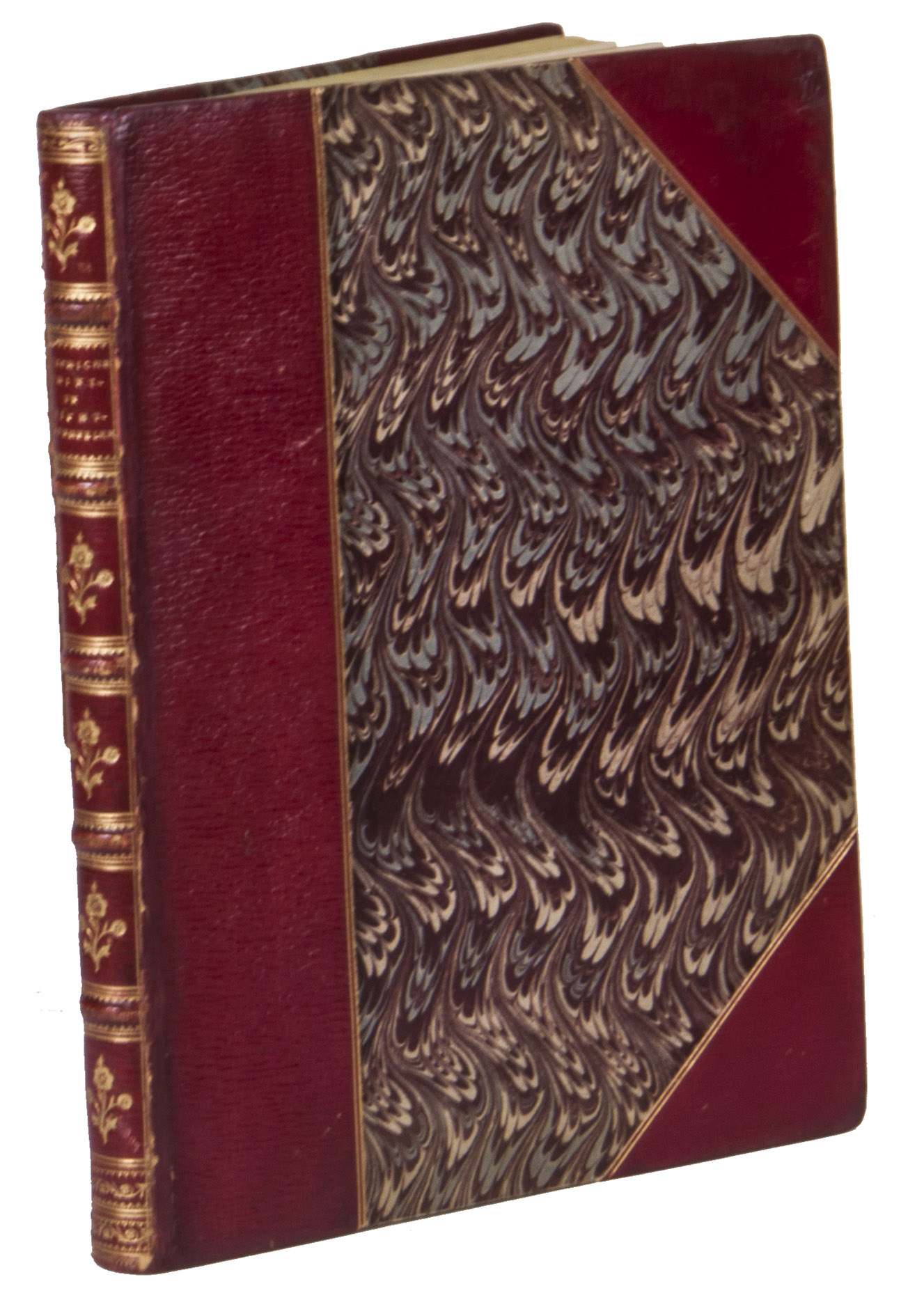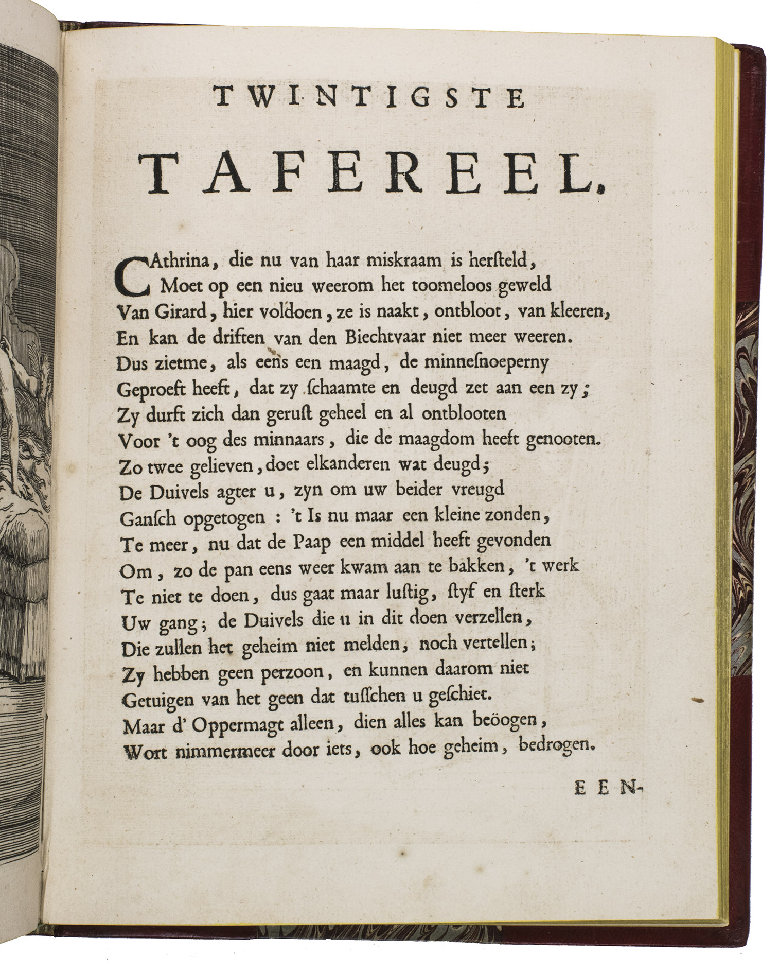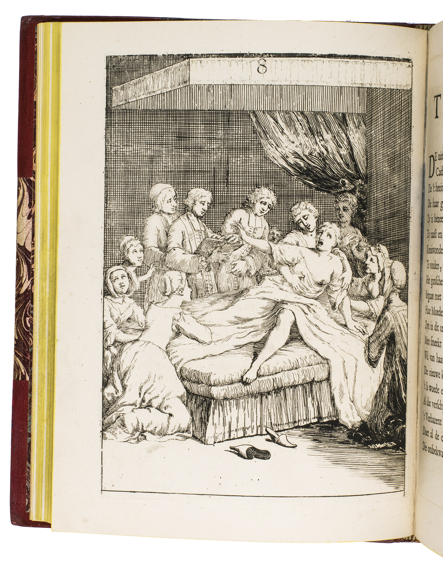 [The Netherlands?], 1735. Small 4to (24 x 18.5 cm). With 32 "scenes", each consisting of an engraved plate with a letterpress poem on the facing page. Gold-tooled red half goatskin morocco (2nd half of the 19th century), richly gold-tooled spine. 24, [128] pp.