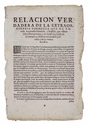 The present publication can be seen as Spanish propaganda presented as "news", emphasizing their victories. While sailing to Cádiz, the Anglo-Dutch fleet came in heavy weather near Dunkirk. The text describes in great detail how ships went down or how they were captured, but also the drowning of many people on board. The present publication in Spanish was printed in Lisbon, in 1625 still under the rule of the Spanish monarchs (the Crown of Portugal was united with the Crowns of Castile and Aragon from 1580 to 1640). It is an outstanding example of the Spanish annus mirabilis, praising the Spanish victories during the wars with England and the Dutch Republic.