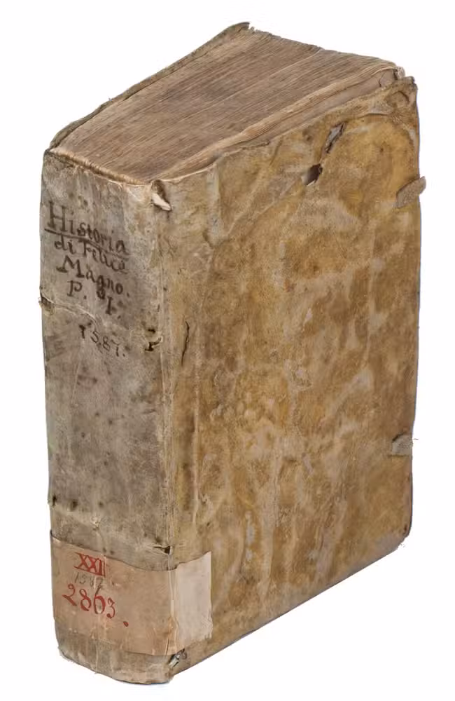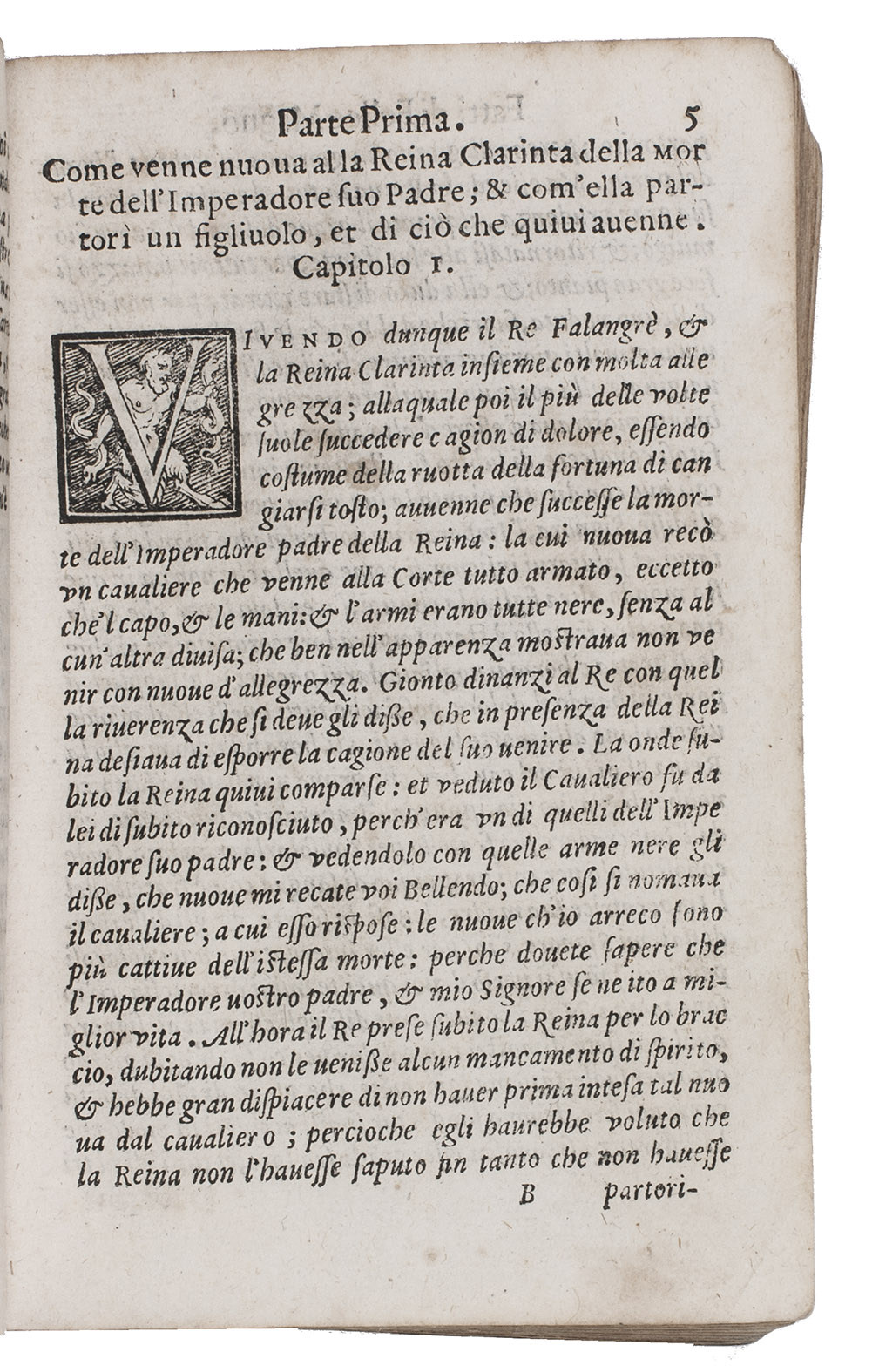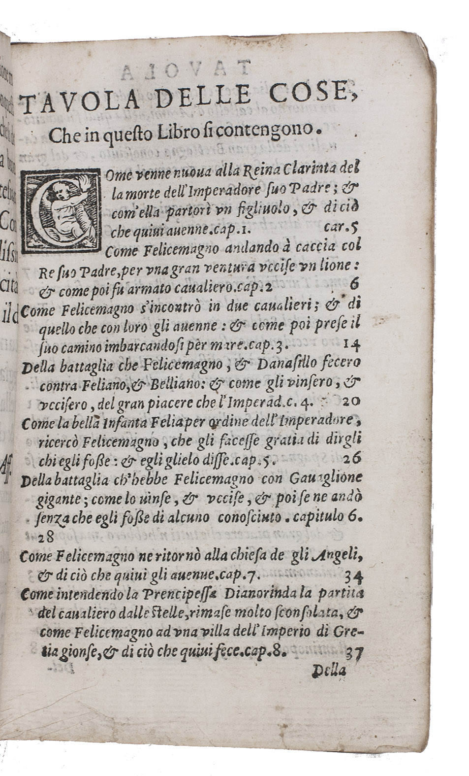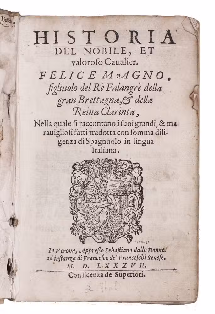 Rare first and only(?) edition of the Italian translation of the first (and only published?) part of a chivalric romance, generally known as the Félix Magno, translated by Camillo Camilli (d. 1615). The original Spanish was first published in four parts at Barcelona by Carlos Amorós in 1531 entitled Los cuatro libros del valerosisimo caballero Félix Magno. The romance deals with the life and history of Félix Magno, the son of King Falángriz of Great Britain and Queen Clarinea, on a quest for glory. A large part of the work is dedicated to struggles with Moors and Turks. Like most chivalric novels, it was heavily influenced by stories of King Arthur and similar romances like Amadis de Gaule. Our copy contains only the first part (with the running title Fatti di Felicemagno - parte prima through the whole work), and it appears the other parts were not published in translation at all.