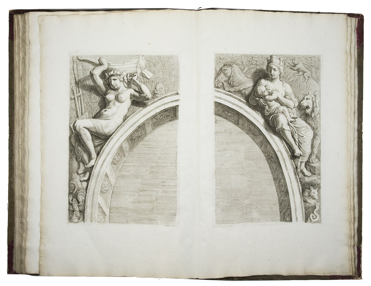 A comprehensive collection of plates showing all architectural features and sculpture of the Amsterdam City Hall, since 1808 the Royal Palace, here in the Covens & Mortier firm's rare ca. 1780 issue with the engravings newly printed from the original copper plates from the years 1655 to 1664 and the text reissued from Leonardus Schenk's 1747 Dutch language edition, the whole with a new title-page. ''This version has not been seen'' (BAL). At least most of the plates were engraved for and first published in Jacob van Campen's masterpiece Afbeelding van 't stadt huys van Amsterdam (Amsterdam, Frederick de Wit, 1664), Hubert Quiellinus's Prima [et secunda] pars praecipuarum ... curiae Amstelrodamenis (Amsterdam, Frederick de Wit 1655-1663) and Afbeelding van 't stadt huys van Amsterdam in dartigh coopere plaaten ... geteeckent door Jacob Vennekool (Amsterdam, Dancker Danckerts, 1661).