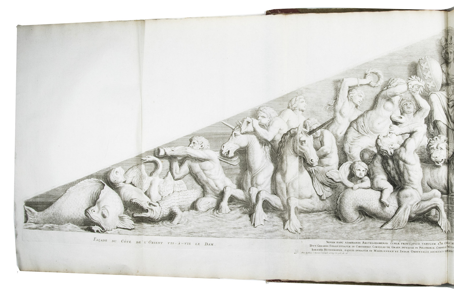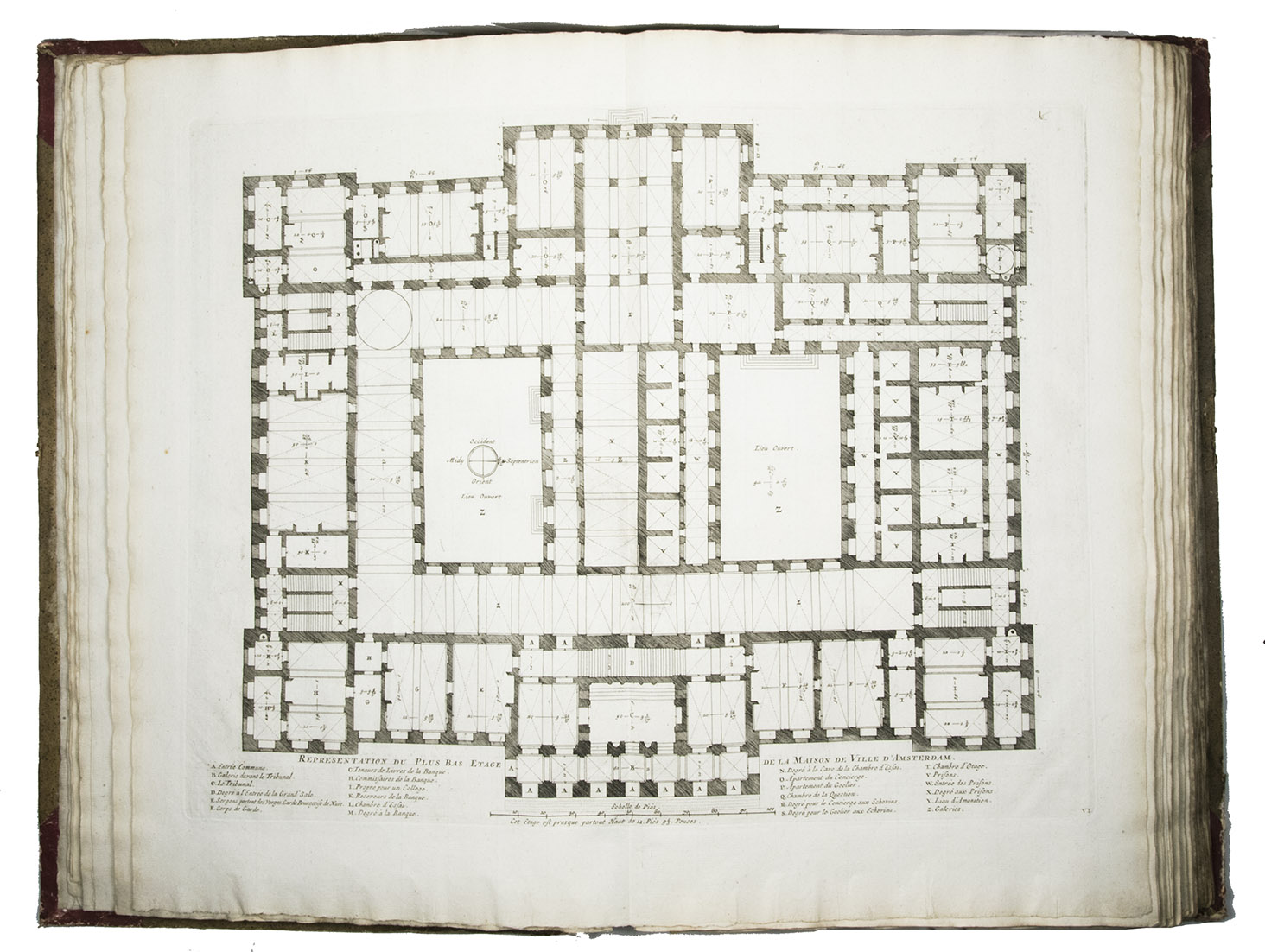 Binding a little worn, untrimmed, otherwise in good condition. The Amsterdam city hall in full glory with all its architectural features and sculpture. BAL 132 note (description of 1719 French language ed. but citing Berlin Kat. & Kuyper for unseen "1730" Dutch ed.); Berlin Kat. 2236; Kuyper, Dutch Classicist architecture (Delft, 1980), pp. 212- 215 and note 25 (p. 318); STCN (3 copies); cf. for dating the impressum: Van Egmond, Covens & Mortier (2005), pp. 66, 83-88.