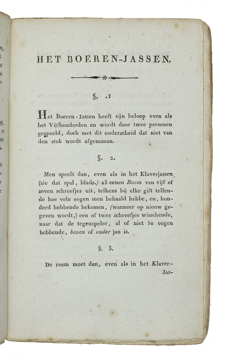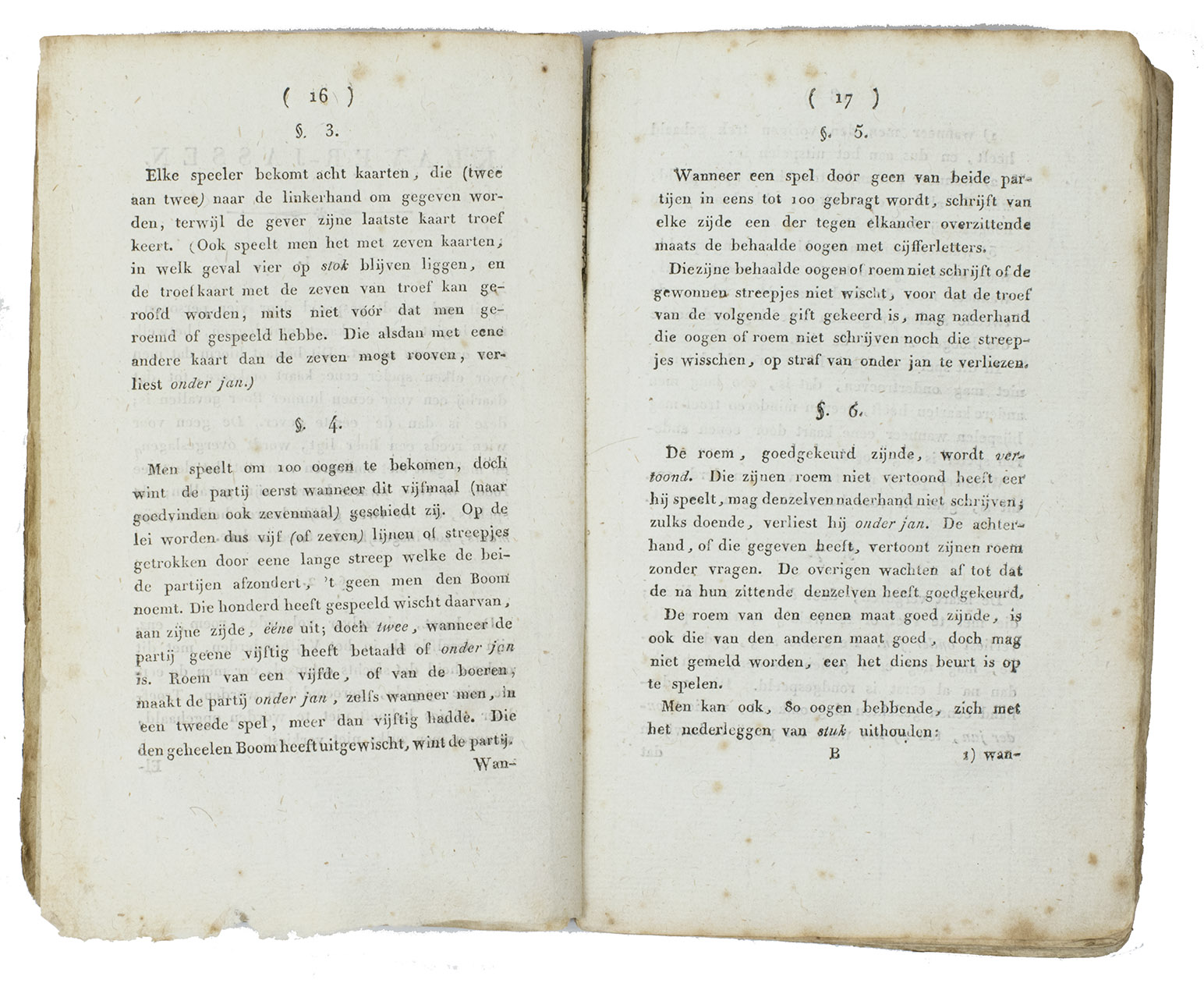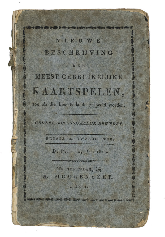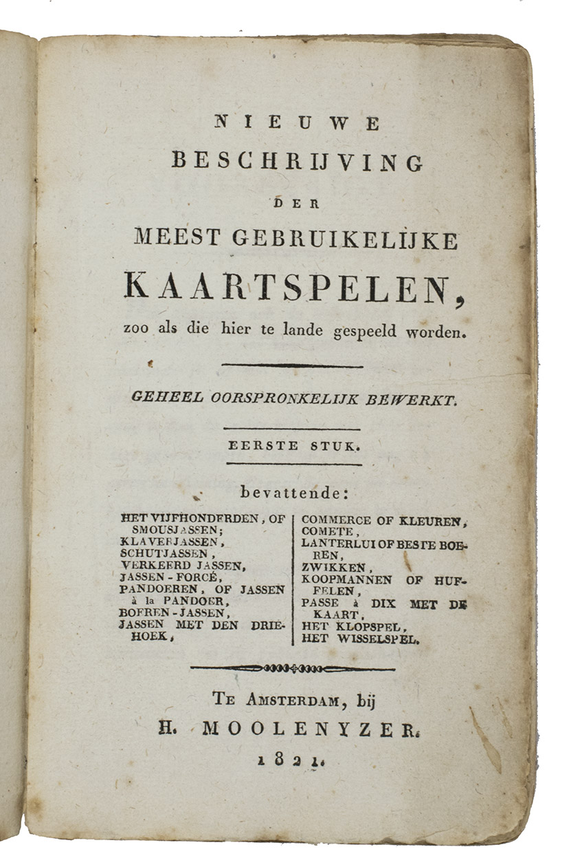 Very rare first edition of a description of the most popular card games played in the Netherlands in the first quarter of the 19th century, published in two parts. The first part includes descriptions of the card games vijfhonderden (or: smousjassen), klaverjassen (klaberjass), schutjassen, pandoeren, jassen met den driehoek, zwikken, huffelen, wisselspel and others. The second part includes the famous whist as well as ombre (three versions), quadrille and piket and others. Edmund Hoyle had published his famous first game book (on Whist) in 1742 and his first collected edition of various games in 1748, translated into Dutch in 1790. While both parts of the present book note that they provide standardized rules as the games are most often played "in this country" (the present Netherlands and Belgium were united as a single kingdom from 1815 to 1830), the introduction to part one explicitly describes the games themselves as those most often played in this country, while the second part covers the four games that appeared in Hoyles book.