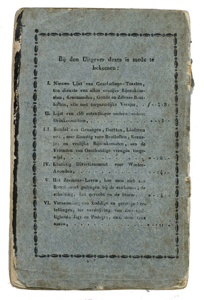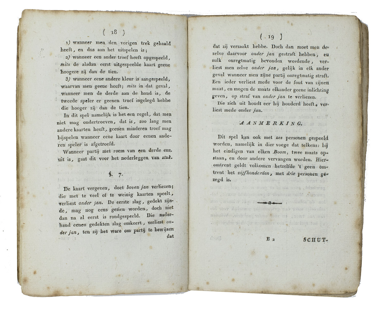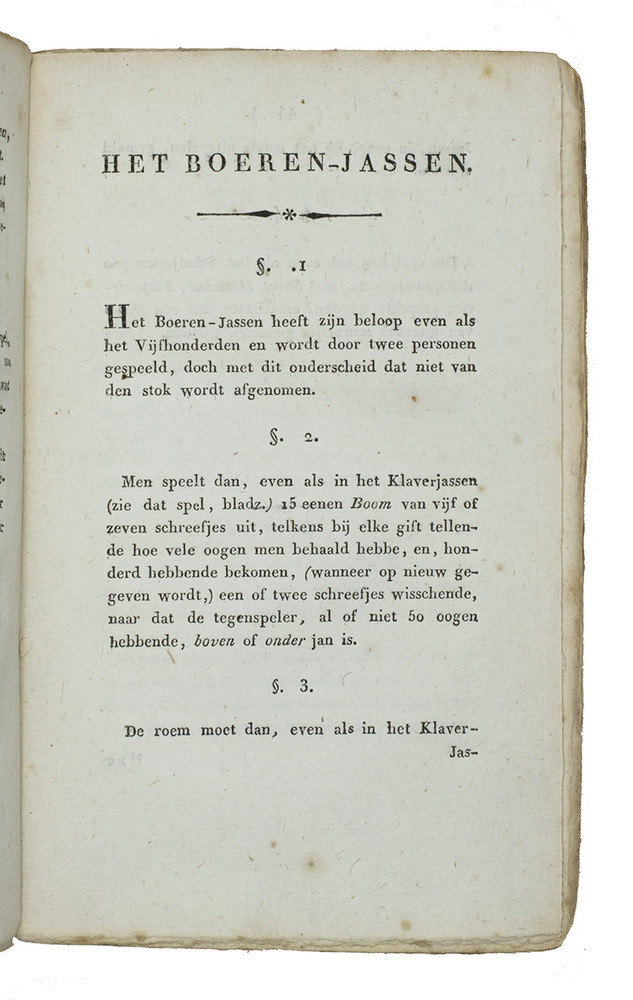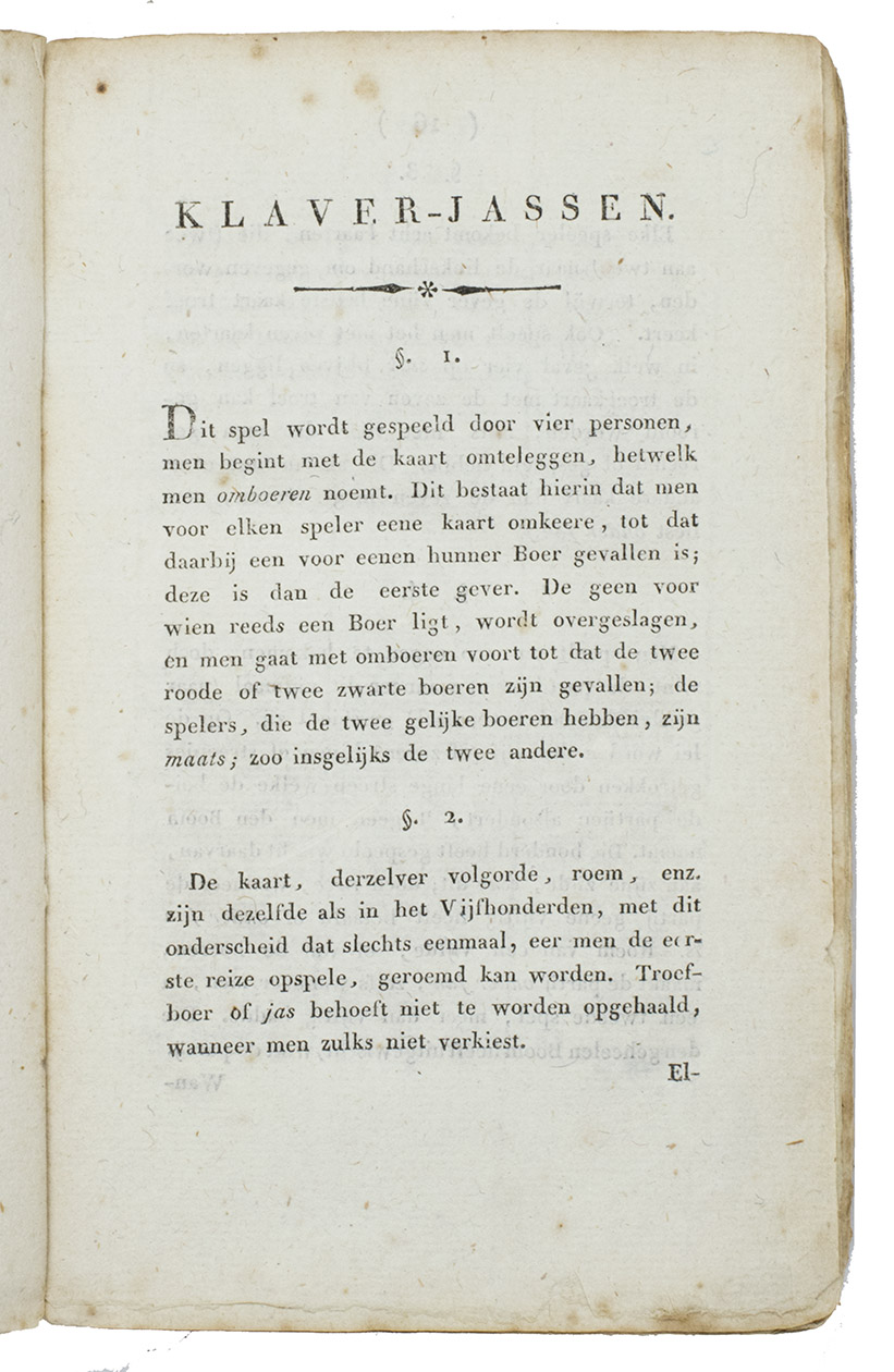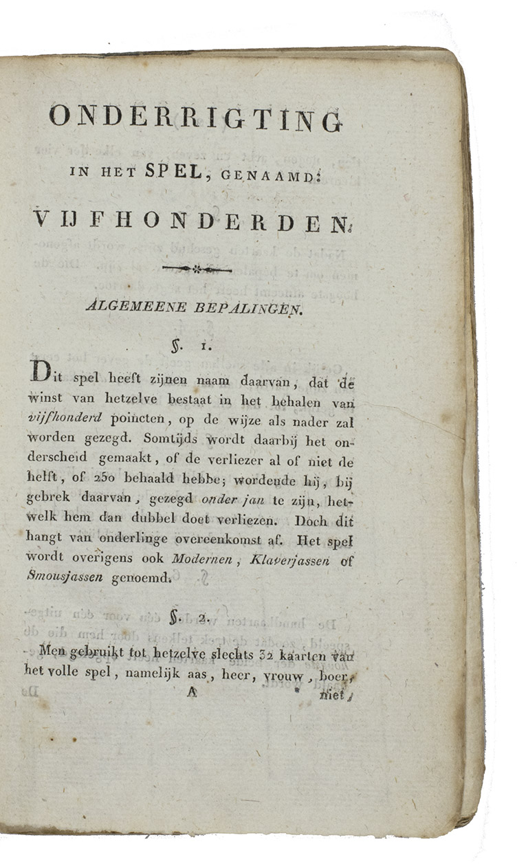 Very rare first edition of a description of the most popular card games played in the Netherlands in the first quarter of the 19th century, published in two parts. The first part includes descriptions of the card games vijfhonderden (or: smousjassen), klaverjassen (klaberjass), schutjassen, pandoeren, jassen met den driehoek, zwikken, huffelen, wisselspel and others. The second part includes the famous whist as well as ombre (three versions), quadrille and piket and others. Edmund Hoyle had published his famous first game book (on Whist) in 1742 and his first collected edition of various games in 1748, translated into Dutch in 1790. While both parts of the present book note that they provide standardized rules as the games are most often played "in this country" (the present Netherlands and Belgium were united as a single kingdom from 1815 to 1830), the introduction to part one explicitly describes the games themselves as those most often played in this country, while the second part covers the four games that appeared in Hoyles book.