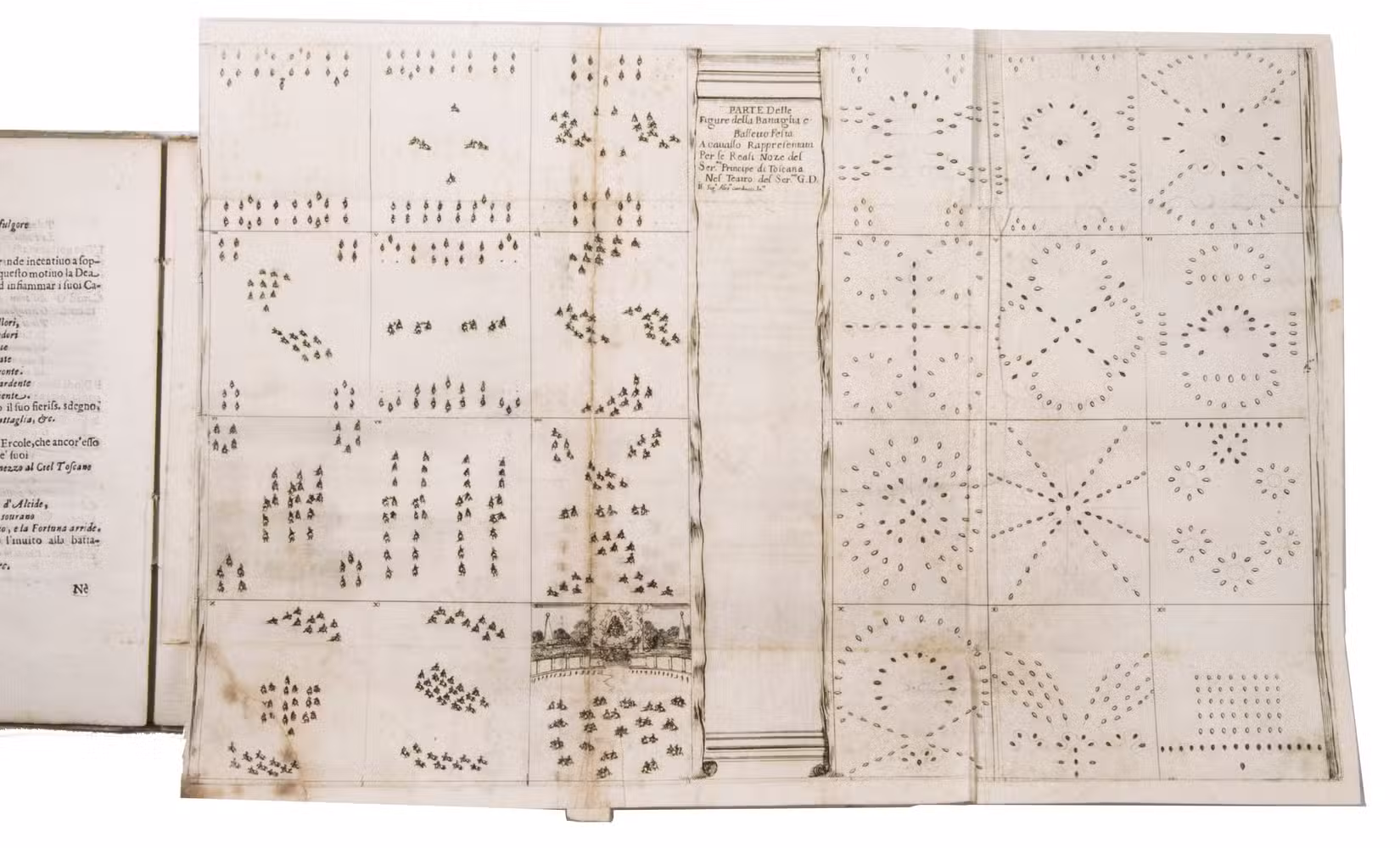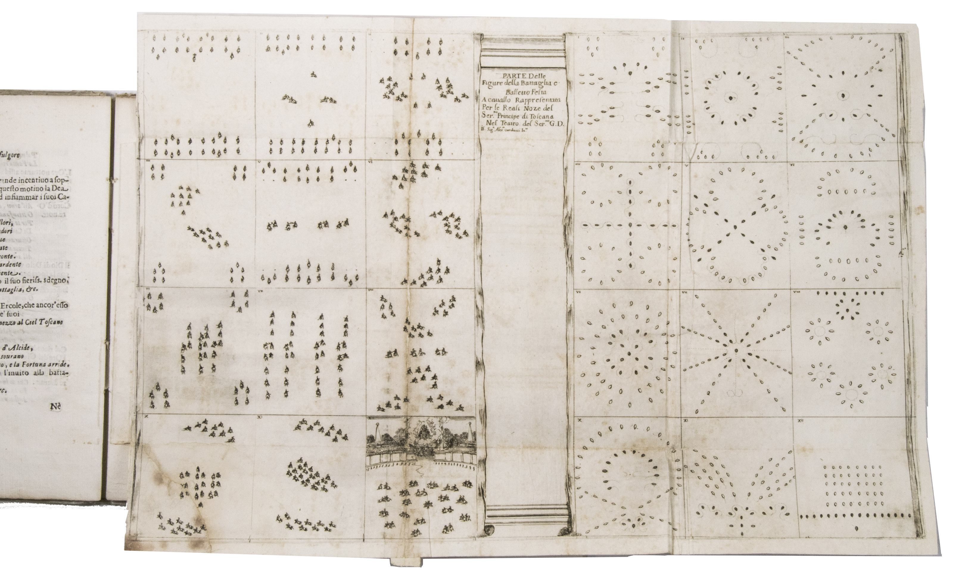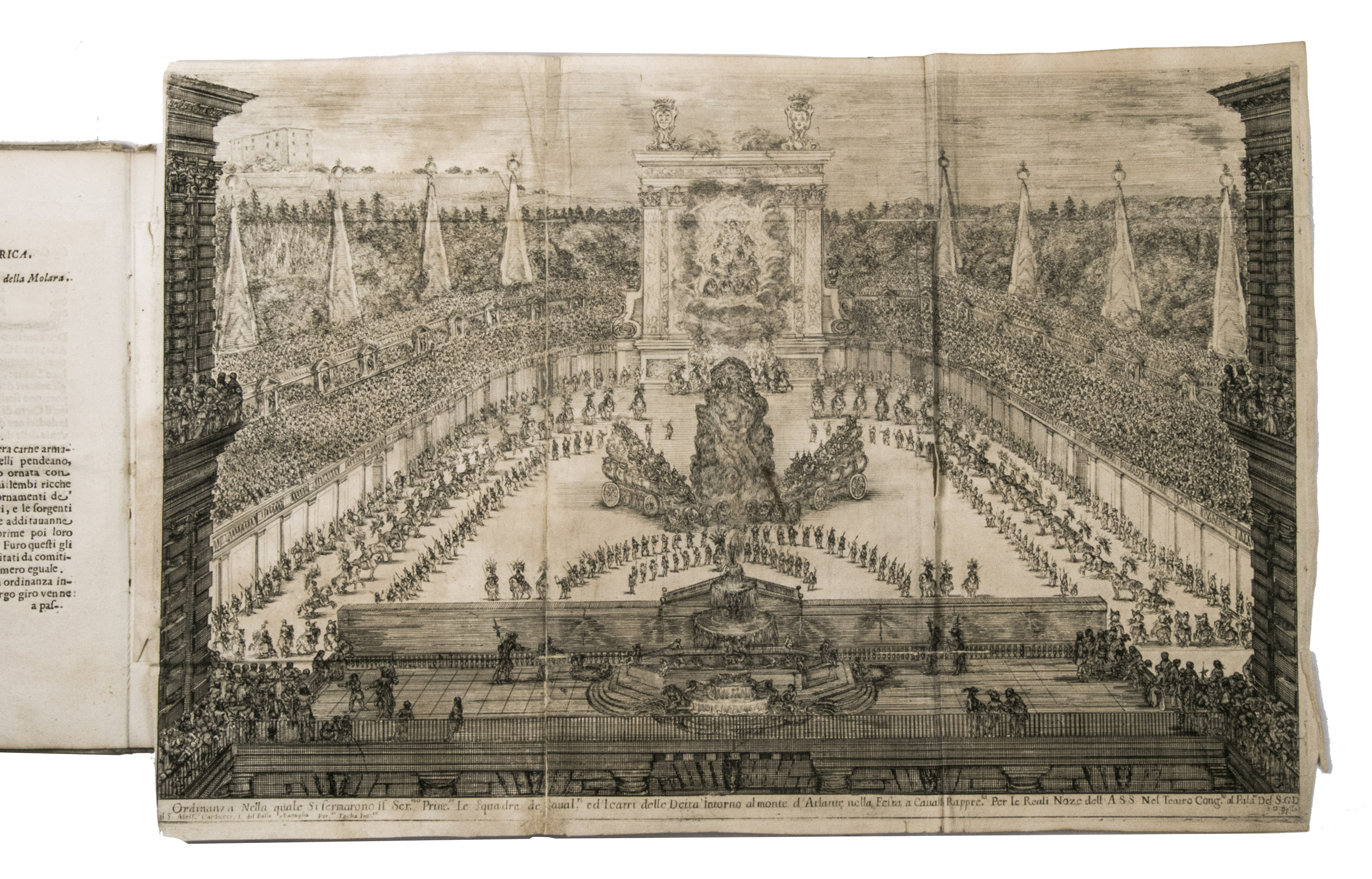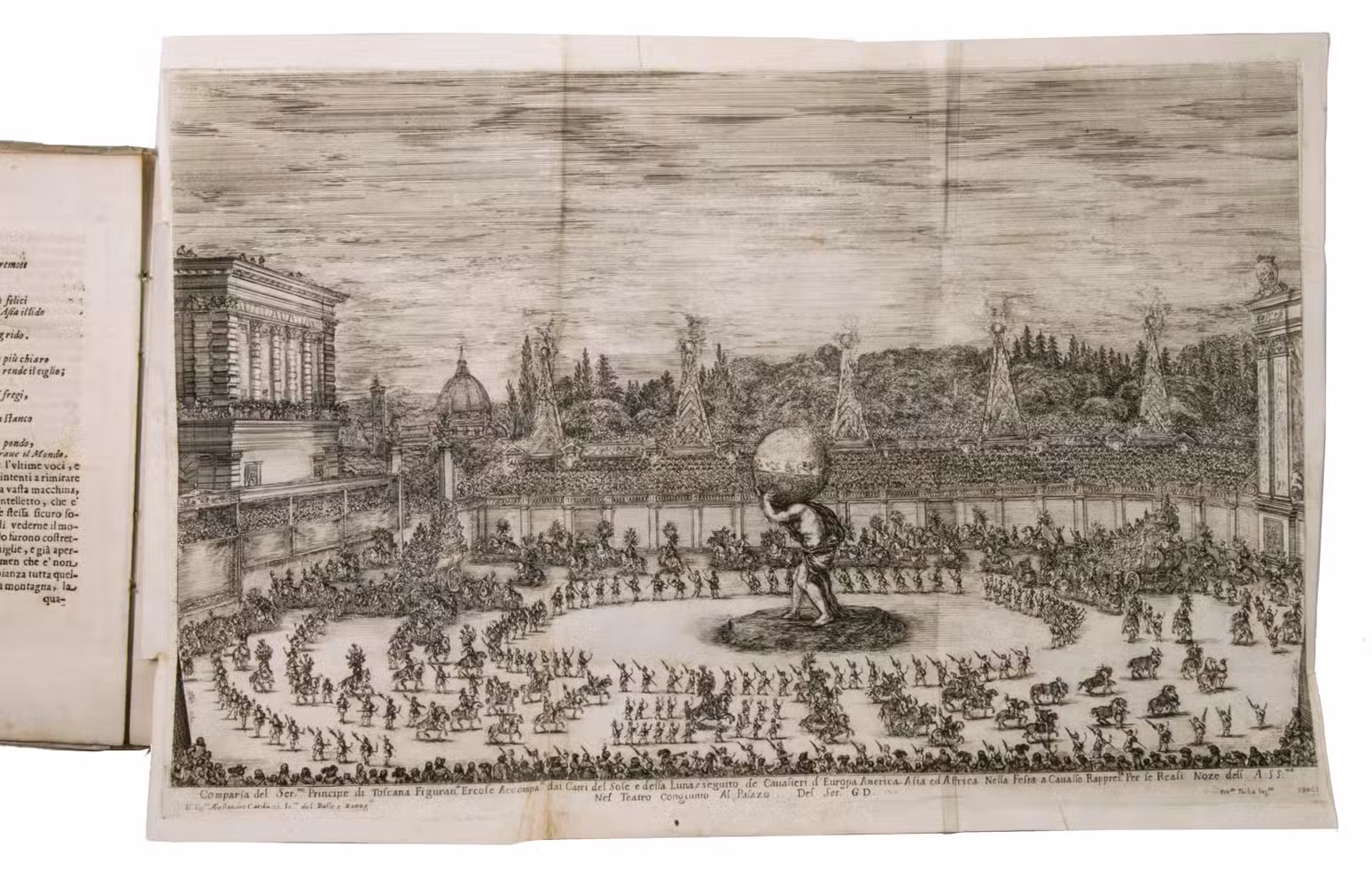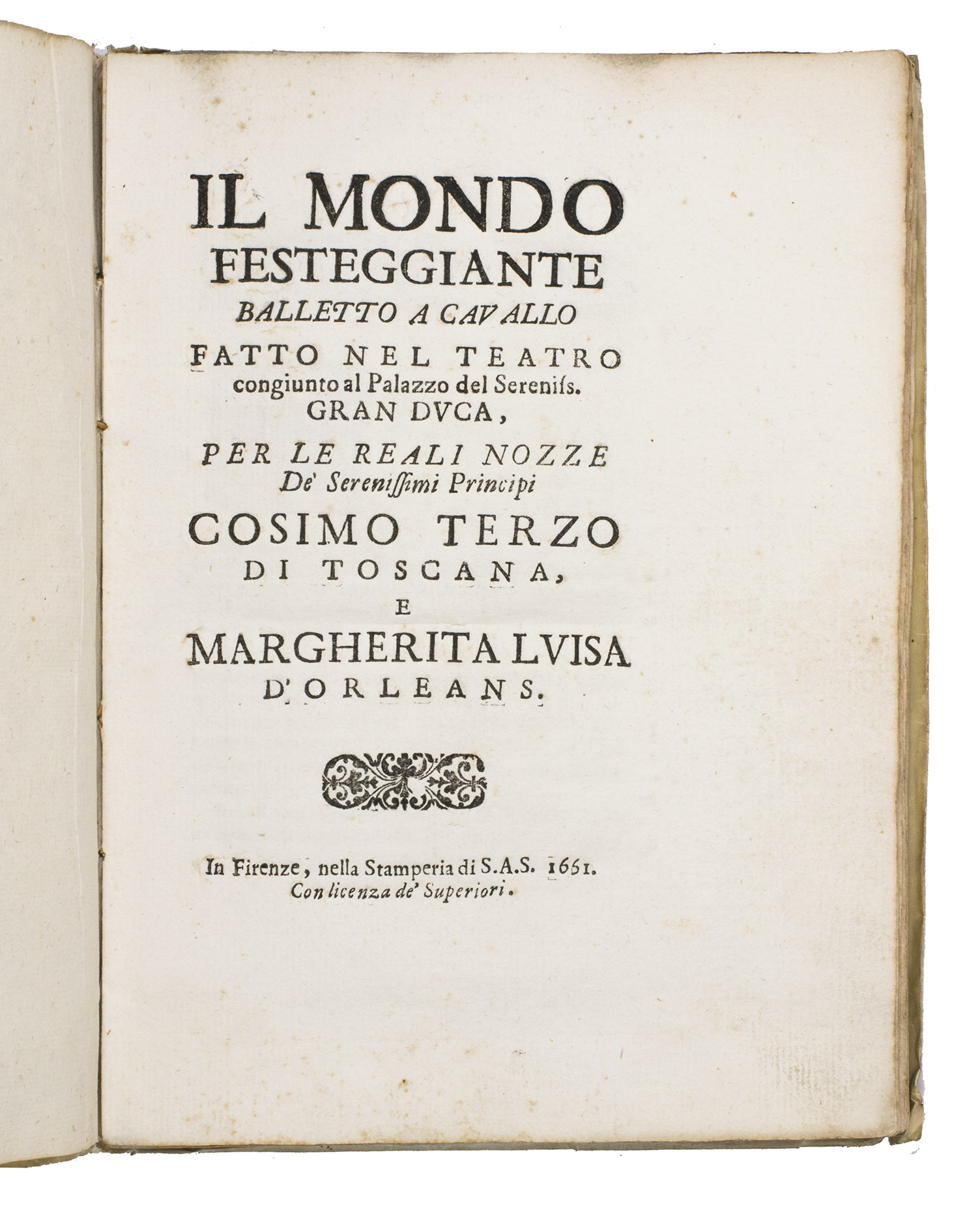 First and only edition of a Florentine festival book, magnificently illustrated with three large folding copper engravings by Stefano della Bella (1610-1664), produced to commemorate the sumptuous equestrian ballet staged for the marriage of Cosimo III de Medici (1642-1723) and Marguerite Louise dOrléans (1645-1721) on 20 June 1661.