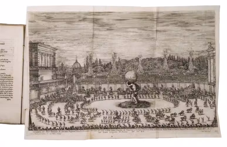 The first two large folding engravings are signed by della Bella, and also bear the name of the engineer Ferdinando Tacca (1619-1686), who oversaw the complex machinery of the performance. The plates depict: the grand cavalcade of Hercules, accompanied by the chariots of the Sun and the Moon and followed by riders representing Europe, Asia, Africa, and America, the general arrangement of the quadrilles around Mount Atlas; the plan of the tournament and equestrian ballet, with detailed diagrams of the manoeuvres.