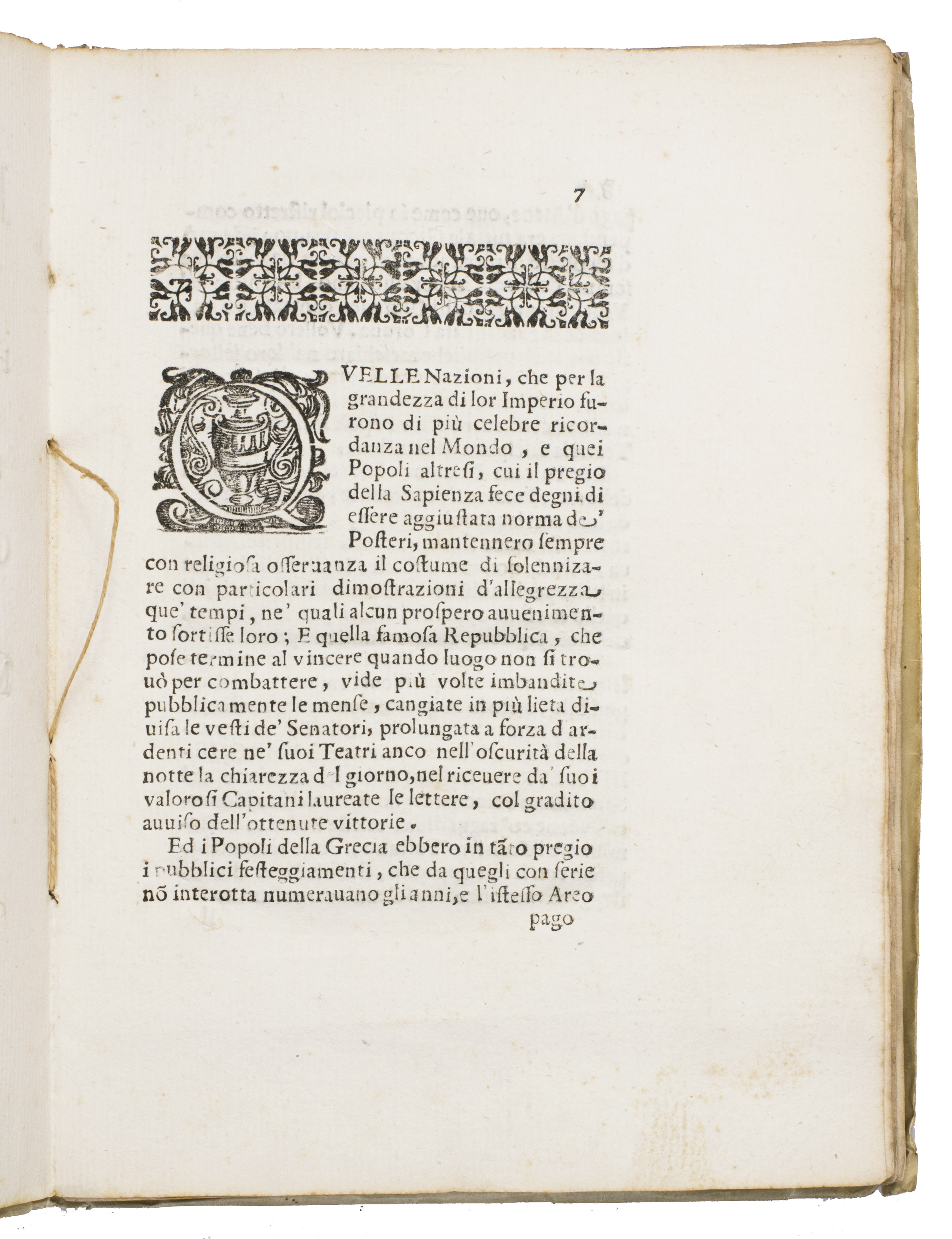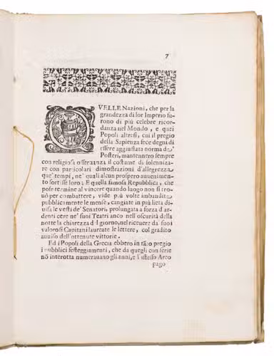 Florence, Nella stamperia di S.A.S., 1661. 4to. With 3 fold-out engravings, 1 woodcut initial, and 2 woodcut headpieces. Contemporary gold-tooled vellum. [1], [1 blank], 7-66, [2 blank] pp.