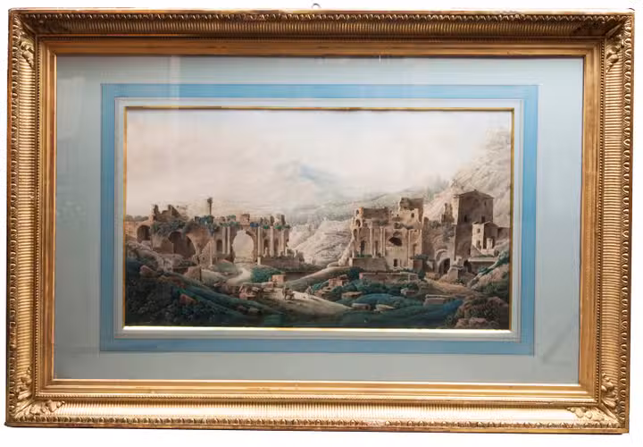 [Sicily or Paris], [ca. 1781 or somewhat later?]. 46 x 81 cm (frame 85 x 128 cm). Watercolour with pencil outlines and highlighted with white, laid in on paper pasted on wood.With a later blue and gold passe-partout in a contemporary gilt frame.