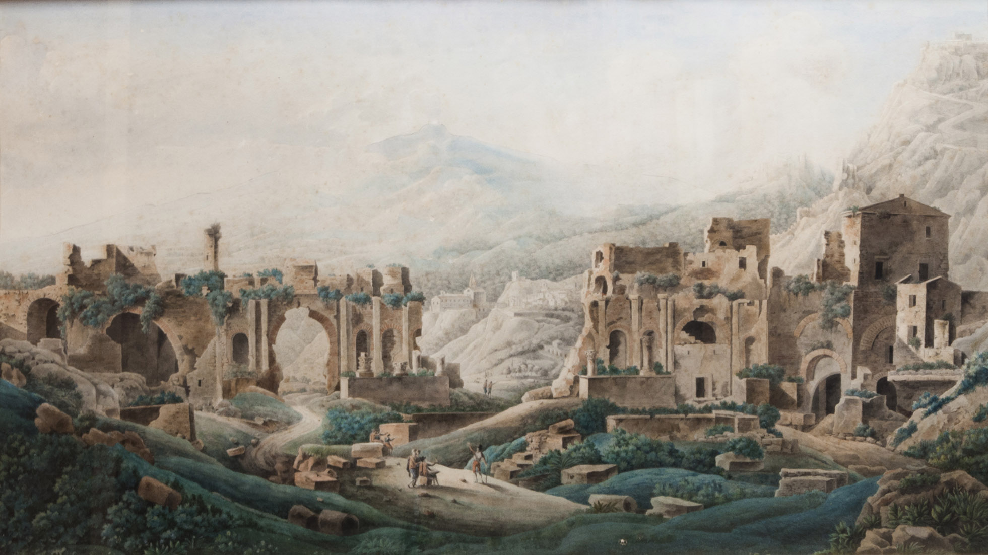 Large watercolour-drawing of the Taormina temple ruins in Sicily, with Mount Etna in the distance, attributed to the French landscape painter Louis-François Cassas (1756-1827), who is best known for his illustrations for numerous travel books of the Levant published in the late 18th and early 19th century. He had a keen interest in and knowledge of classical architecture, displayed in full in the present drawing.