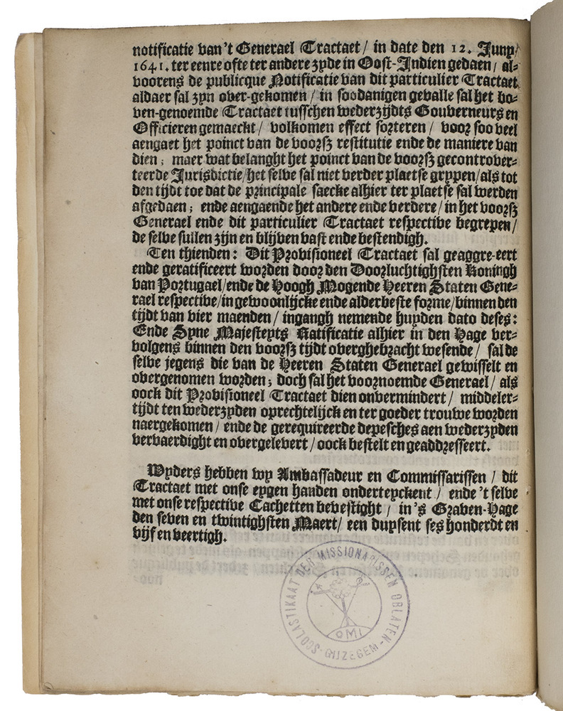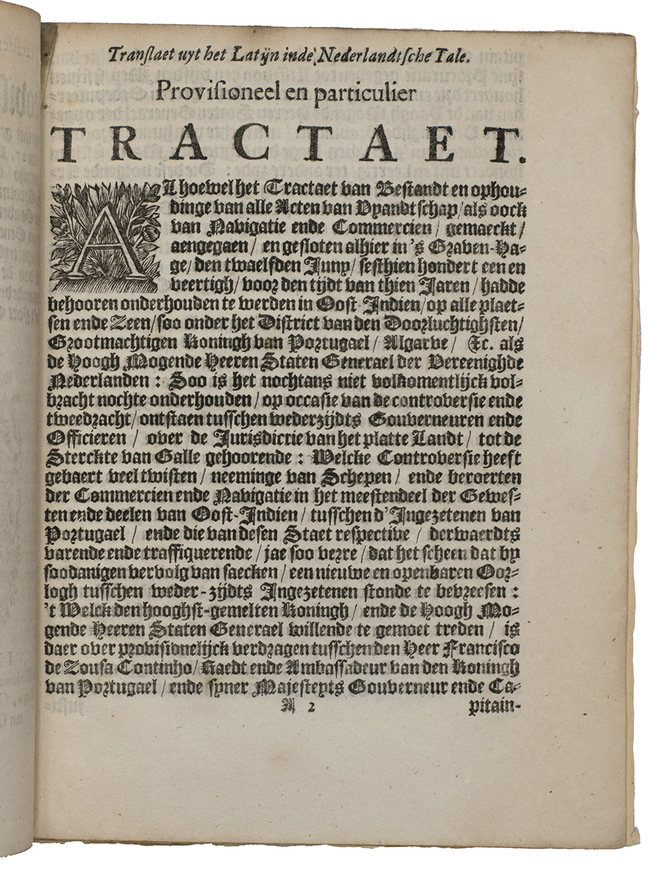 A late edition, copying the original 1645 imprint, of a provisional agreement made between the Dutch States General and the Portuguese ambassador Francisco de Zousa Continho on the jurisdiction and territory of Fort Galle, one of the most important outposts in Ceylon (Sri Lanka), one of the most important outposts both strategically and as a trading centre. The Dutch had captured it from the Portuguese in 1640 and they had been fighting in the region since that time. As the Eighty Years' War was nearing its conclusion the present treaty was written in an attempt to settle the dispute. The dispute in fact continued beyond the peace of 1648 until the Dutch managed to drive the rest of the Portuguese out of Ceylon by 1658.