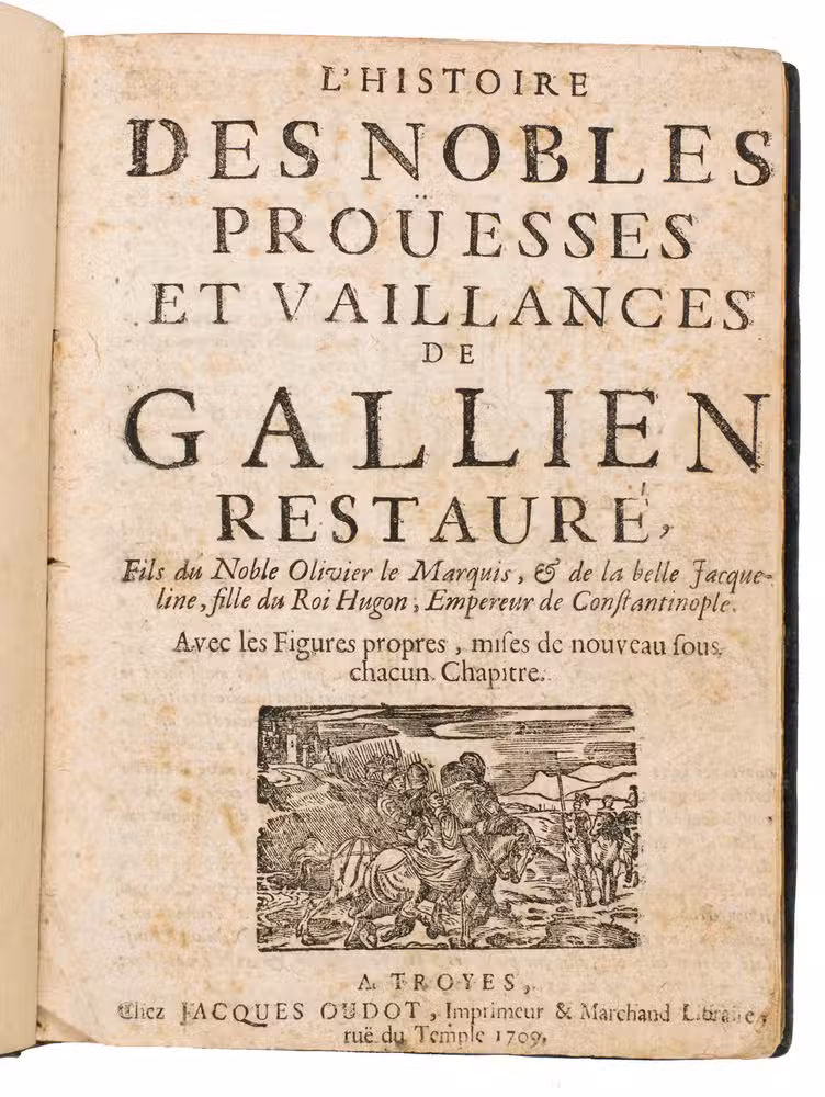 L'Histoire des nobles proüesses et vaillances de Gallien restauré, fils du noble Olivier le marquis, & de la belle Jacqueline, fille du roi Hugon, empereur de Constentinople. Avec les figures propres, mises de nouveau sous chacun chapitre.