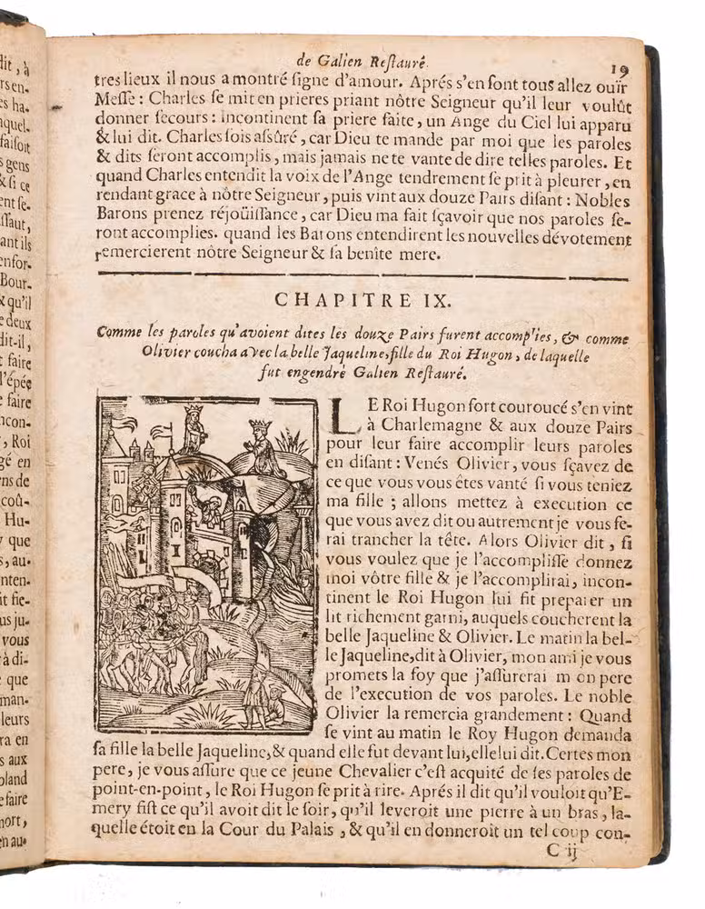 Ad 1: Extremely rare and richly woodcut illustrated chapbook edition of one of the popular romances woven around Charles the Great and his Twelve Peers. According to the Count of Tressan, Gallien was called "Restauré" because he restored the affairs of the French in Spain, those of the Christians in Constantinople, and those of his mother in Mesopotamia. However, Nisard judges this too simple, and according to him the name is given to the hero because he overcame all obstacles with which his life was littered since his birth. Gallien was an illegitimate son and consequently robbed of an inheritance. However, after many difficulties and adventures he found his father and convinced him to legally accept him, and to rehabilitate and restore his mother to her rightful position on the throne of Constantinople. The present edition is most richly and attractively illustrated, which is extremely rare.
