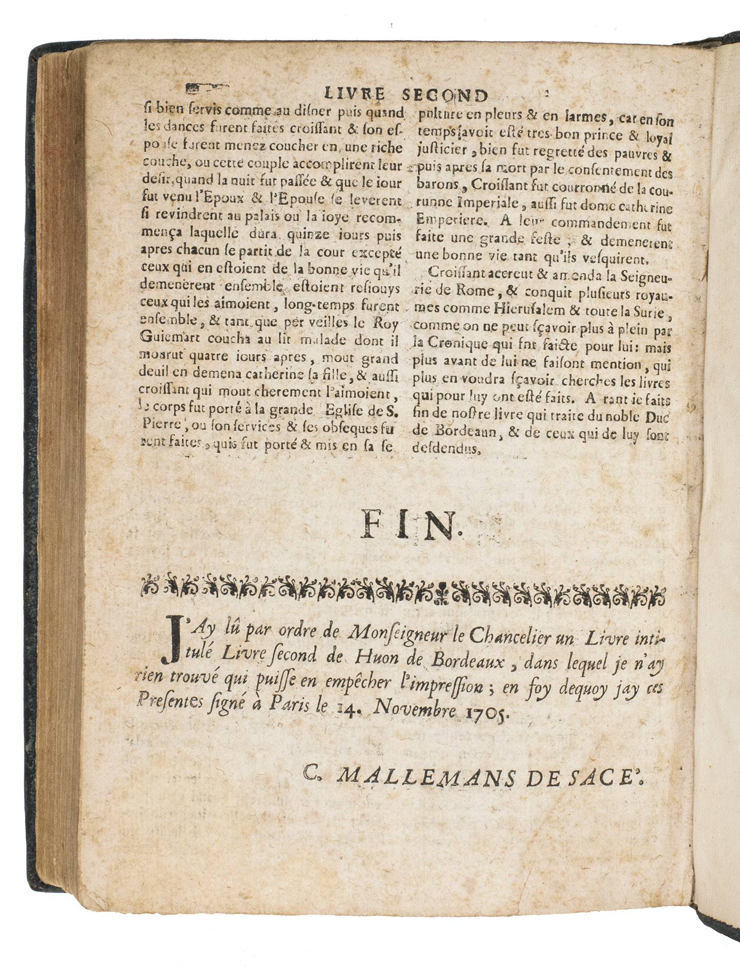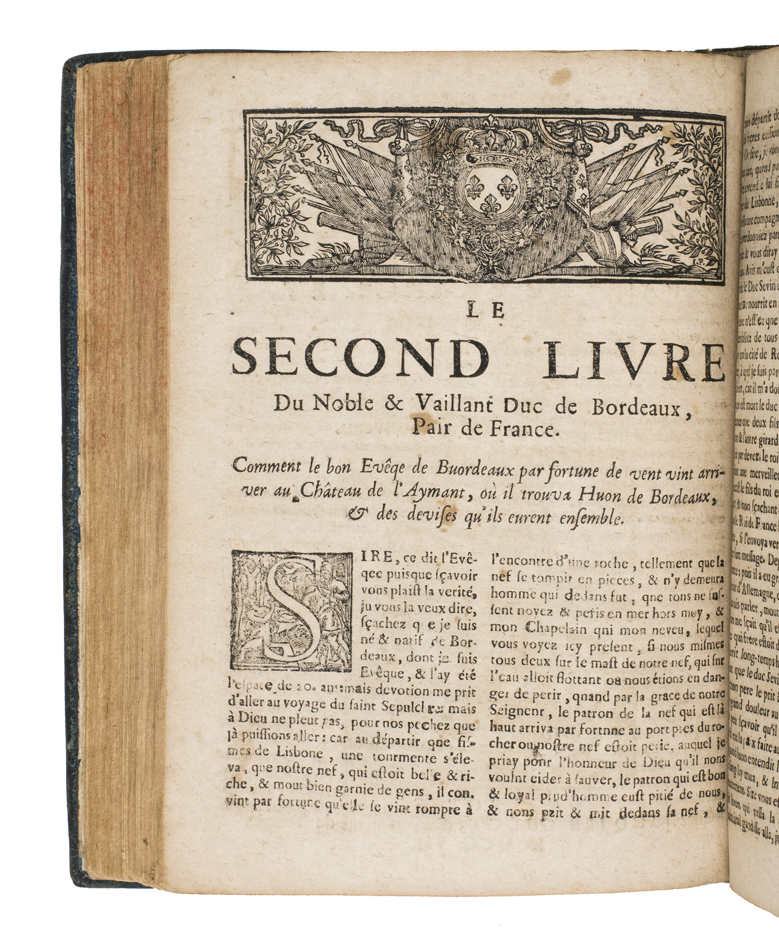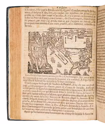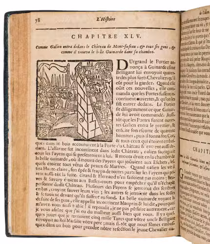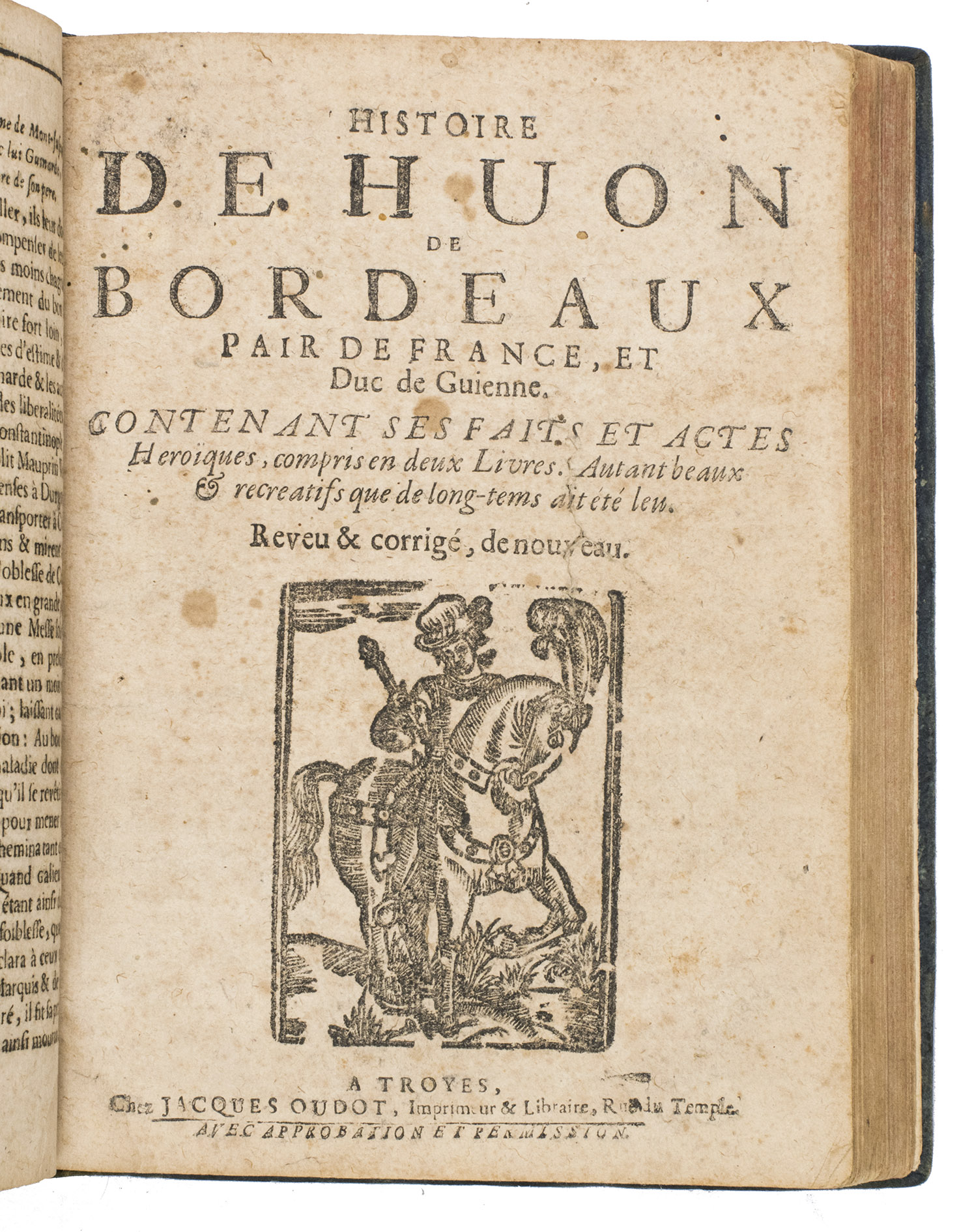 Troyes, Jacques Oudot, 1709. 2 works in 1 volume, the 2nd in 2 parts. 4to. With a woodcut vignette on the title page of each work, 35 woodcut illustrations in the text of ad 1; 2 woodcut headpieces and a woodcut tailpiece in ads 2 and 3. With: (2) [CHAPBOOK]. Histoire de Huon de Bordeaux, pair de France, et Duc de Guienne.