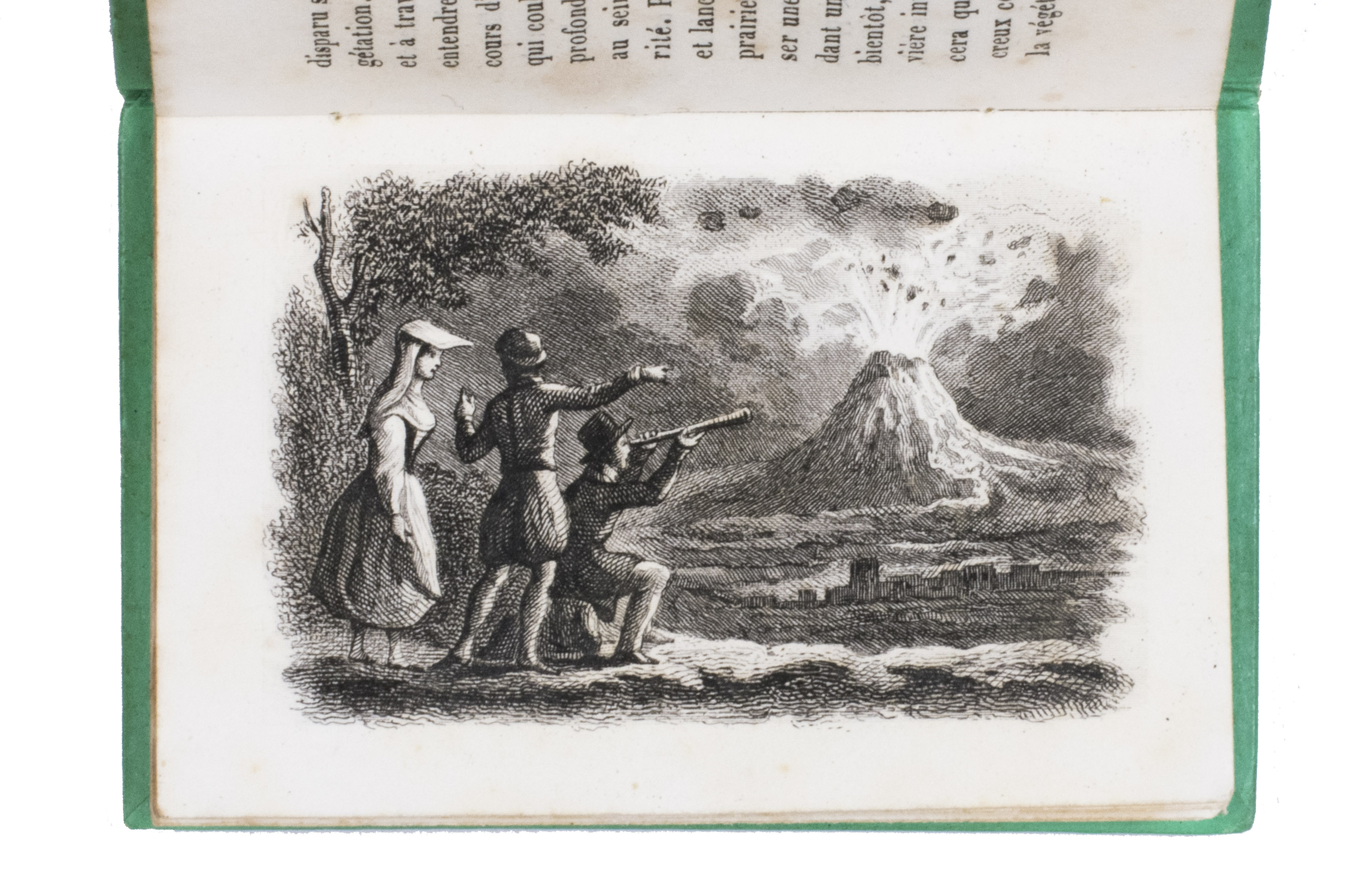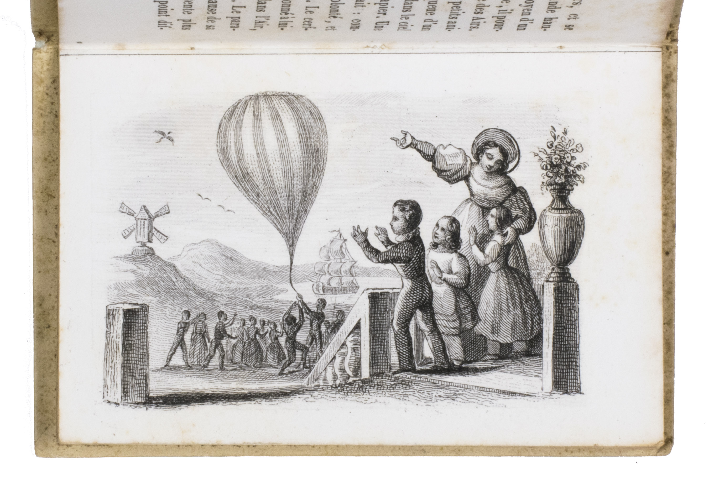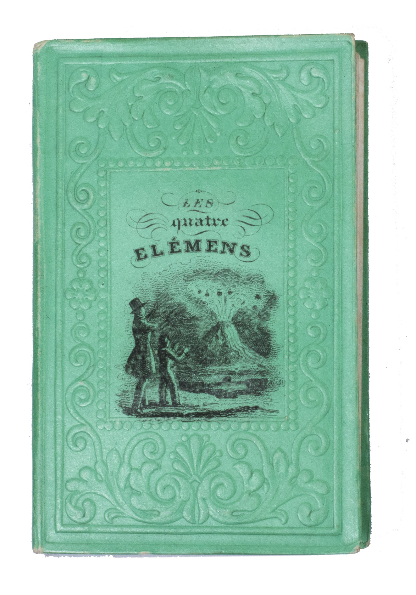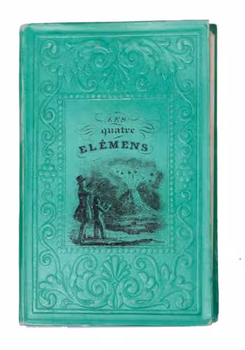 Charming set of children's miniature books with instructive reading about both the positive and negative aspects of each of the four elements: earth, air, water, and fire. Each volume focusses on one of the elements and includes two steel-engraved plates, showing the harvest and an earthquake for earth, a hot air balloon and a storm for air, a flood and children in a fishing boat for water, and a volcanic eruption and a burning house for fire. A detail of one of the plates in each volume is used for the illustration on the front board of that volume.