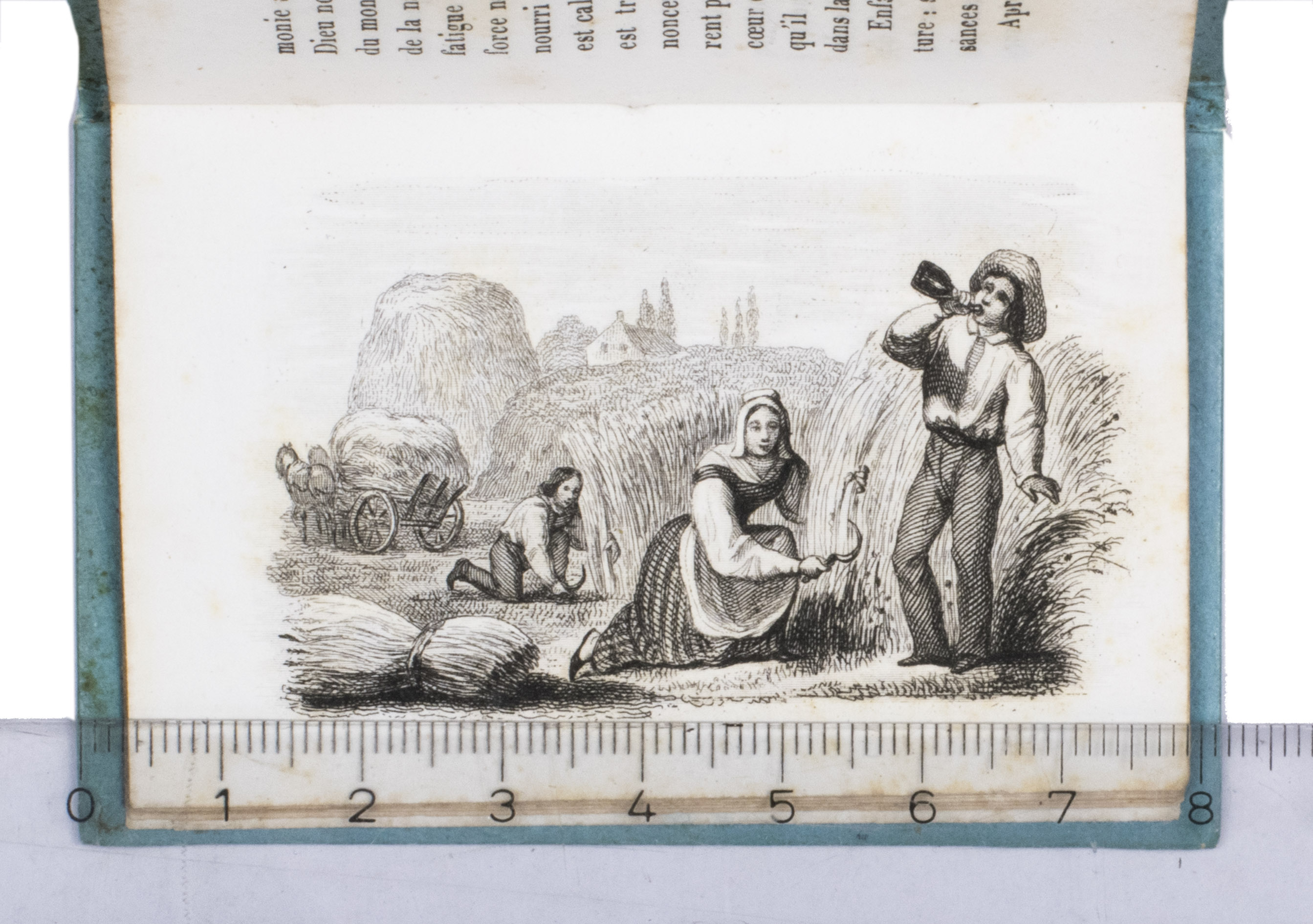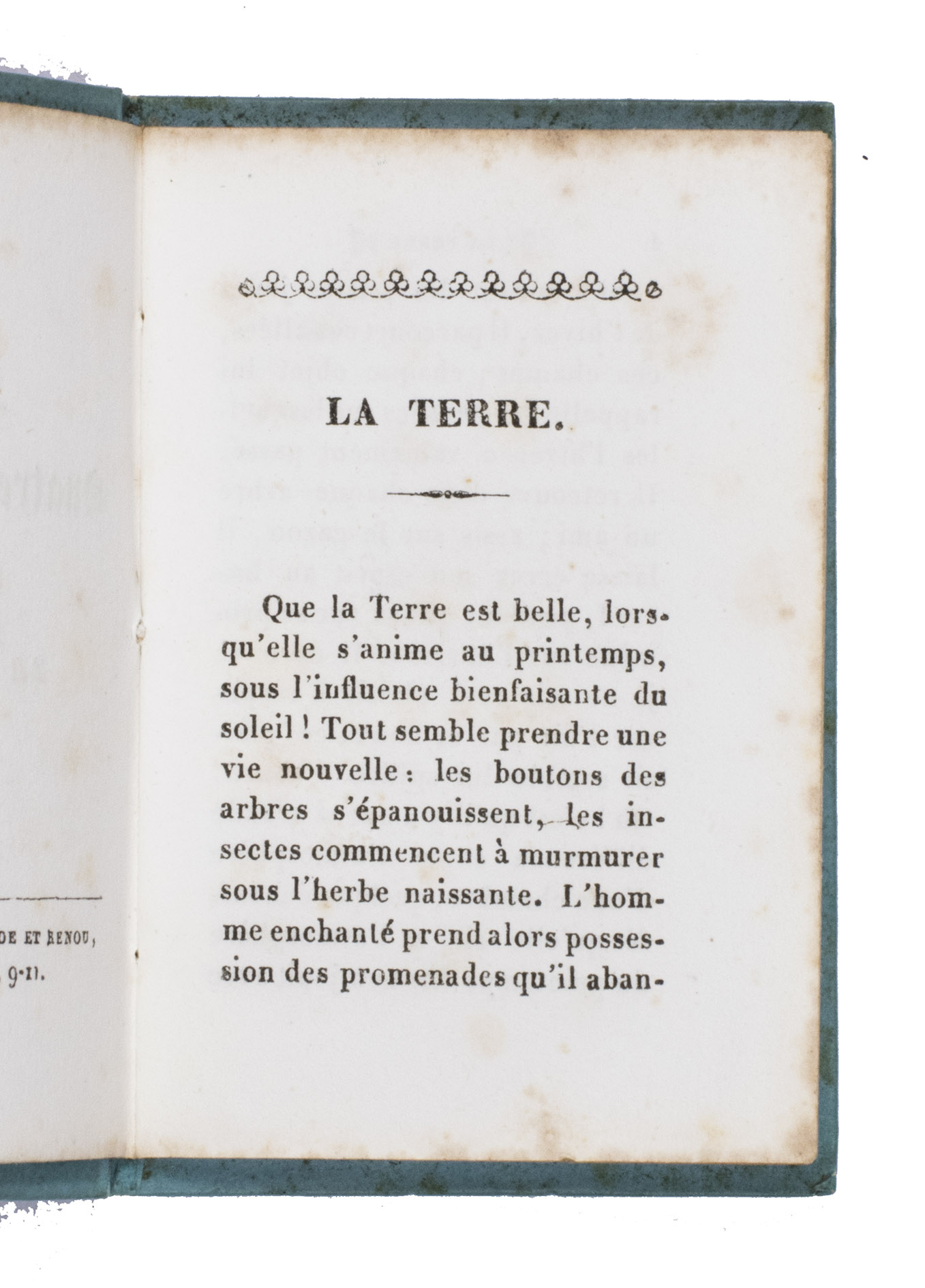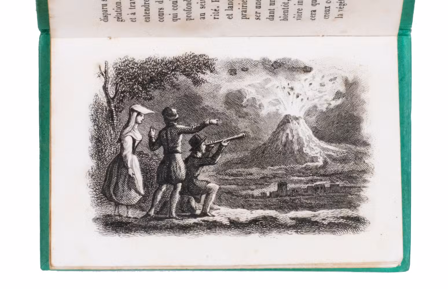 Charming set of children's miniature books with instructive reading about both the positive and negative aspects of each of the four elements: earth, air, water, and fire. Each volume focusses on one of the elements and includes two steel-engraved plates, showing the harvest and an earthquake for earth, a hot air balloon and a storm for air, a flood and children in a fishing boat for water, and a volcanic eruption and a burning house for fire. A detail of one of the plates in each volume is used for the illustration on the front board of that volume.
