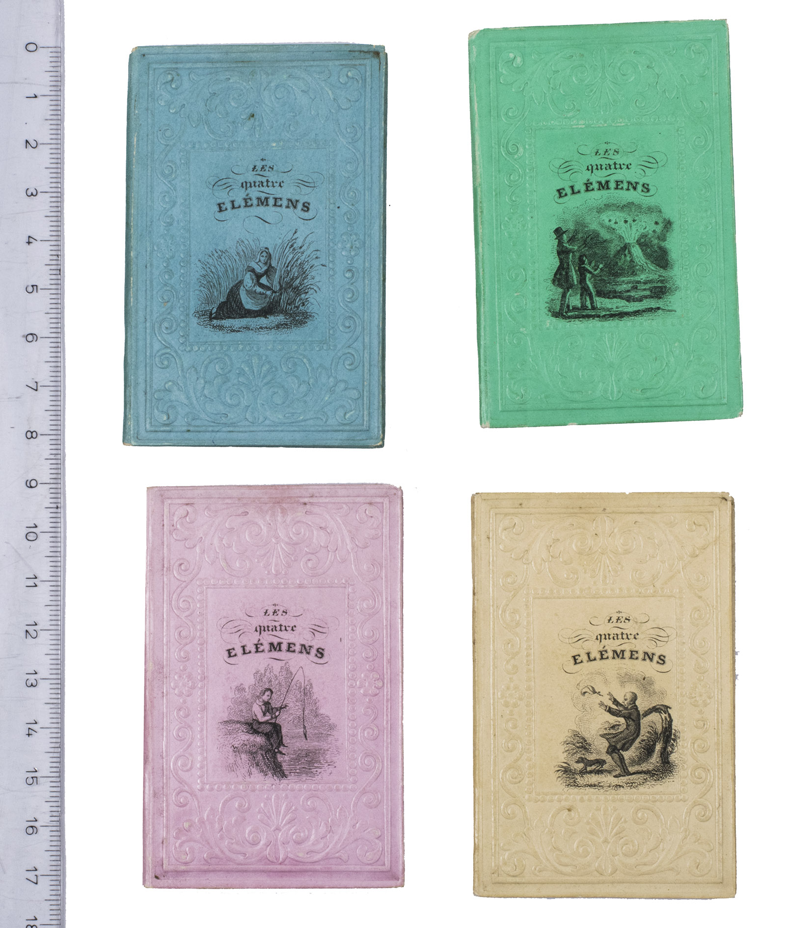 [Paris], Imprimerie de Maulde et Renou, [ca. 1840]. 4 volumes. 32mo. With 8 full-page steel-engraved plates (2 in each volume). Original publisher's glazed pastel boards (light blue, yellow, pink, or light green), with the title and a steel-engraved illustration of one of the four elements in the centre of the front board, within an embossed ornamental border. Each 24 pp.