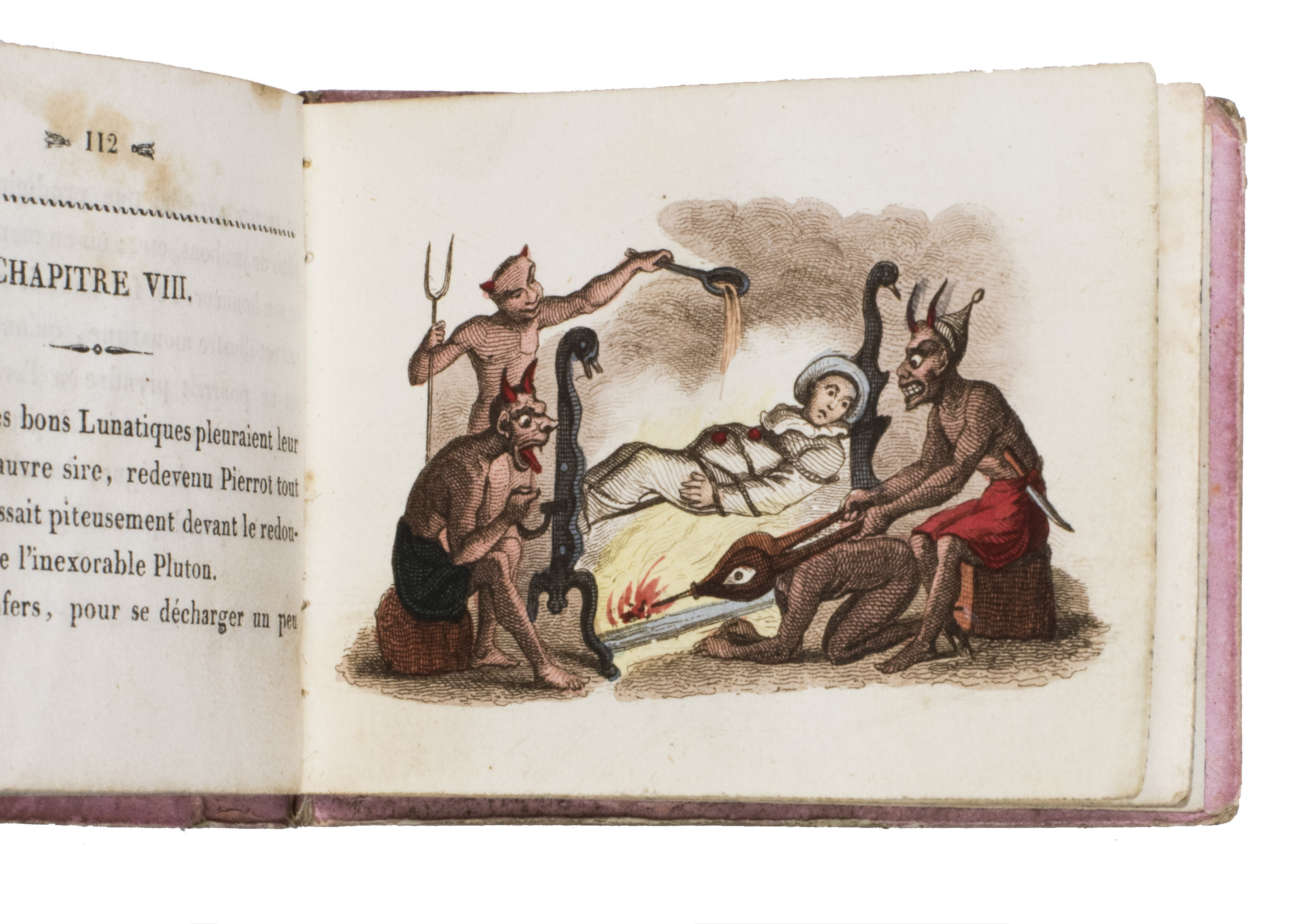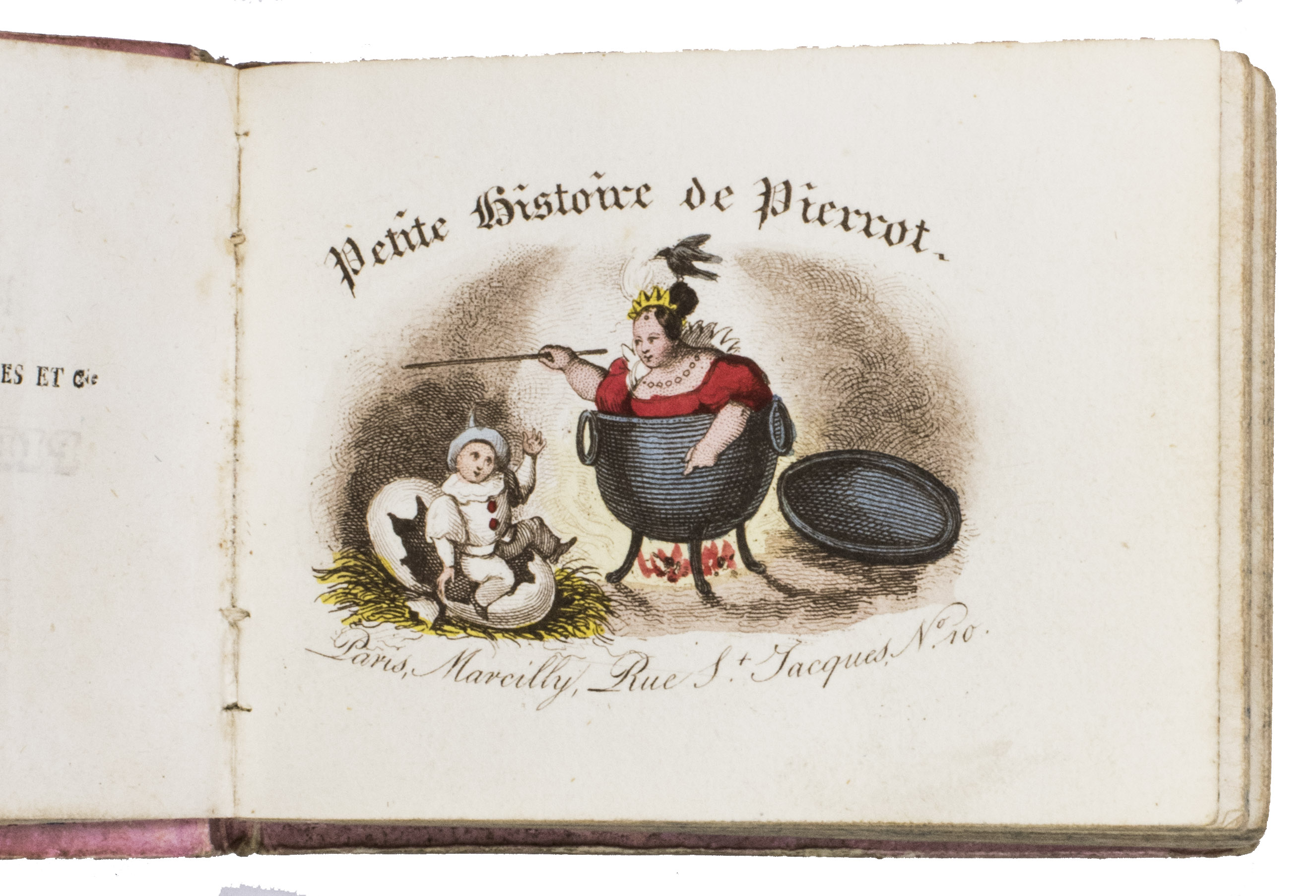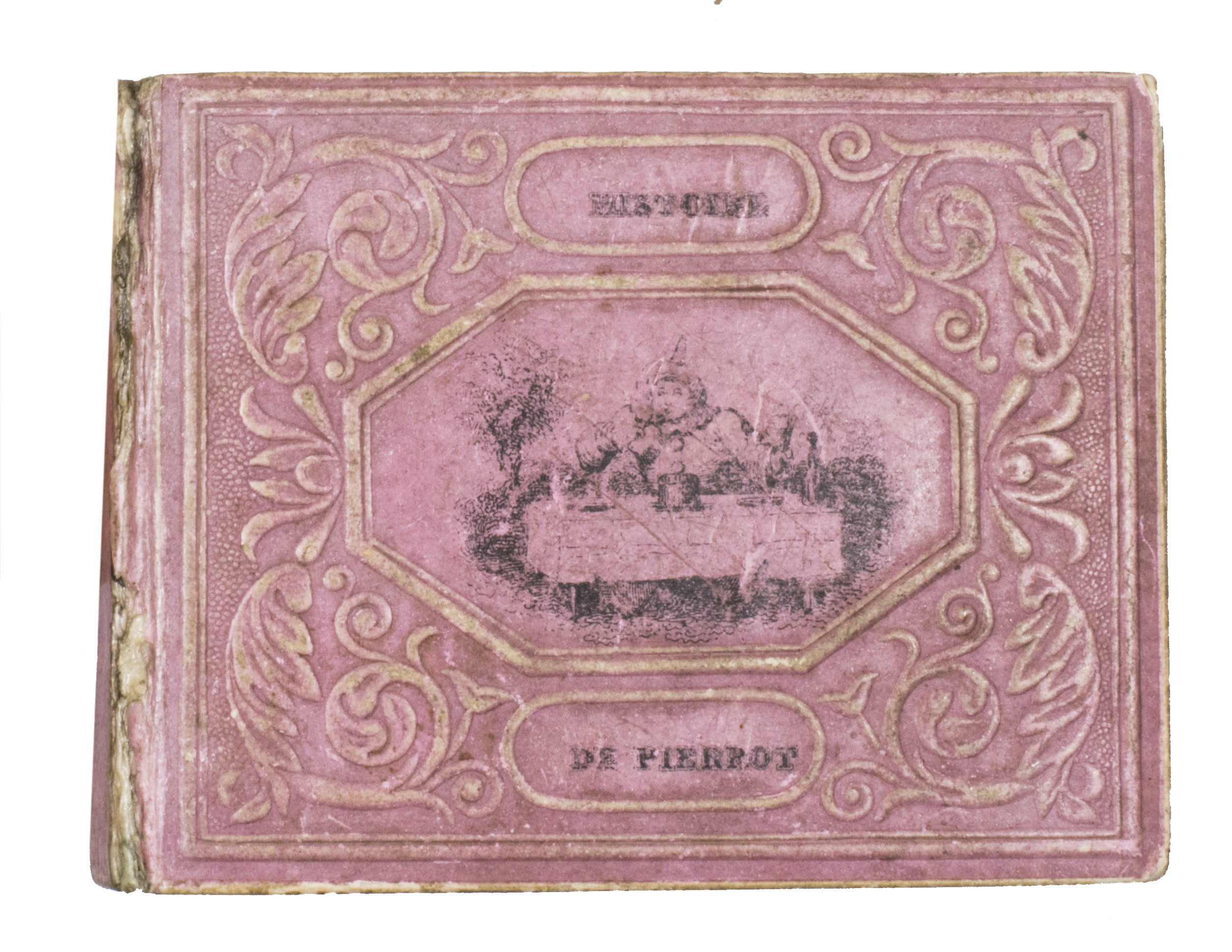 Paris, Marcilly, typographie de Firmin Didot frères et compagnie, [ca. 1835]. Oblong 32mo (ca. 5.6 x 7.3 cm). With a hand coloured engraved title, and 7 hand coloured full-page engraved plates. Contemporary publisher's pink boards, with the title on the front board, an illustration of Pierrot printed in the centre of the front board, surrounded by an ornamental embossed border, marbled edges. [4], 122, [2] pp.