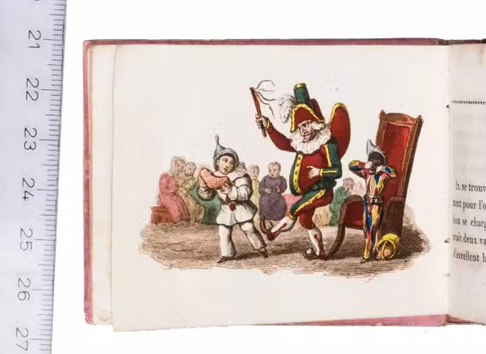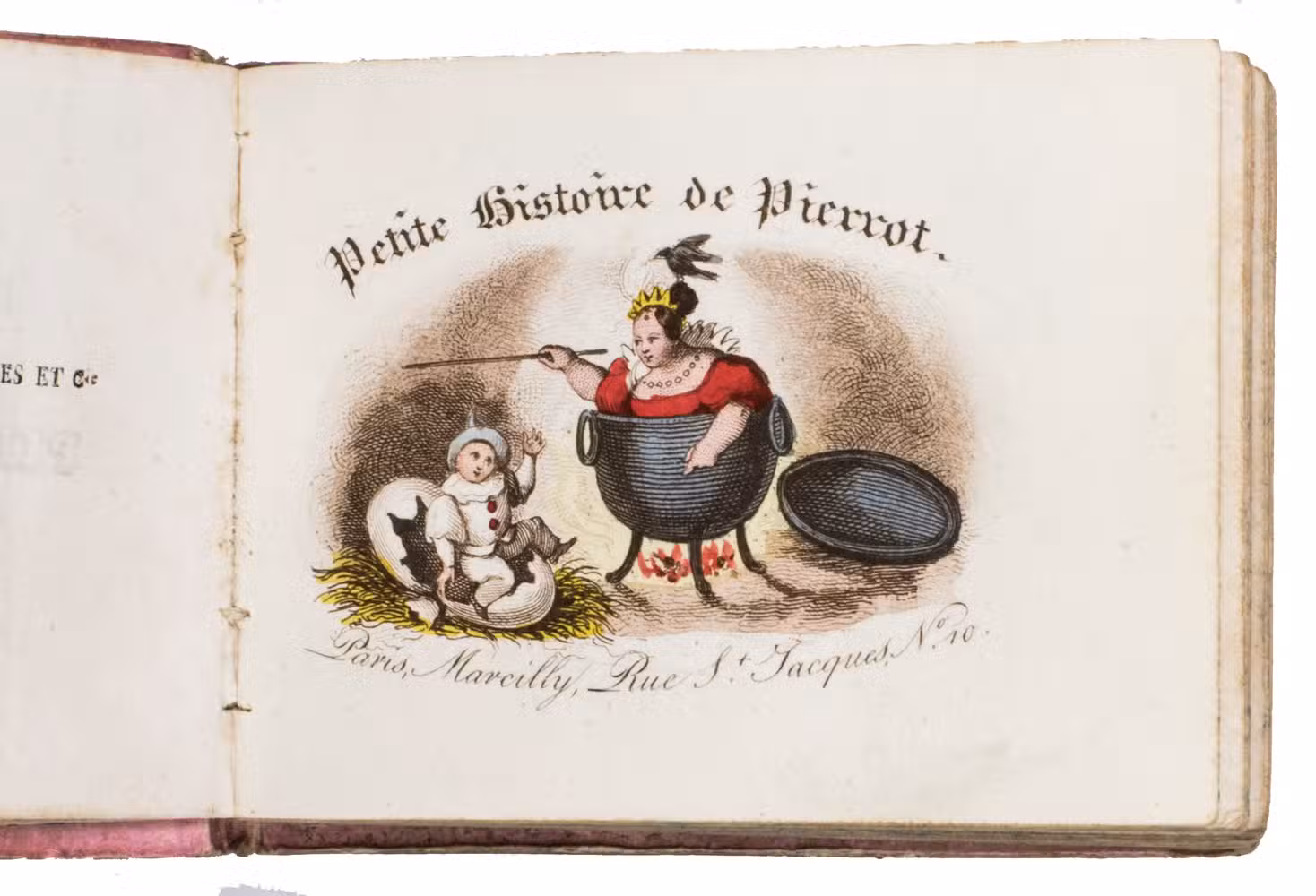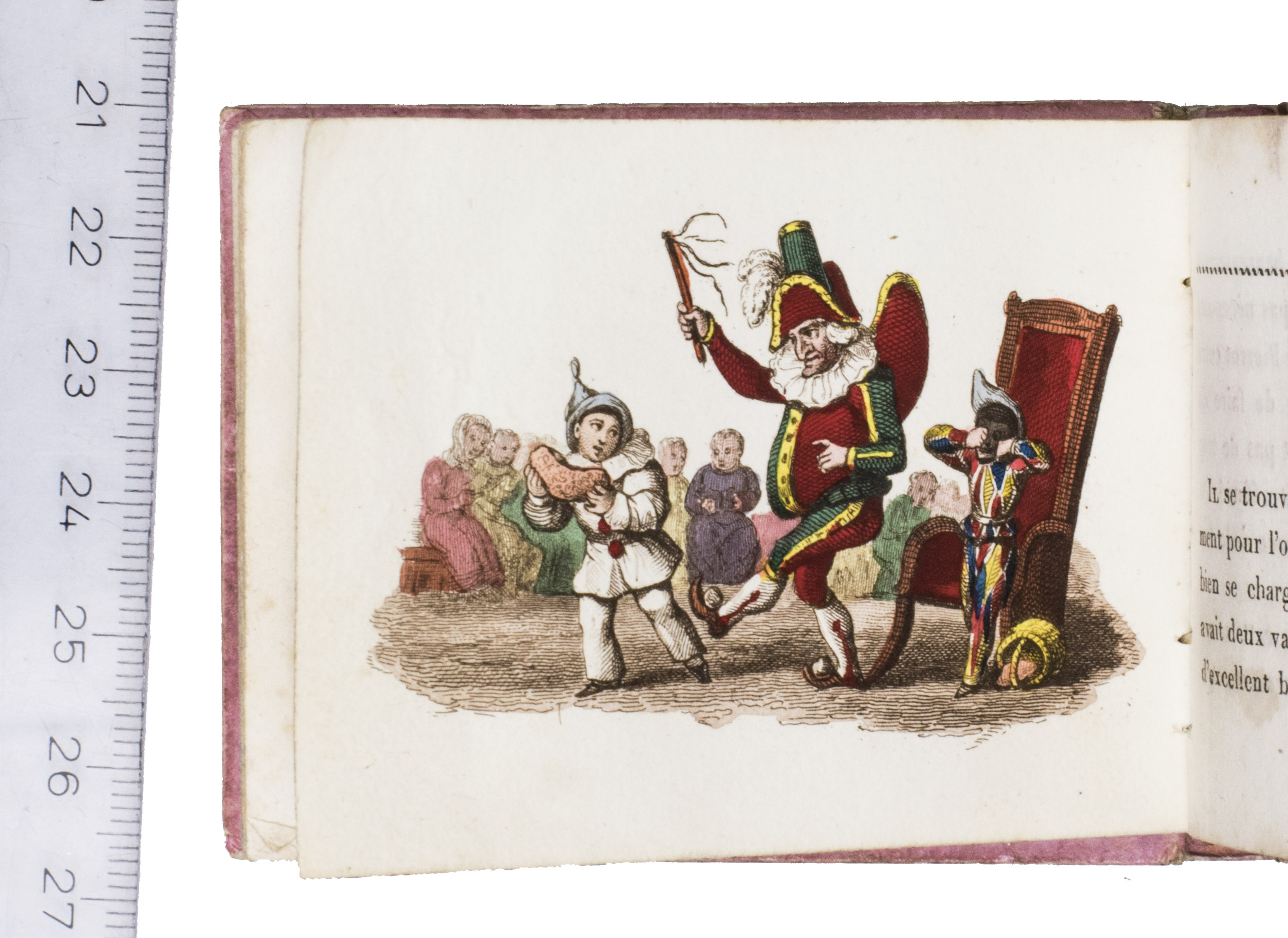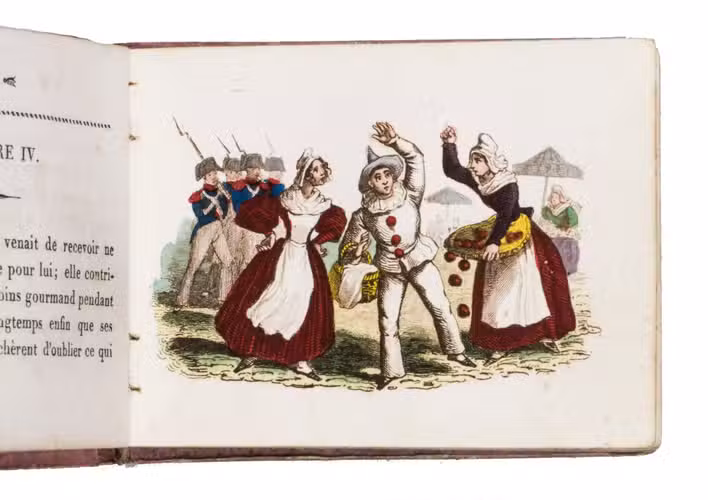 Paris, Marcilly, typographie de Firmin Didot frères et compagnie, [ca. 1835]. Oblong 32mo (ca. 5.6 x 7.3 cm). With a hand coloured engraved title, and 7 hand coloured full-page engraved plates. Contemporary publisher's pink boards, with the title on the front board, an illustration of Pierrot printed in the centre of the front board, surrounded by an ornamental embossed border, marbled edges. [4], 122, [2] pp.
