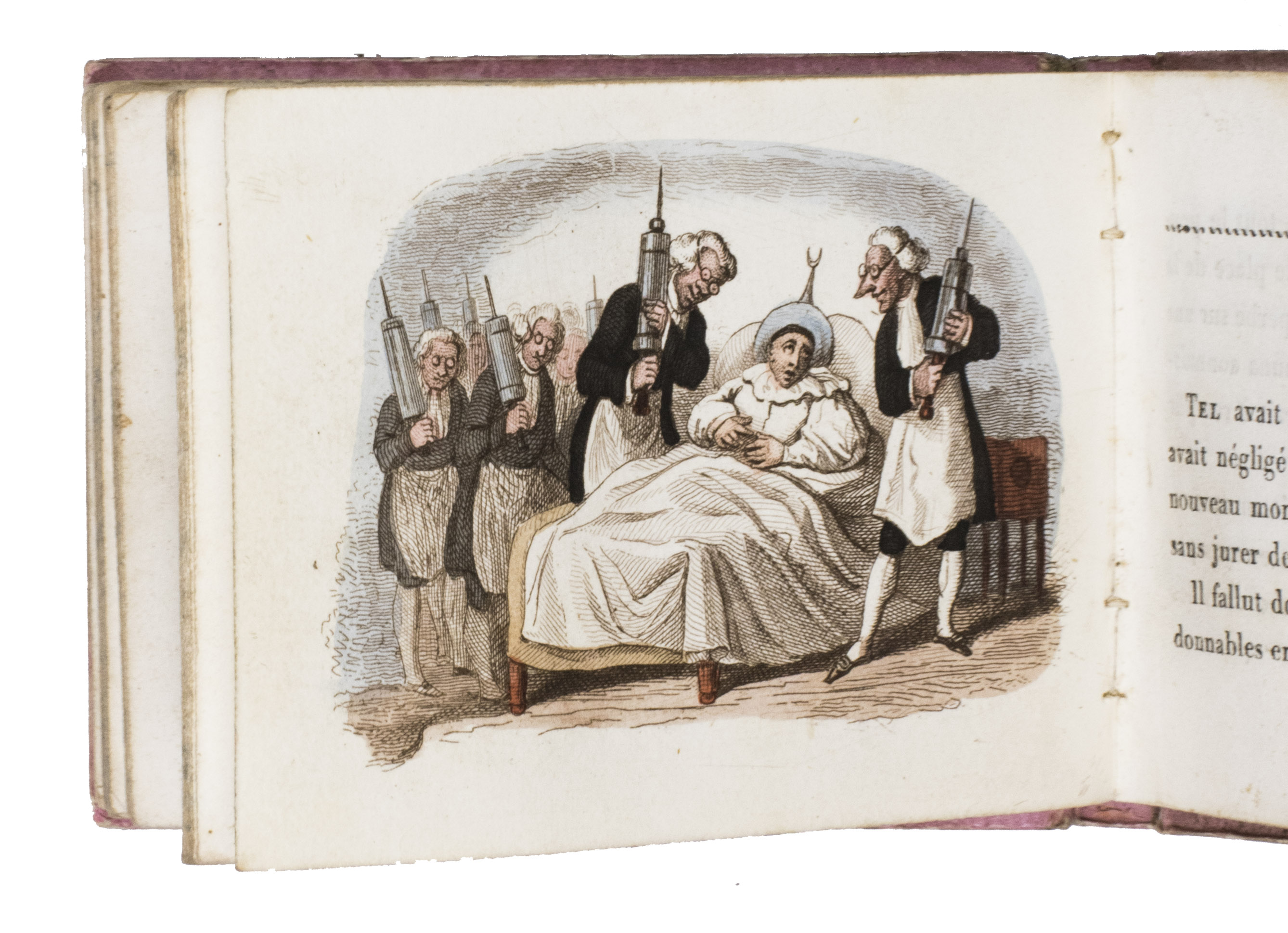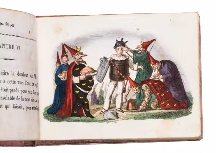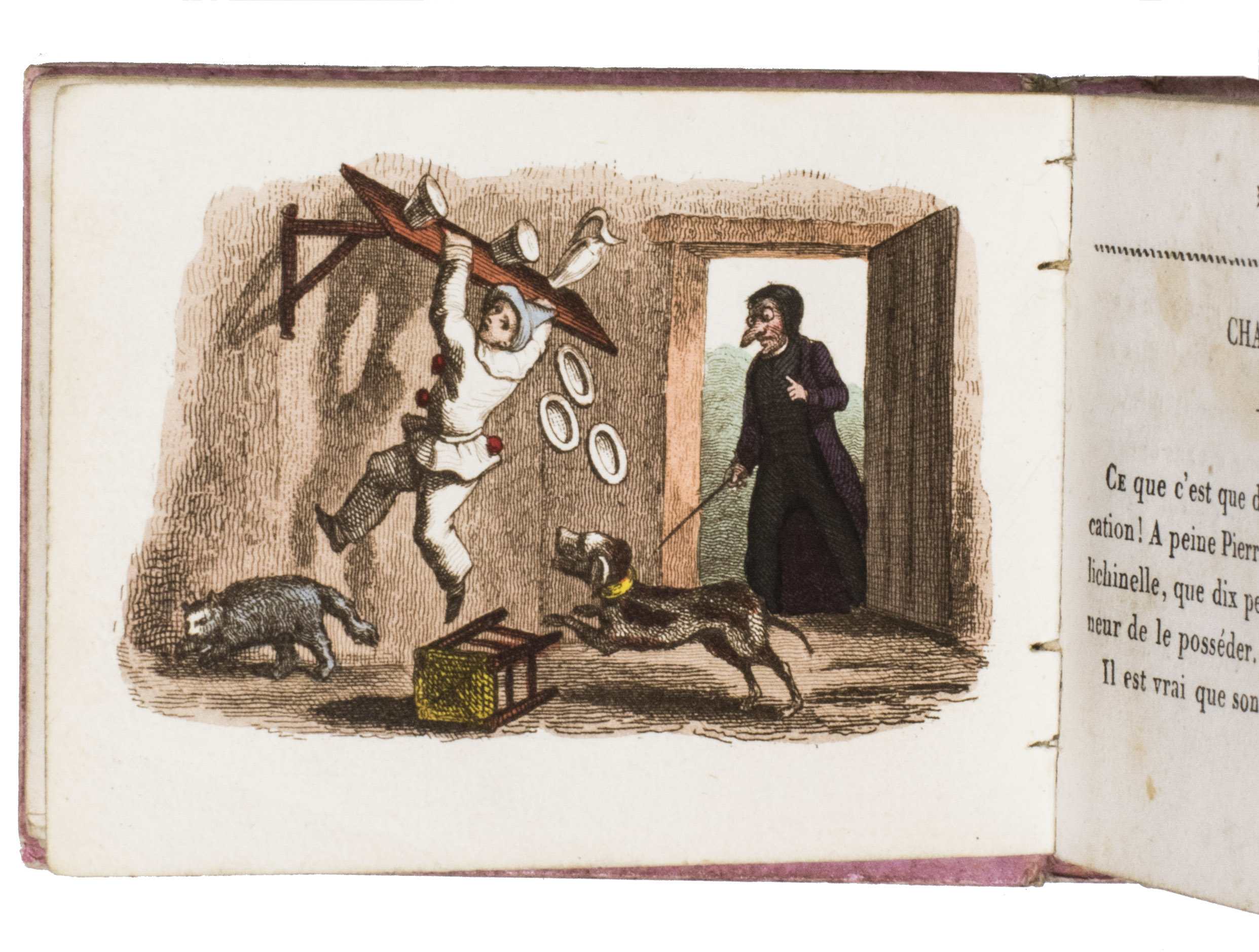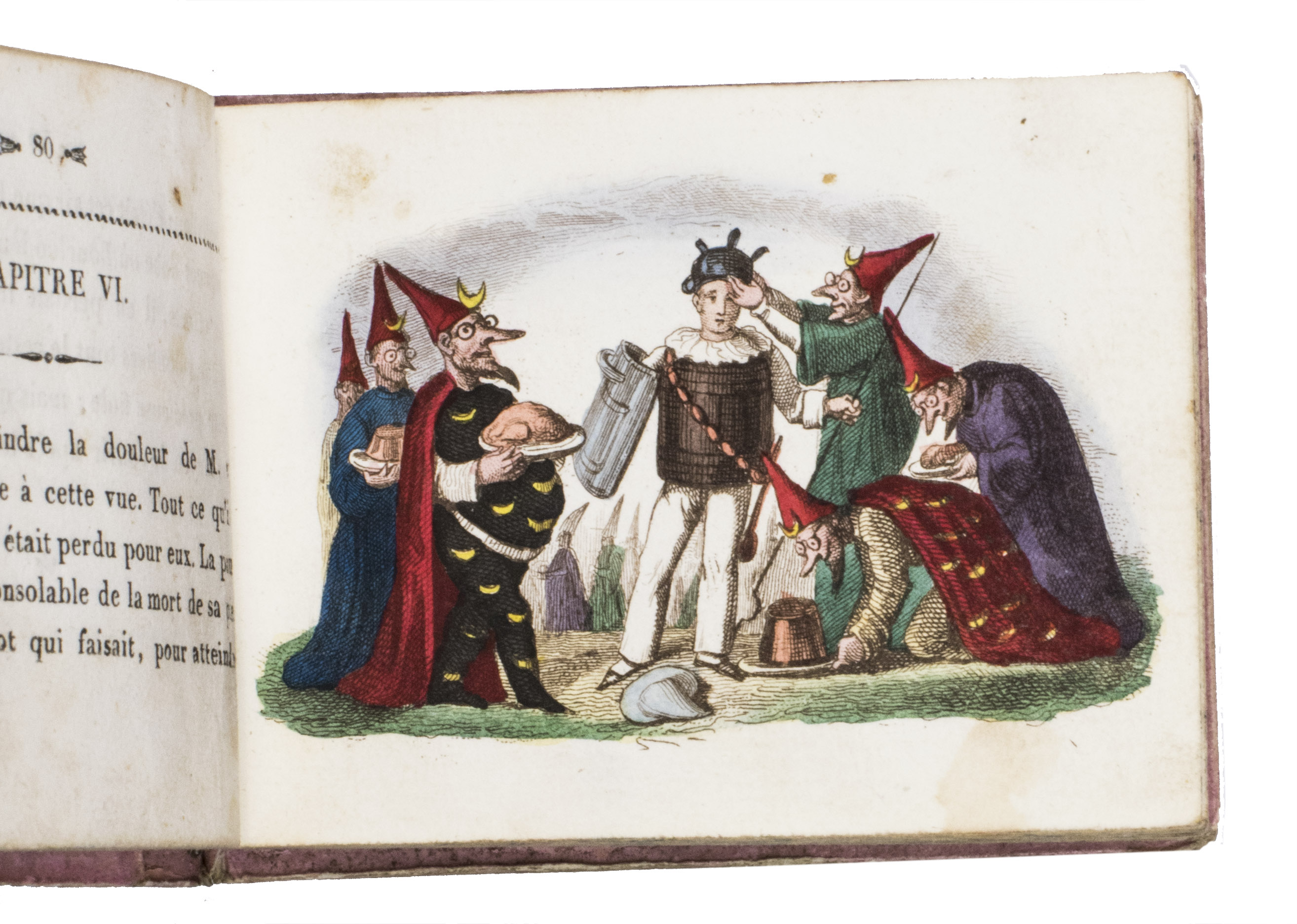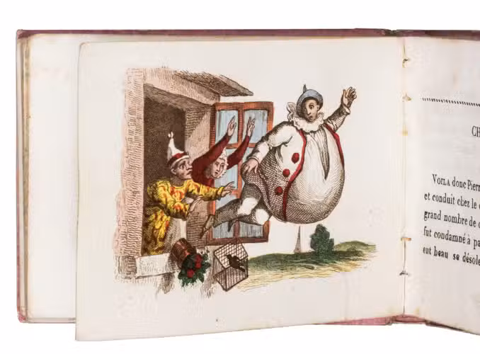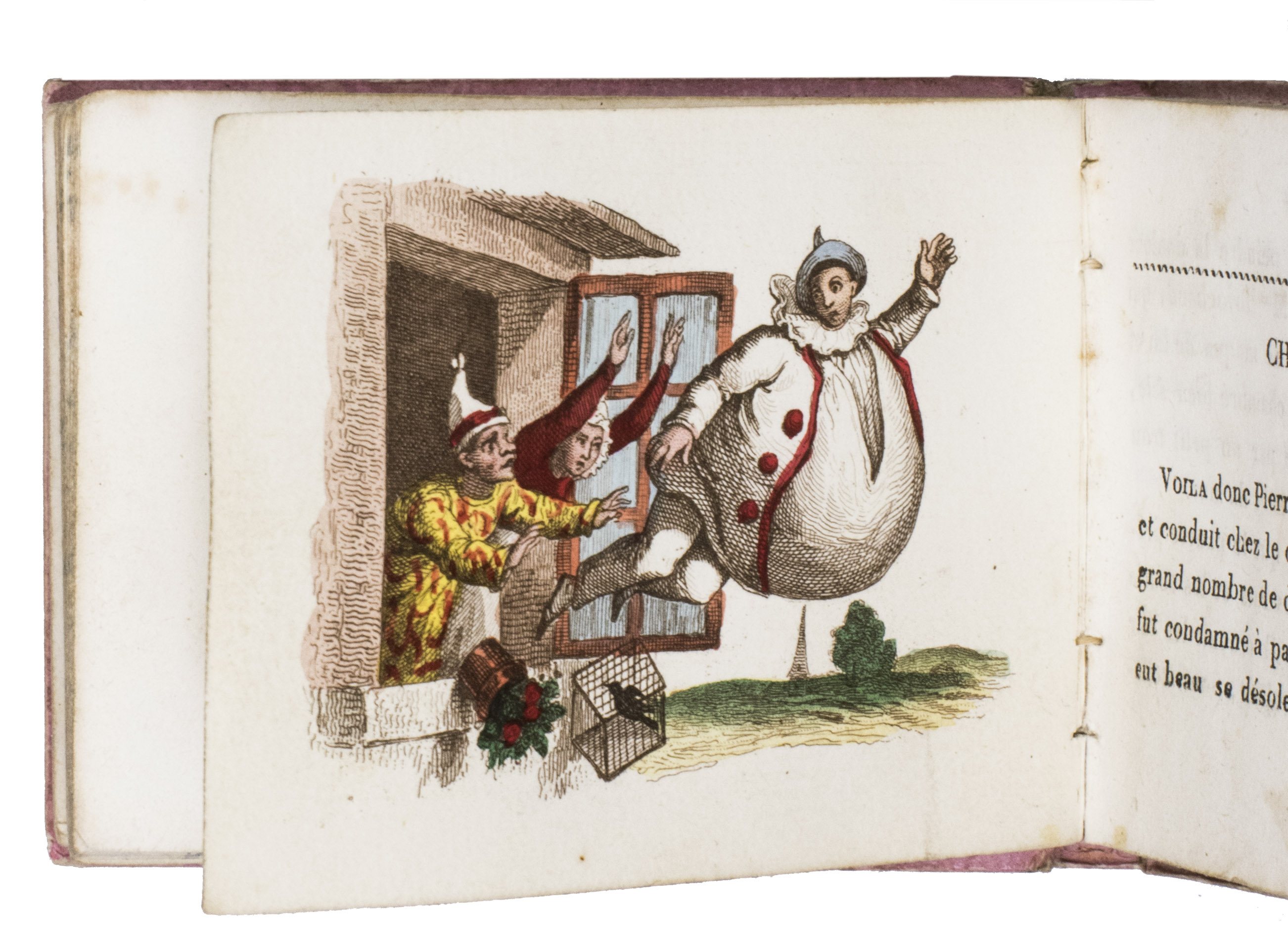 Charming children's miniature book with a moralistic story on the absurd adventures of the gluttonous boy Pierrot, who was born from a turkey's egg. Illustrated with lively hand coloured engravings, the work, divided in 8 chapters, tells the story of how Pierrot cheats, steals, and lies to satisfy his desires, until he meets his untimely, gruesome end. Despite this, the work has been described as "exceptionally lively and amusing" (Bondy), and is fairly rare.