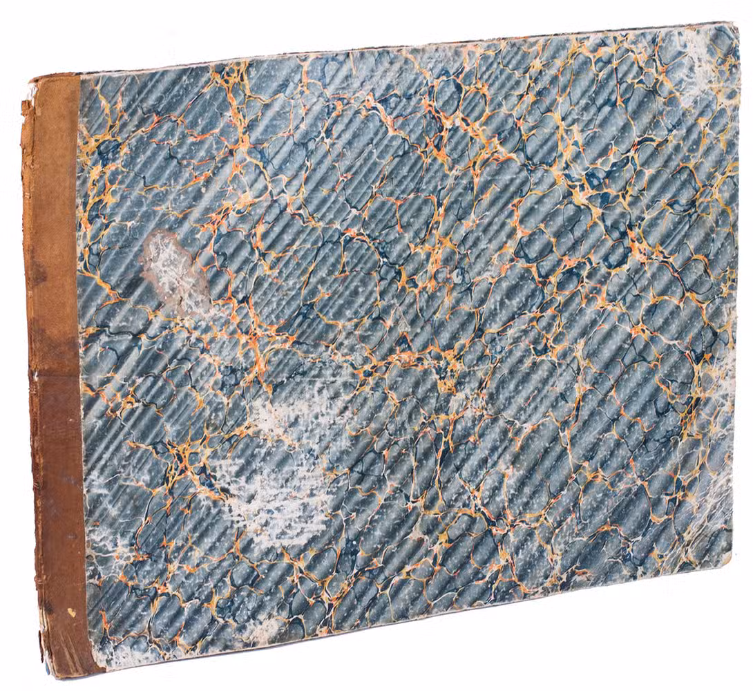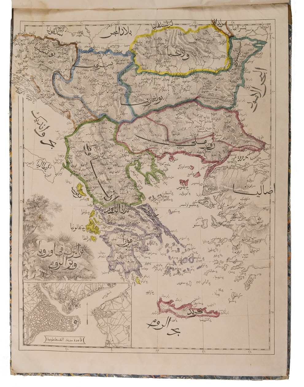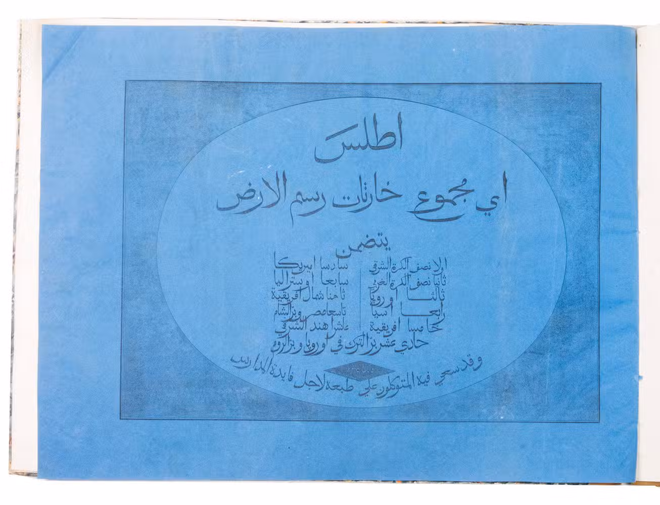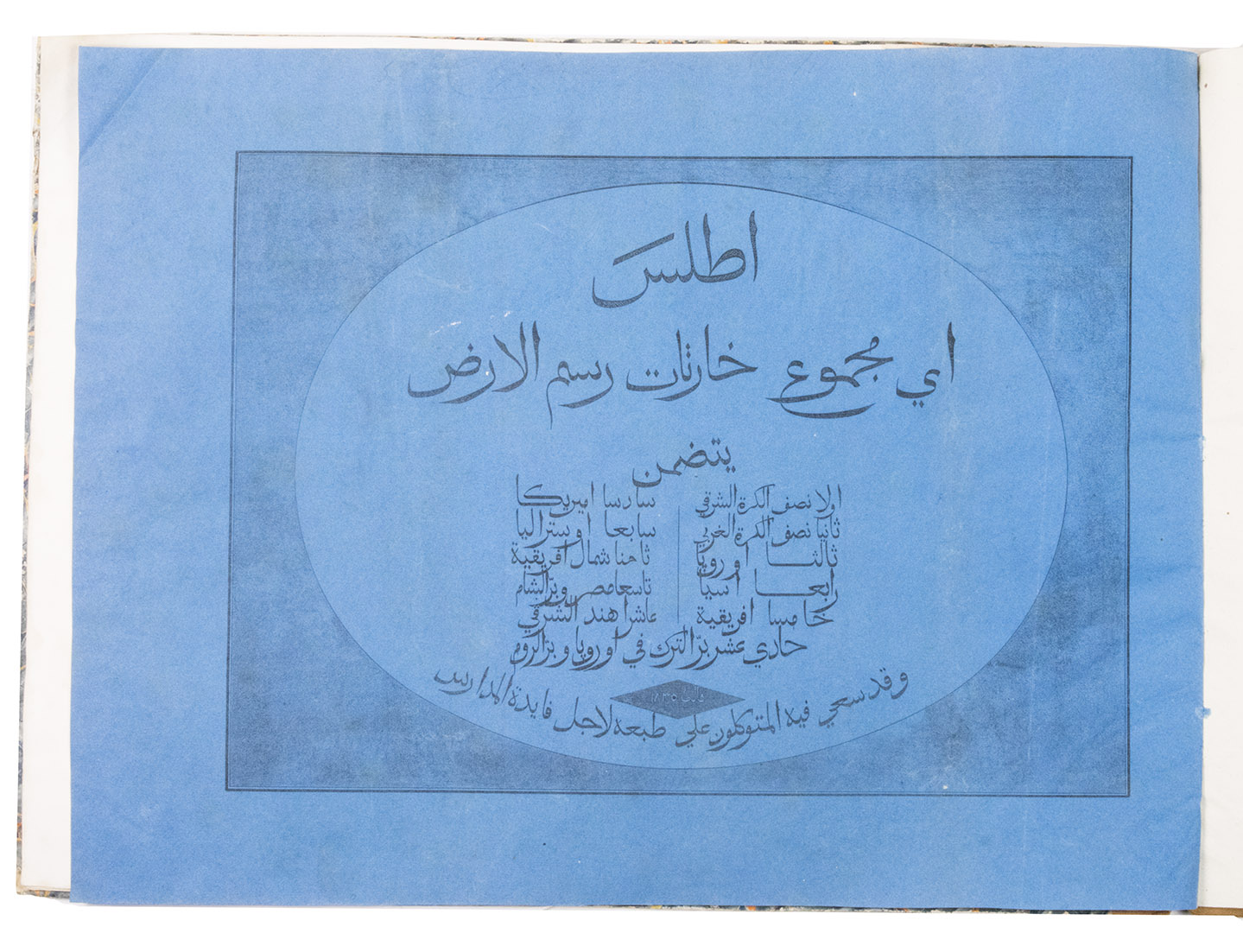 [Malta, Church Missionary Society Press, 1835 CE]. Oblong folio (41 × 30.8 cm). Arabic title page on blue dyed paper; 11 leaves of maps with hand-coloured outlines (complete). Arabic text lithographically printed in a muaqqaq style, closely resembling that of Mamluk era Egyptian or Syrian areas. Original half calf binding, blank endpapers.