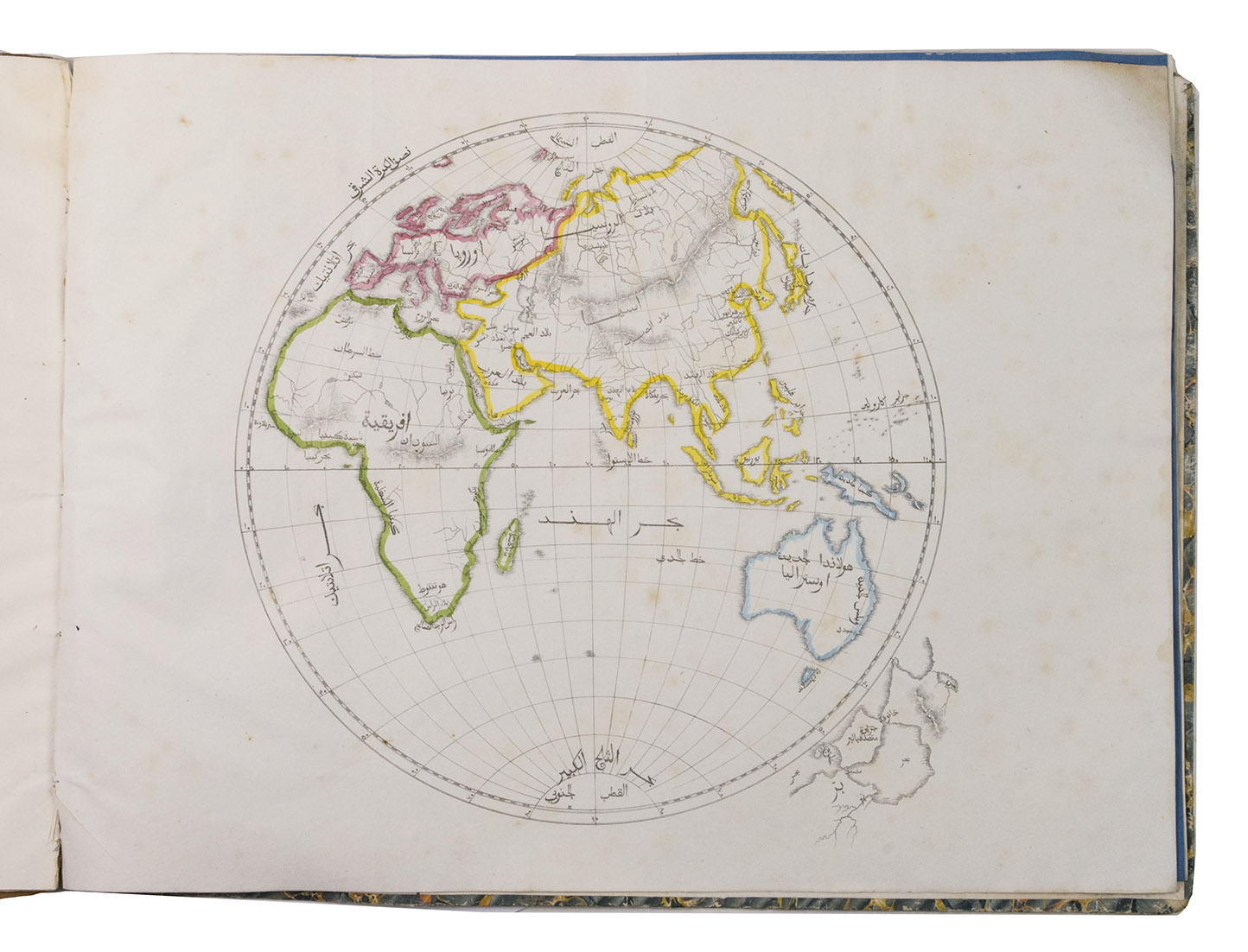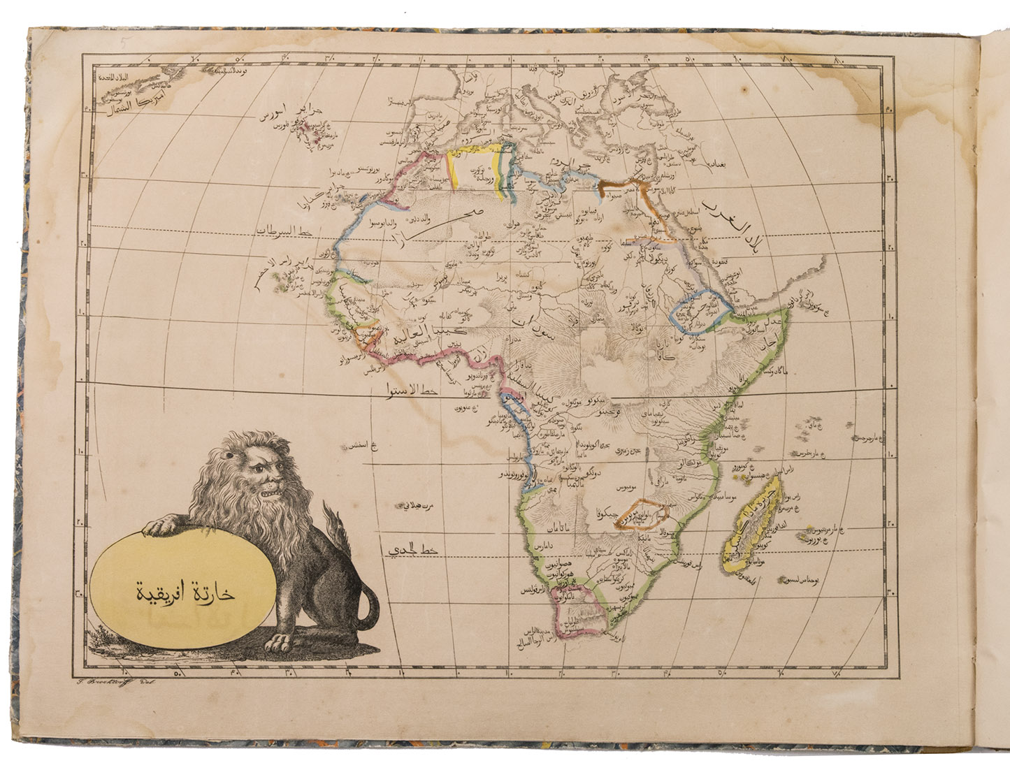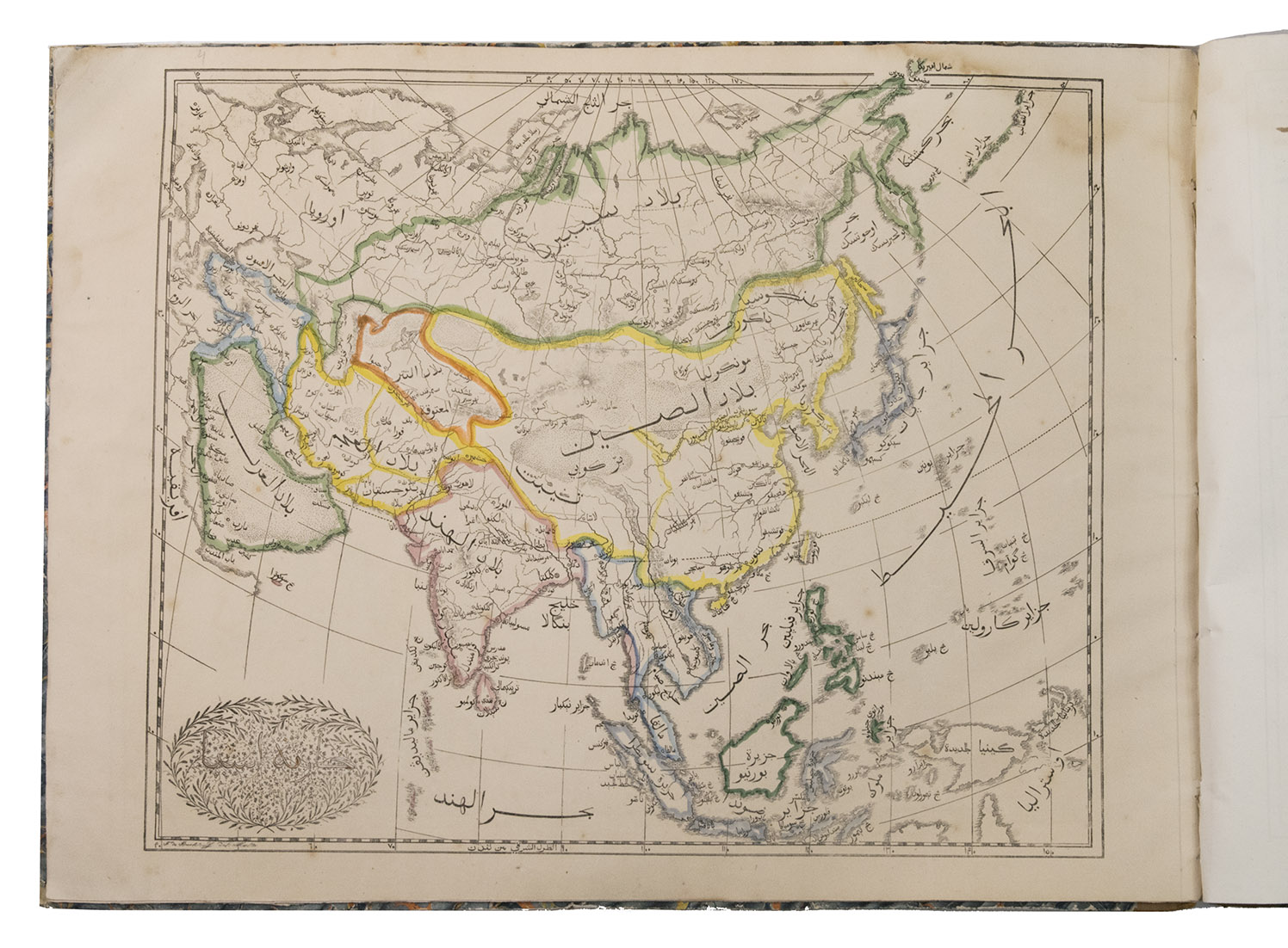 The first obtainable Arabic printed atlas, completely lithographed on European watermarked paper, published by the English Church Missionary Society. This is the second, improved and enlarged edition of a world atlas that had first been issued by the same press two years earlier, which is today considered unobtainable.