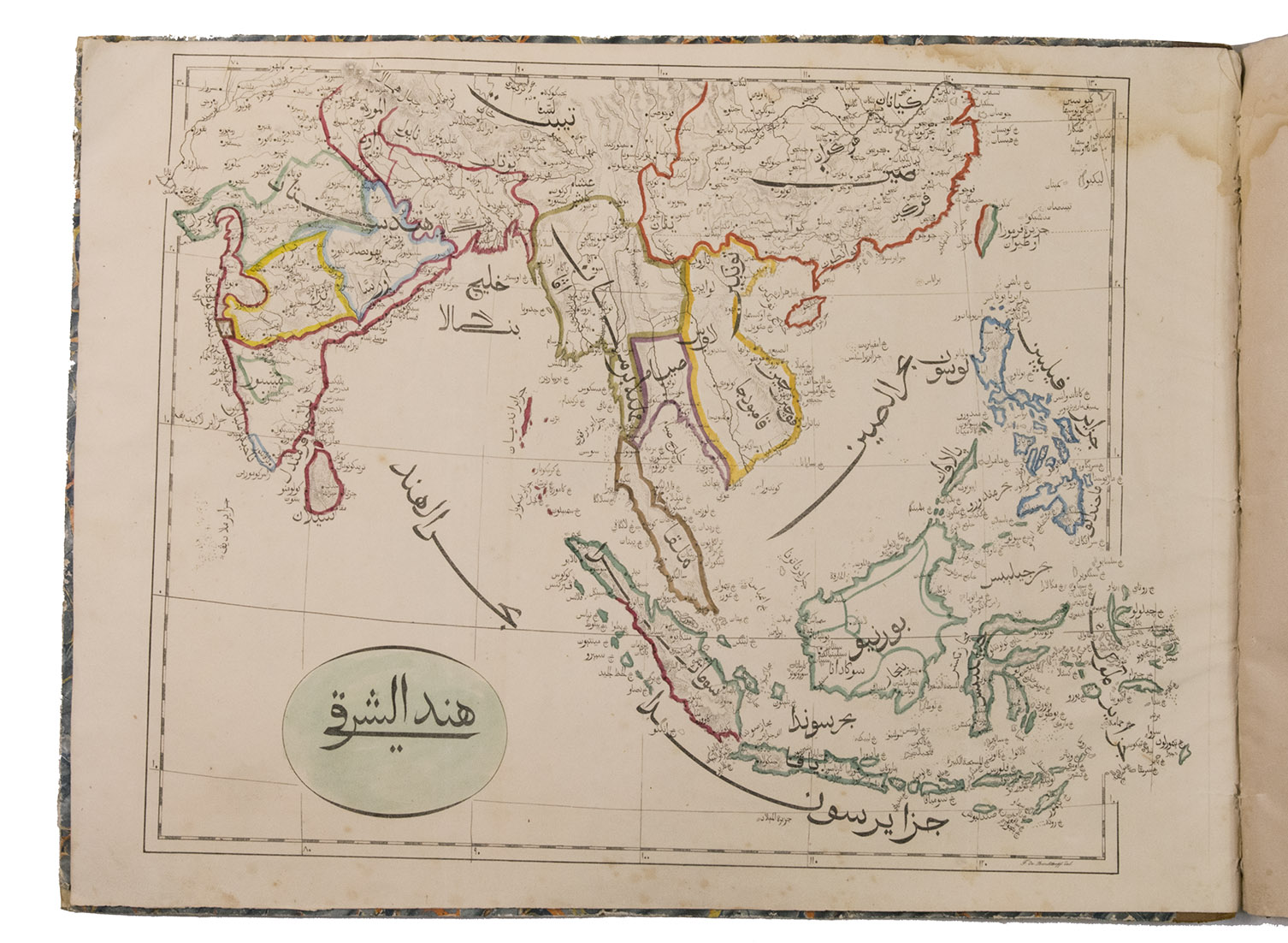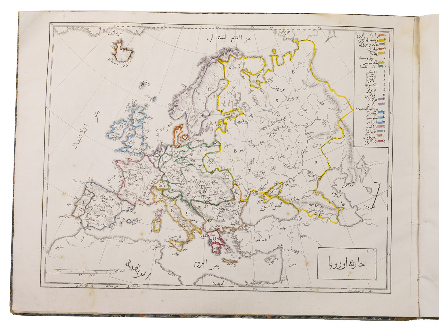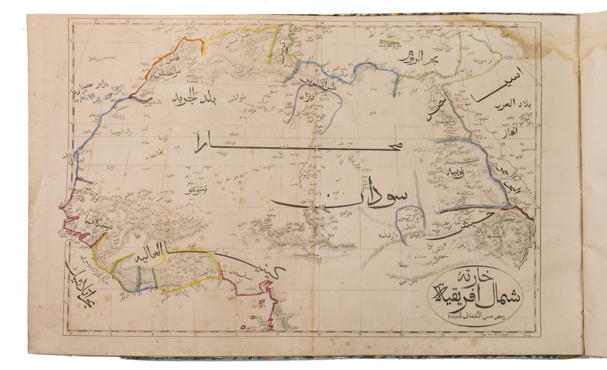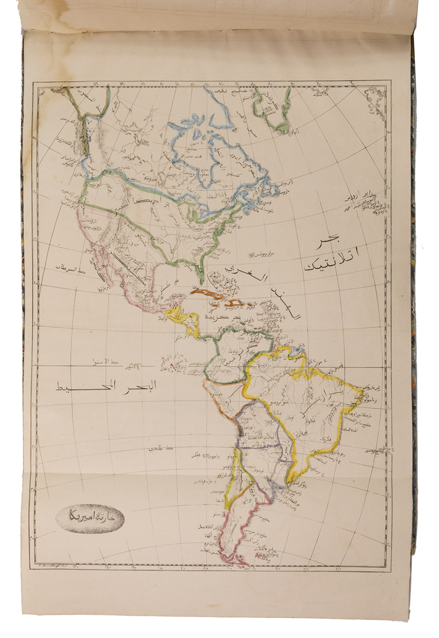 The first obtainable Arabic printed atlas, completely lithographed on European watermarked paper, published by the English Church Missionary Society. This is the second, improved and enlarged edition of a world atlas that had first been issued by the same press two years earlier, which is today considered unobtainable.