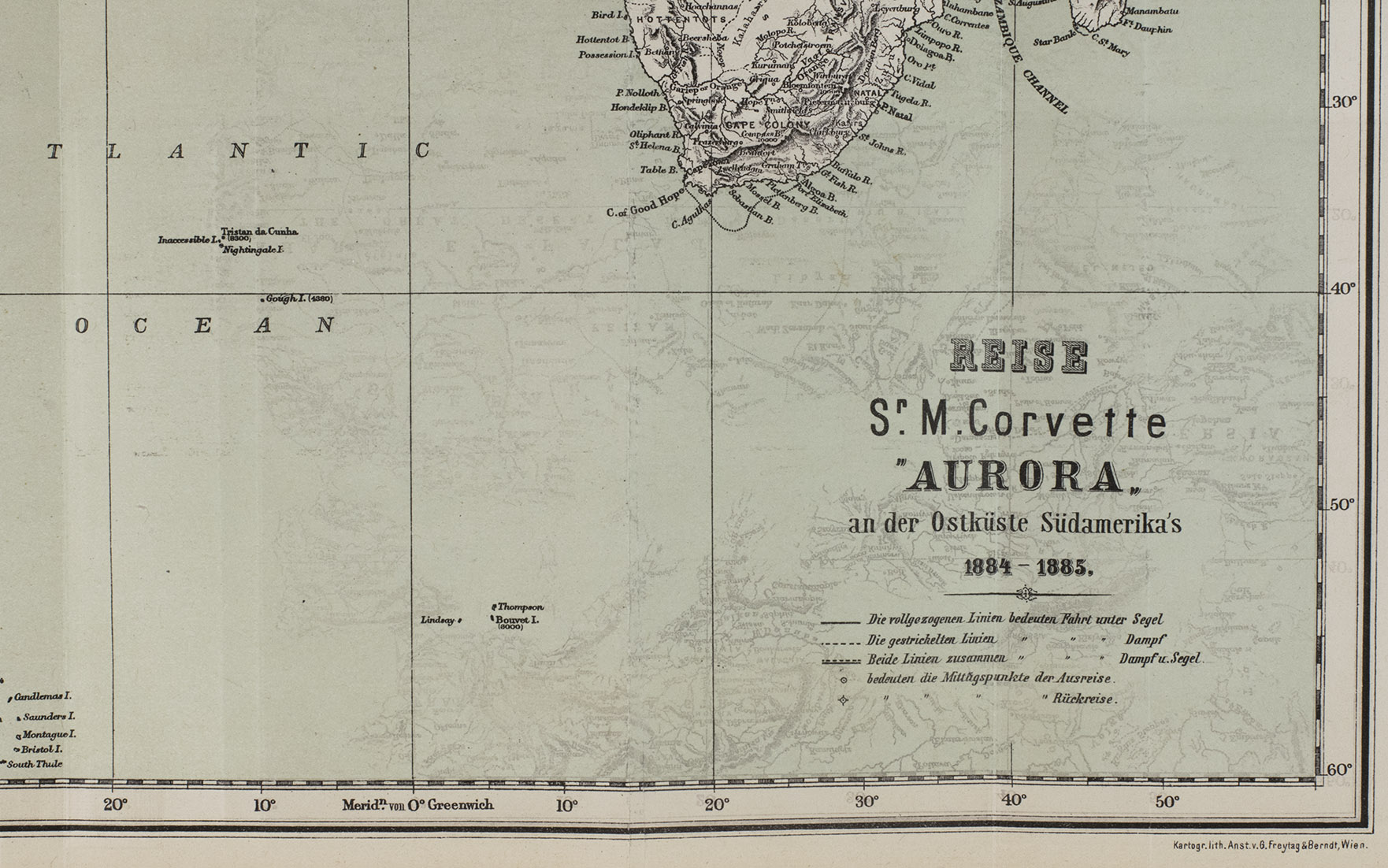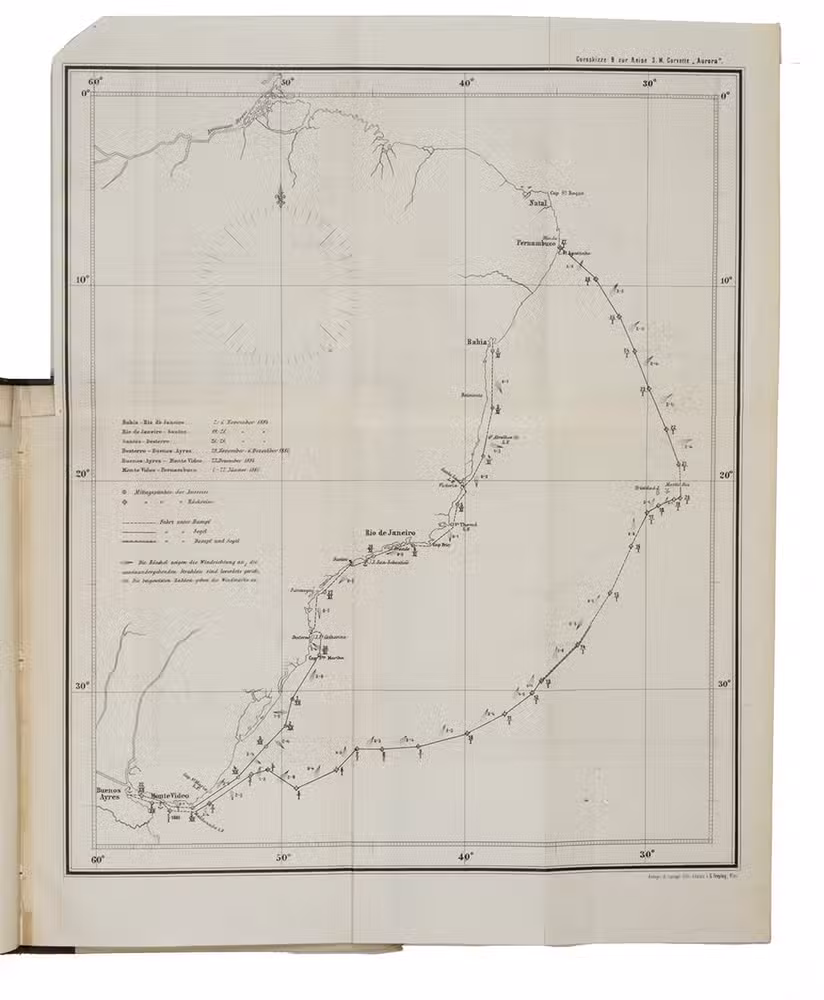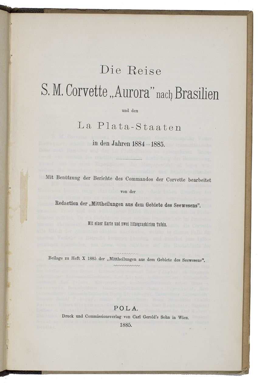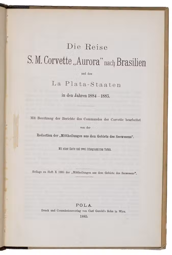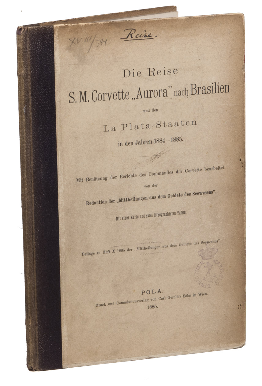 Die Reis S.M. Corvette "Aurora" was published separately and as an appendix to volume 10 of the hydrographical journal of the Austrian-Hungarian Navy, Mittheilungen aus dem Gebiete des Seewesens. Altogether a highly interesting official record of the Austro-Hungarian circumnavigation of the globe via Brazil and the Río de la Plata basin, and a great source of information for the Austro-Hungarian navys (trading) expeditions to this region.