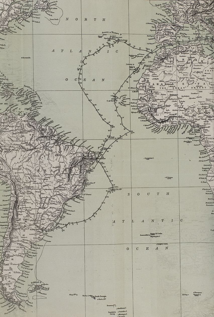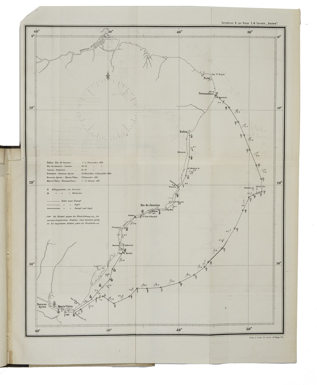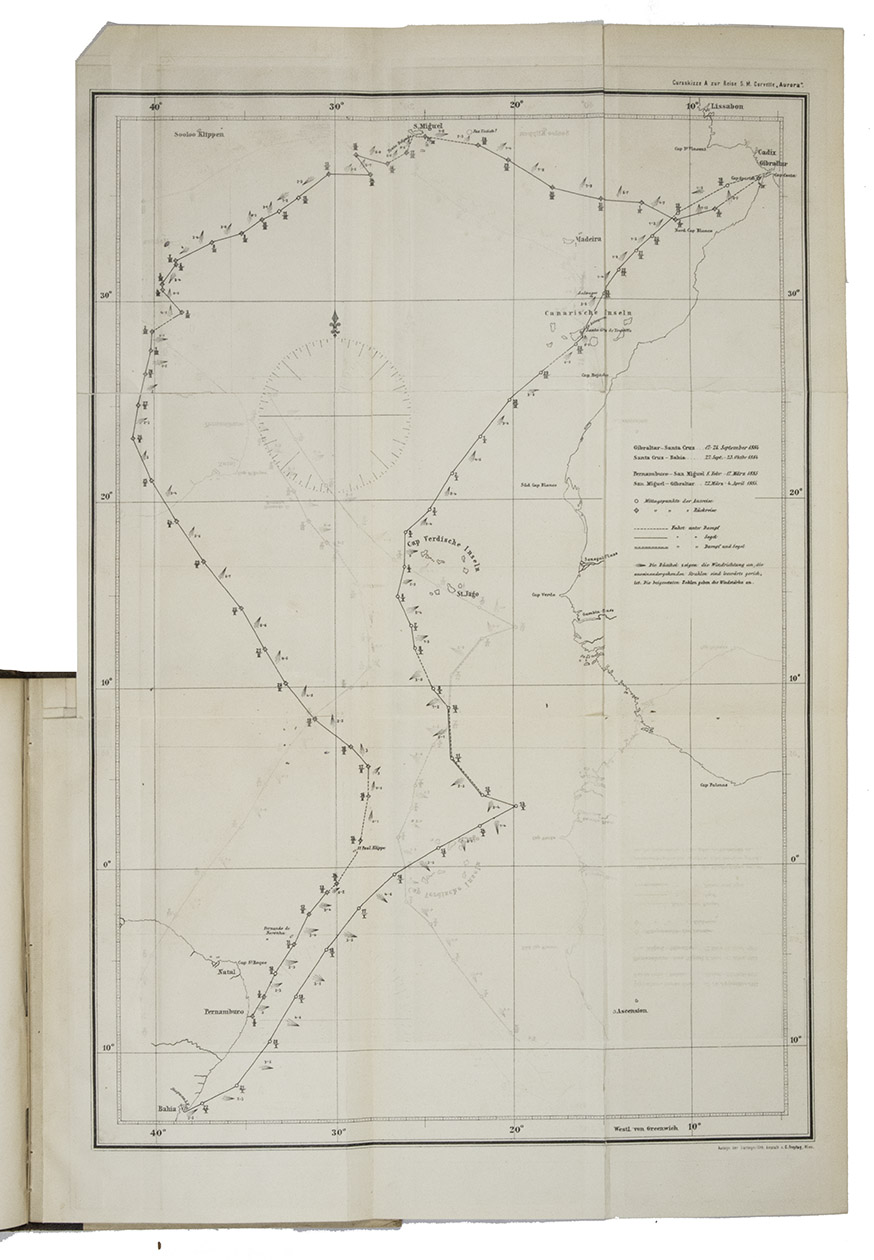 Vienna, Carl Gerold's Sohn, 1885. Large 8vo. With 3 lithographed folding maps (one coloured) showing the route of His Majesty's Ship Aurora along the east coast of South America. Contemporary half brown cloth with the original publisher's printed wrappers mounted on the boards. 56 pp.