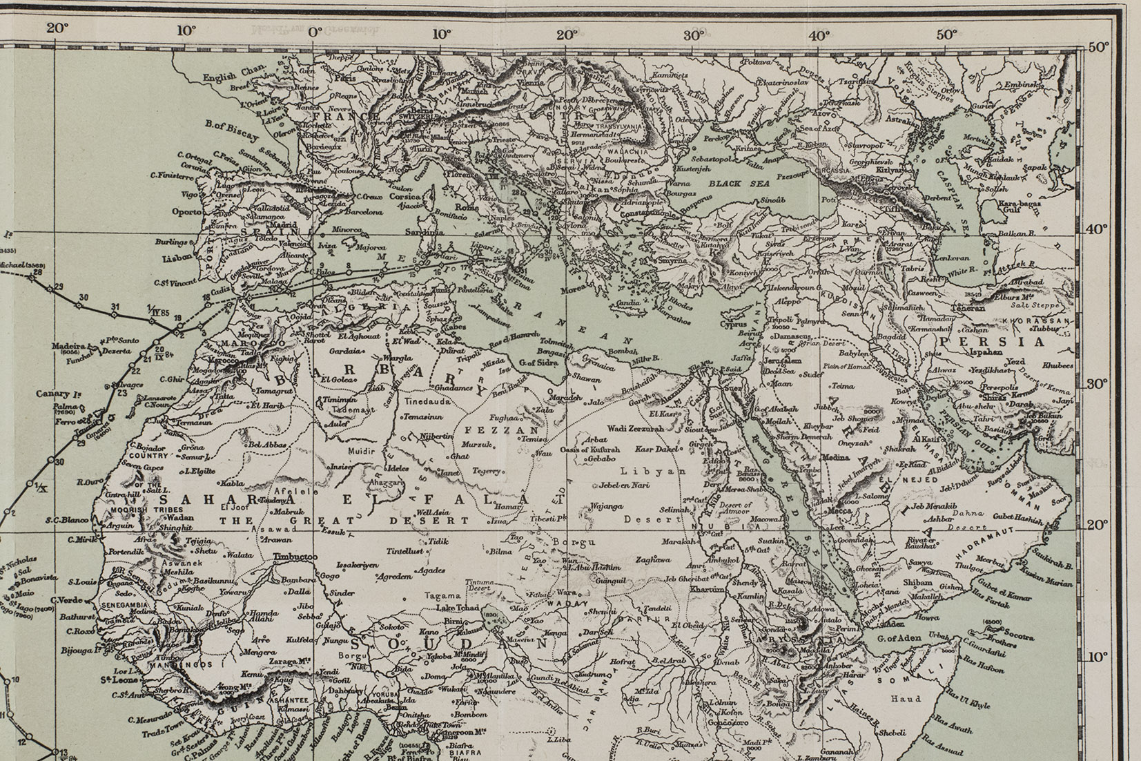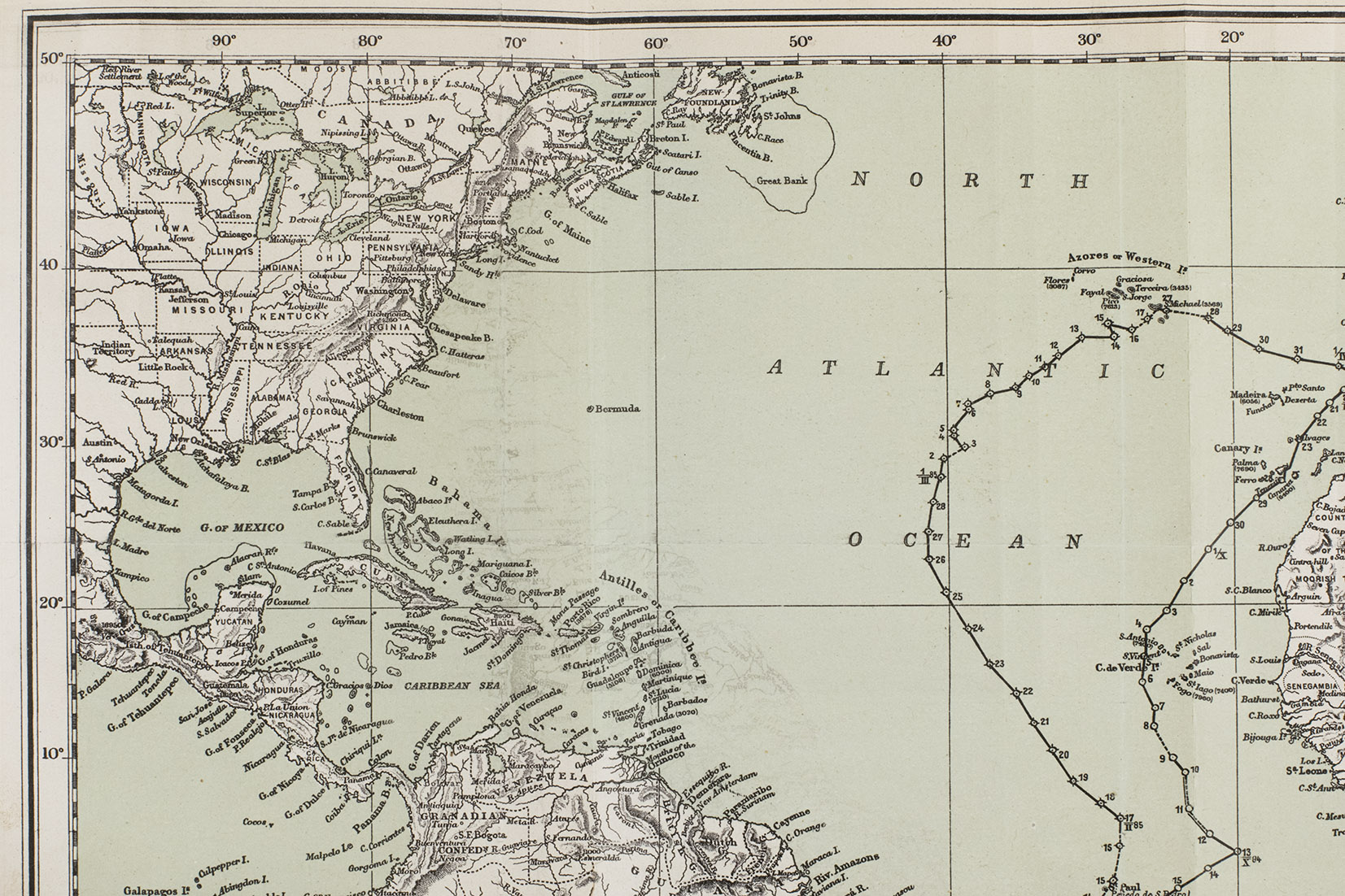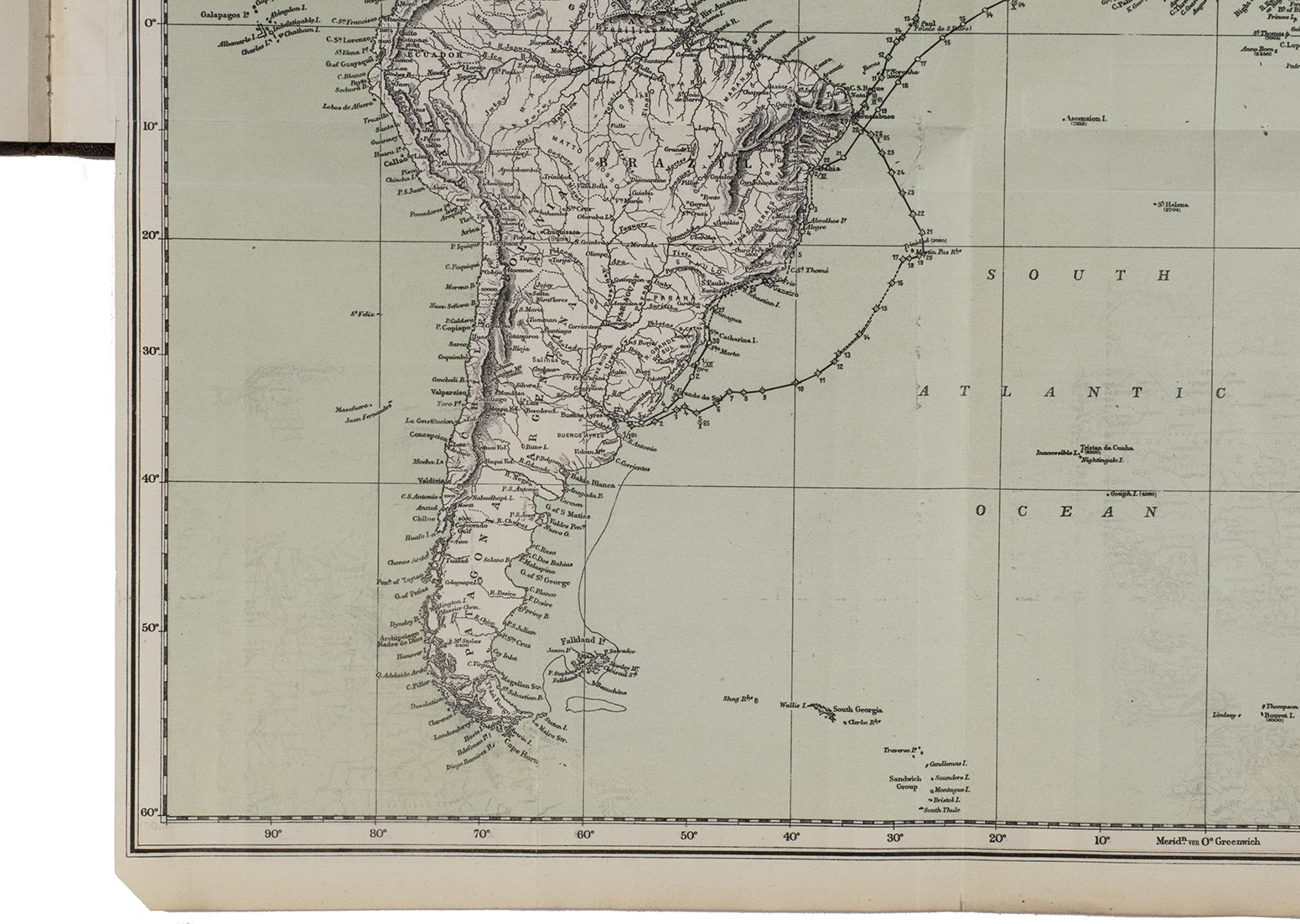 Vienna, Carl Gerold's Sohn, 1885. Large 8vo. With 3 lithographed folding maps (one coloured) showing the route of His Majesty's Ship Aurora along the east coast of South America. Contemporary half brown cloth with the original publisher's printed wrappers mounted on the boards. 56 pp.