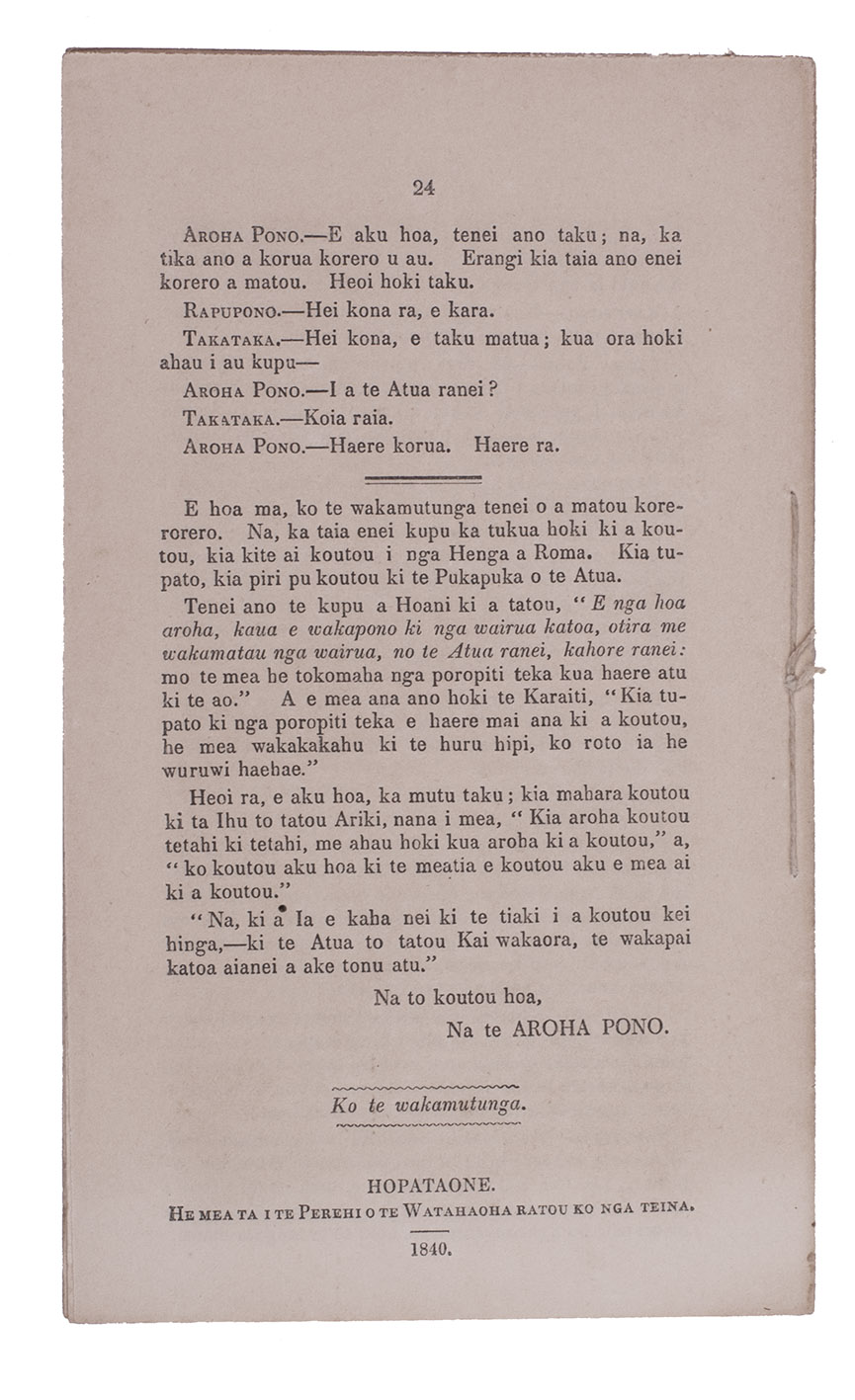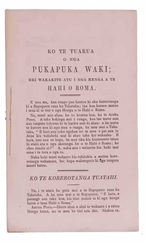 First edition, printed in Tasmania in the Maori language, of an anti-Catholic pamphlet by William Colenso (1811-1899), printer, missionary, botanist and explorer in New Zealand, containing three dialogues between "Rapupono" ("Truth Seeker") and "Aroha Pono" ("True Love", the pen-name Colenso used in his religious polemics) exposing what he saw as six errors in the Roman Catholic Church. These are additional to six that he had discussed in a pamphlet with three similar dialogues earlier in the same year.