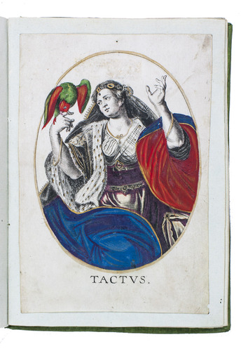 Antwerp, Jan Adriaensz. Collaert, [ca. 1618/28]. Large 24mo(?) album (14.5 x 10.5 cm). A complete series of 5 engraved prints on vellum (13 x 8.5 cm; oval image 10 x 7.5 cm) each illustrating one of the five senses with a female figure. Richly and very beautifully coloured by a contemporary hand, in colour gouaches (red, blue, purple and green), extensively highlighted with gold. Each print mounted on a paper leaf in a small album. Green silk (ca. 1820?) over flexible boards. [5] engraved ll.