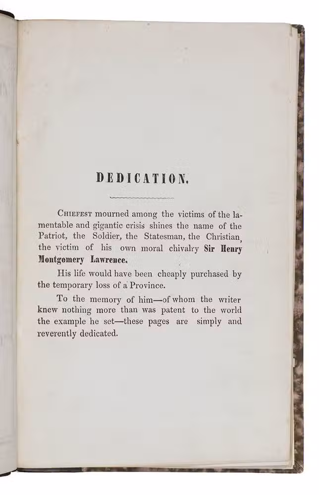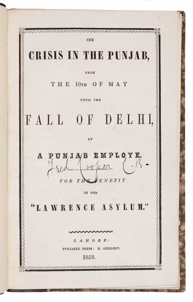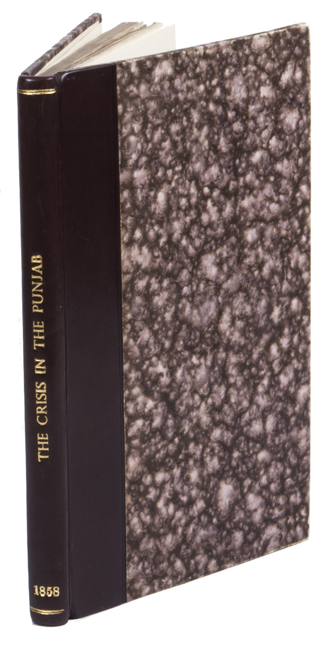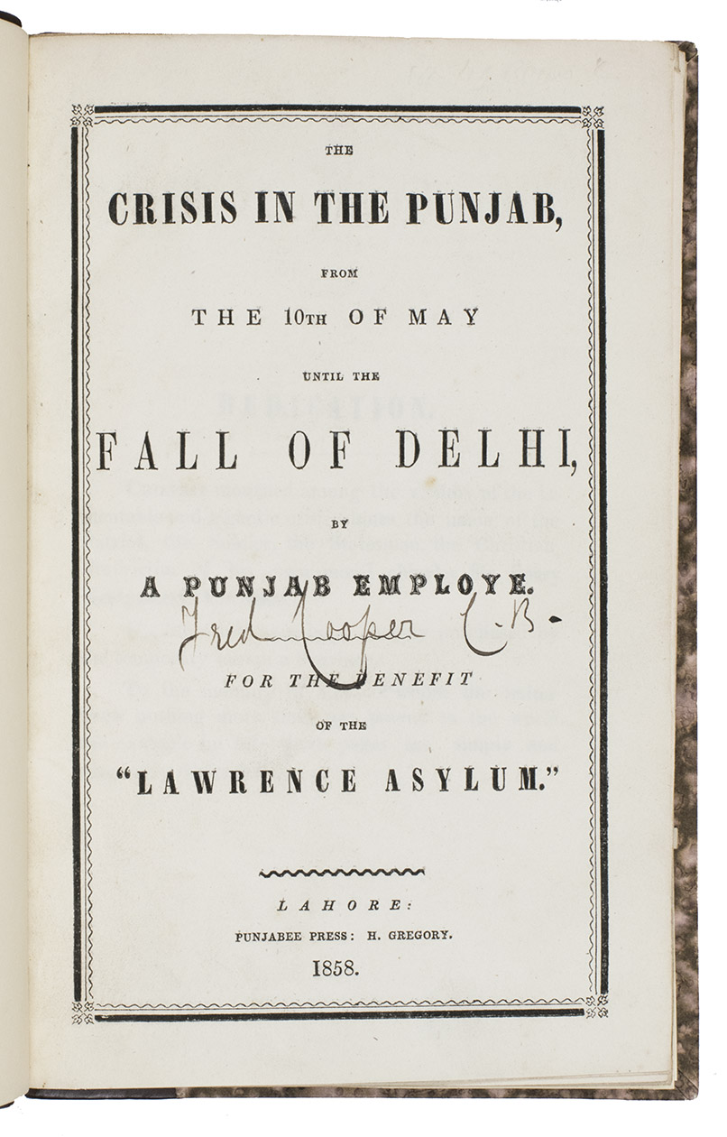 Very first edition, printed in Lahore in the Punjab region in 1858, of a controversial account by "a Punjab employe[!]". This employee was Frederick Henry Cooper (1827-1869), who was a British civil servant working with the British East India Company in the Punjab region. The present work is a very early publication on the Indian Mutiny of 1857, it was possibly published before, or in any case simultaneously with, the London edition of the same year.