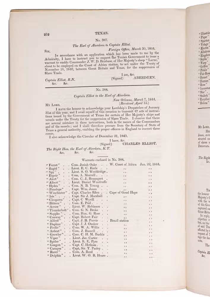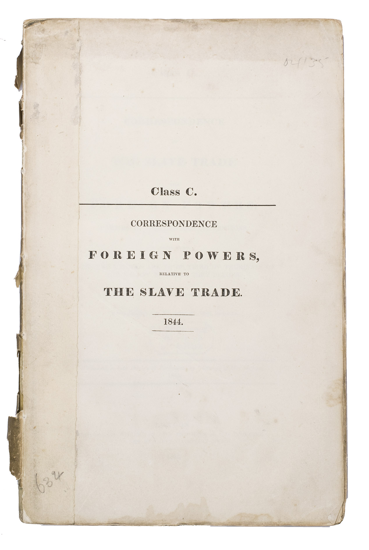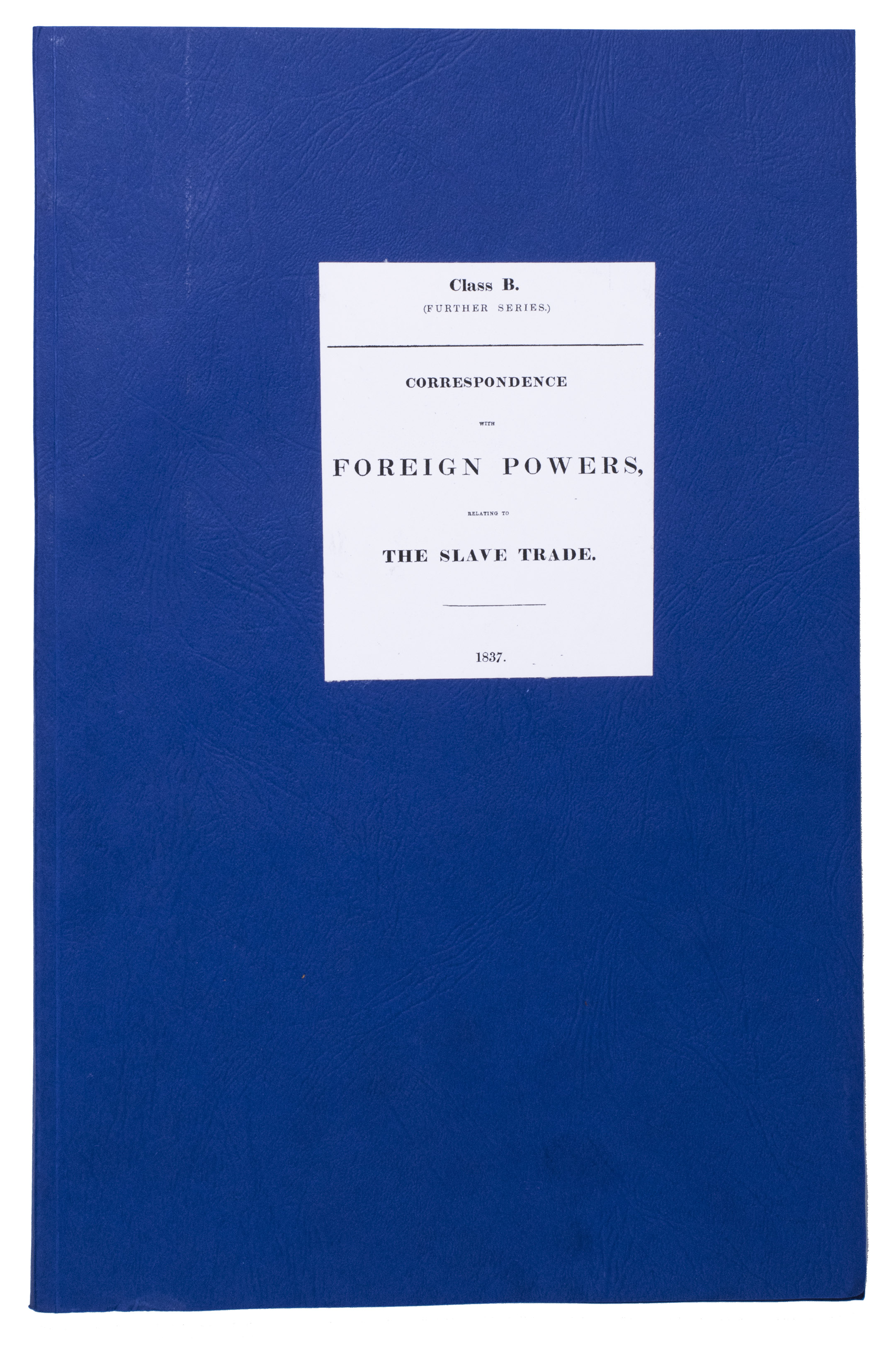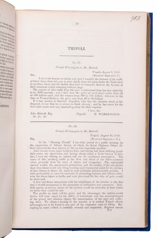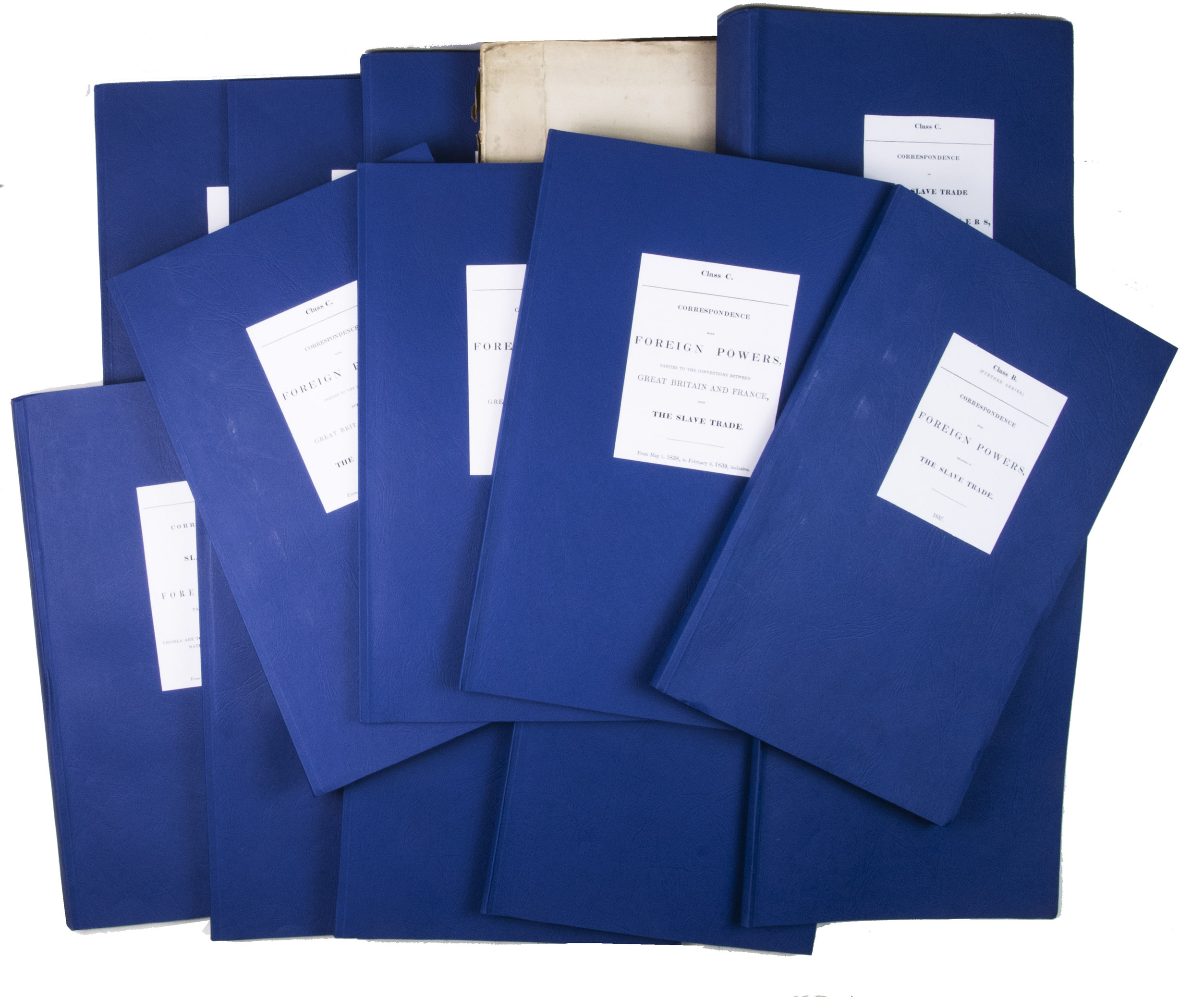 Rare collection of 14 volumes containing transcriptions of British diplomatic correspondence with other countries relating to the slave trade in the 19th century, printed for the British government. Although slavery in the British Empire was abolished in 1807, enslaved people in the colonies were not freed until 1838. In the present volumes, which mostly date from 1837-1846, directly after slavery was abolished in most British colonies, the British government urges other countries to help put a halt to the now illegal slave trade.