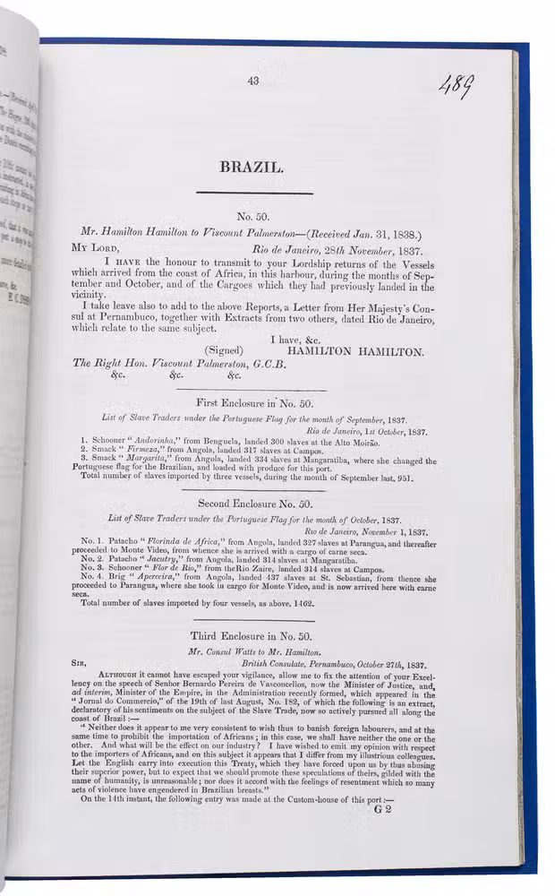 The present collection contains the correspondence between Britain and numerous countries in Europe, the Americas and North Africa, especially France, Spain, the United States and Austria. The letters describe the ships carrying enslaved people in detail, also mentioning their ports of call, so they could be more easily found and stopped. Of particular interest are the transcriptions of slave trade acts from various countries as well as the treaties between France and chiefs in African colonies, which are difficult to find in print anywhere else.
