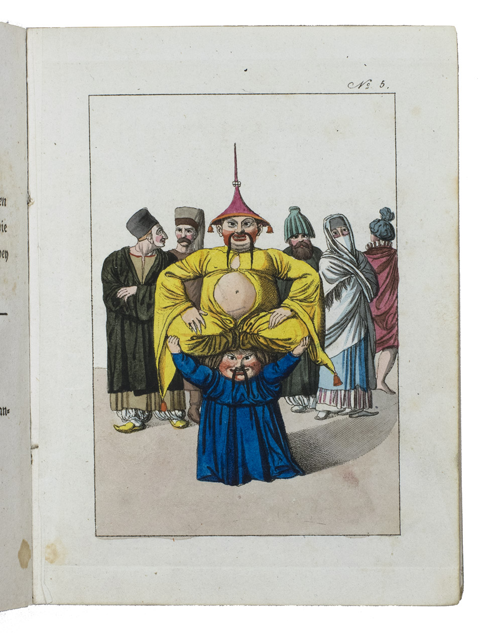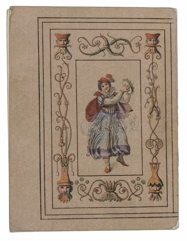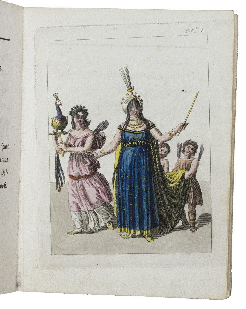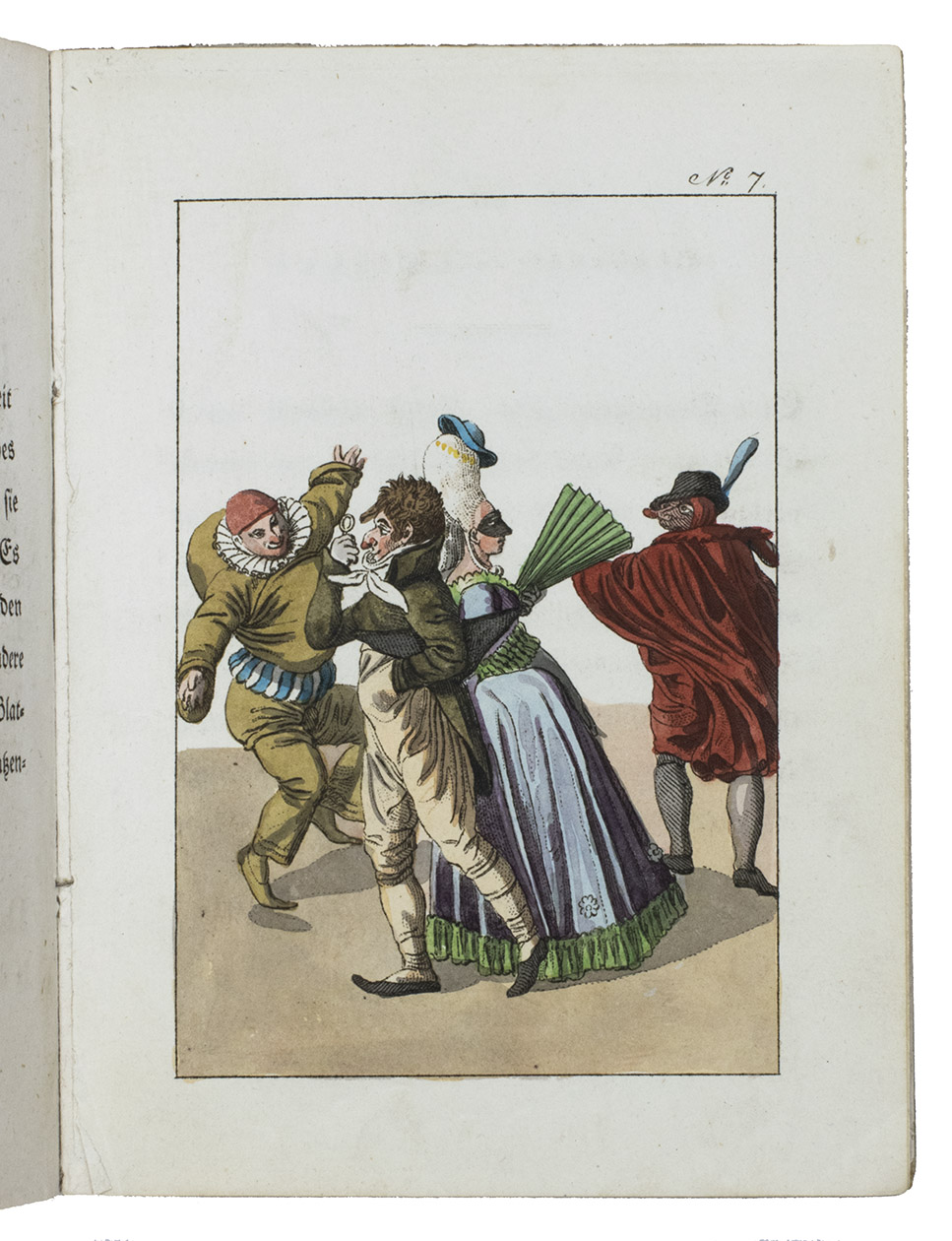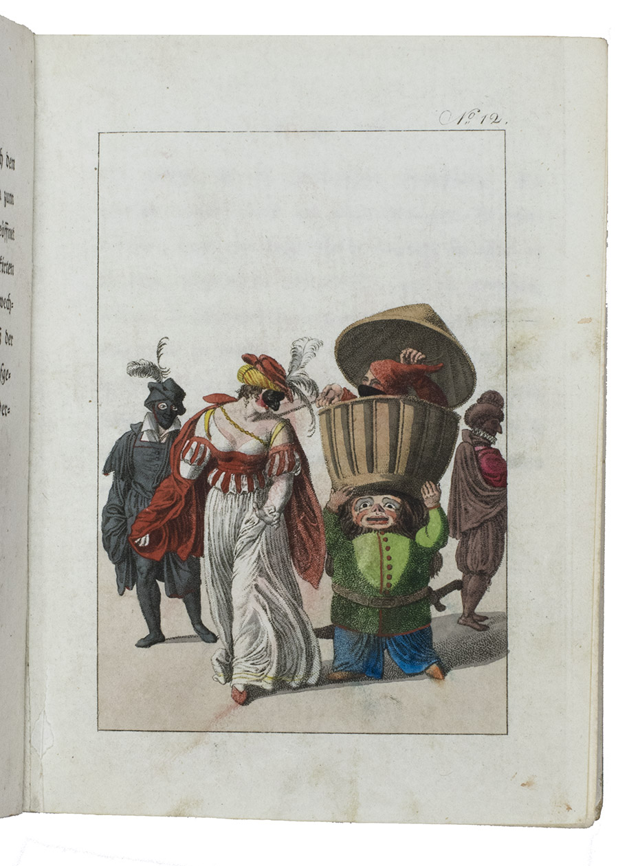 Very rare, first and only published part of a series of hand-coloured carnival costume plates, each of the 12 with a letterpress description in German and French. Only plates 9 and 10 bear the name of the German draughtsman and engraver Friedrich Wilhelm Nettling, best known for his portrait of Bach, but all may have been engraved by him. The mostly comical or farcical plates illustrate a fairy with her entourage, a Chinese man, Don Quixote and Sancho Panza, a group of beast people and many other extraordinary figures. Two figures in one plate wear funnels as hats, like the Tin Man in The Wizard of Oz. Besides the 12 plates in the booklet itself, the engravings on the boards show two male figures (gymnasts?, one in a clown-like costume) on the front and a dancing woman with a tambourine on the back.