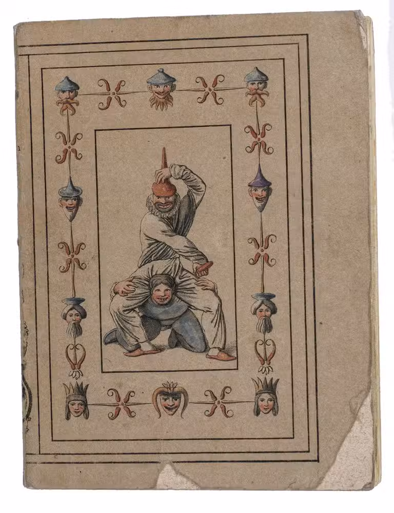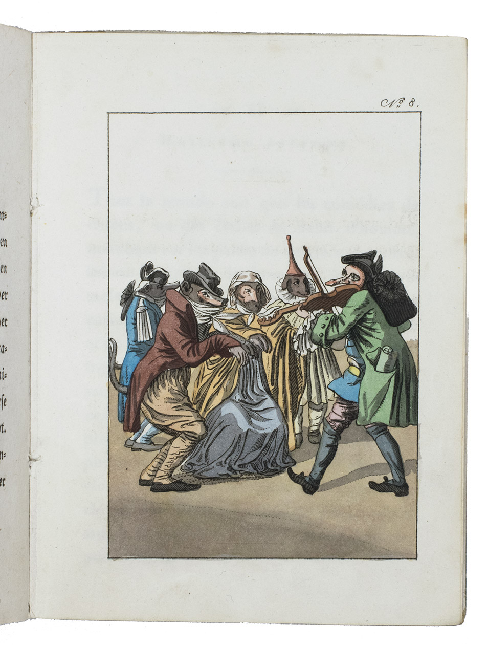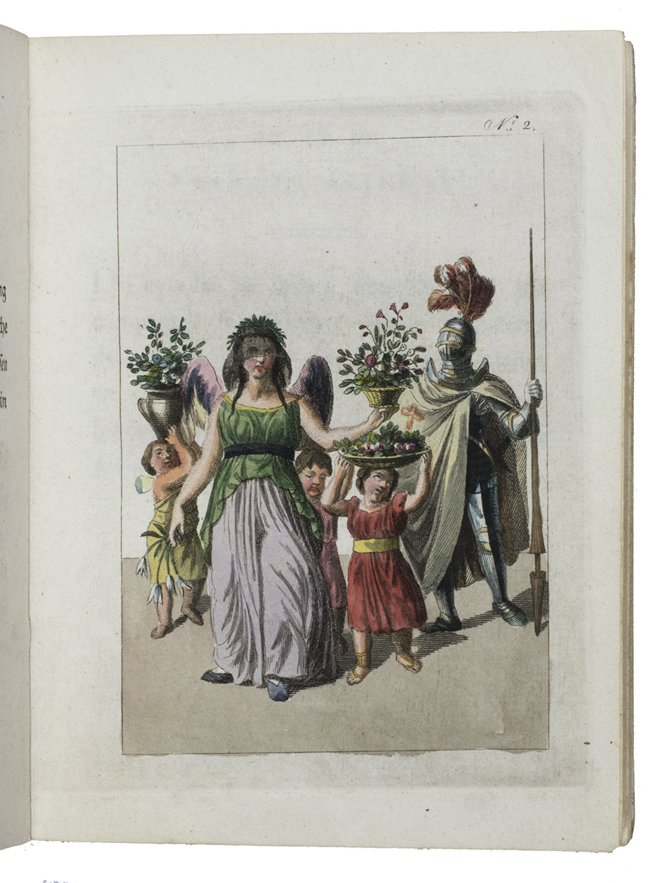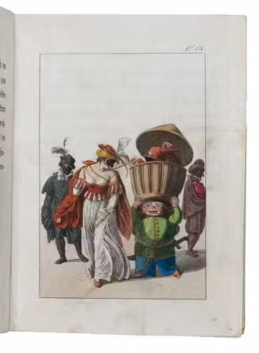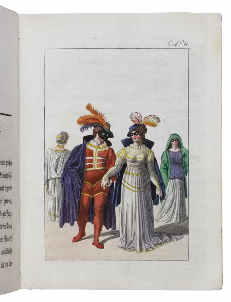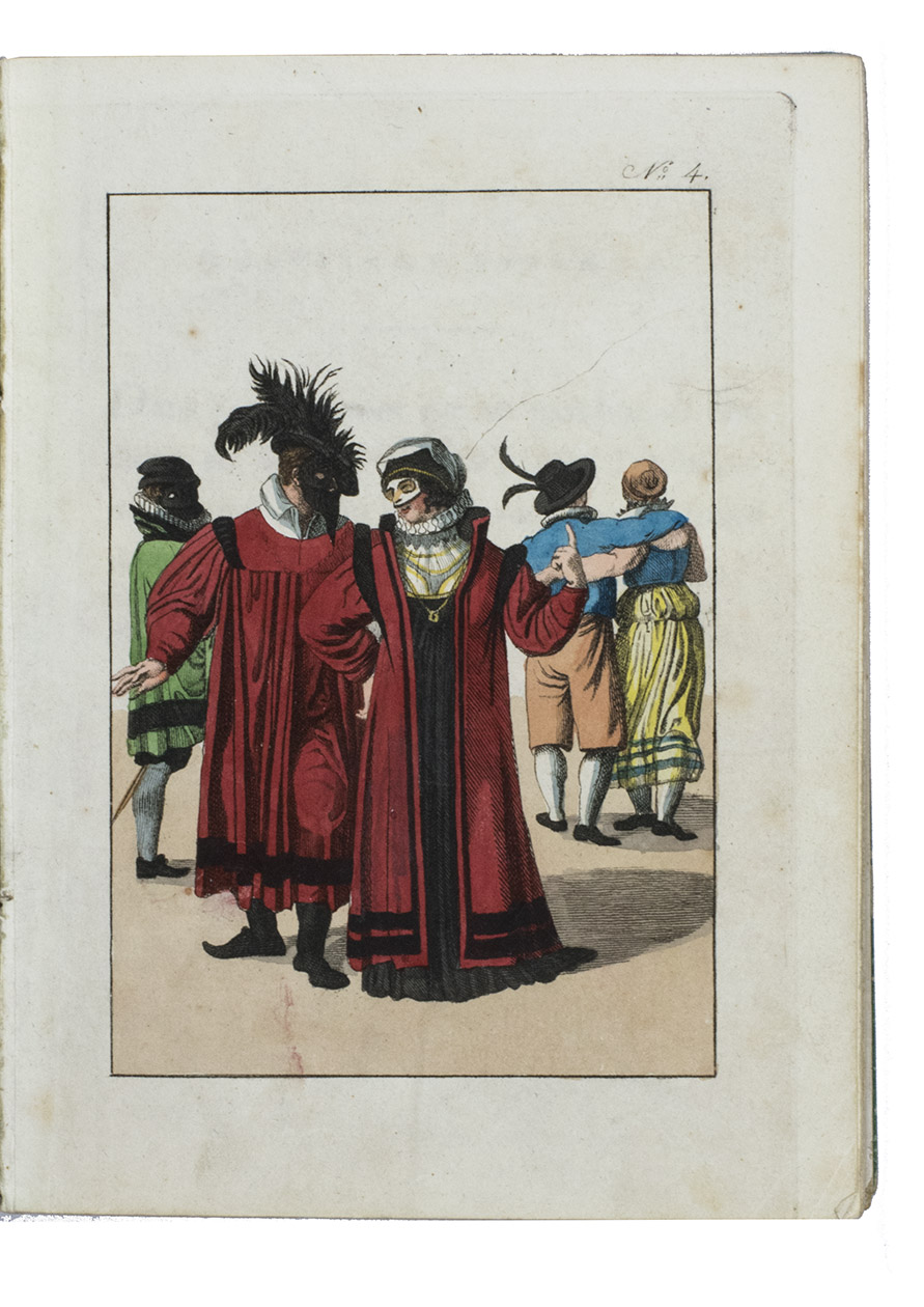 Very rare, first and only published part of a series of hand-coloured carnival costume plates, each of the 12 with a letterpress description in German and French. Only plates 9 and 10 bear the name of the German draughtsman and engraver Friedrich Wilhelm Nettling, best known for his portrait of Bach, but all may have been engraved by him. The mostly comical or farcical plates illustrate a fairy with her entourage, a Chinese man, Don Quixote and Sancho Panza, a group of beast people and many other extraordinary figures. Two figures in one plate wear funnels as hats, like the Tin Man in The Wizard of Oz. Besides the 12 plates in the booklet itself, the engravings on the boards show two male figures (gymnasts?, one in a clown-like costume) on the front and a dancing woman with a tambourine on the back.
