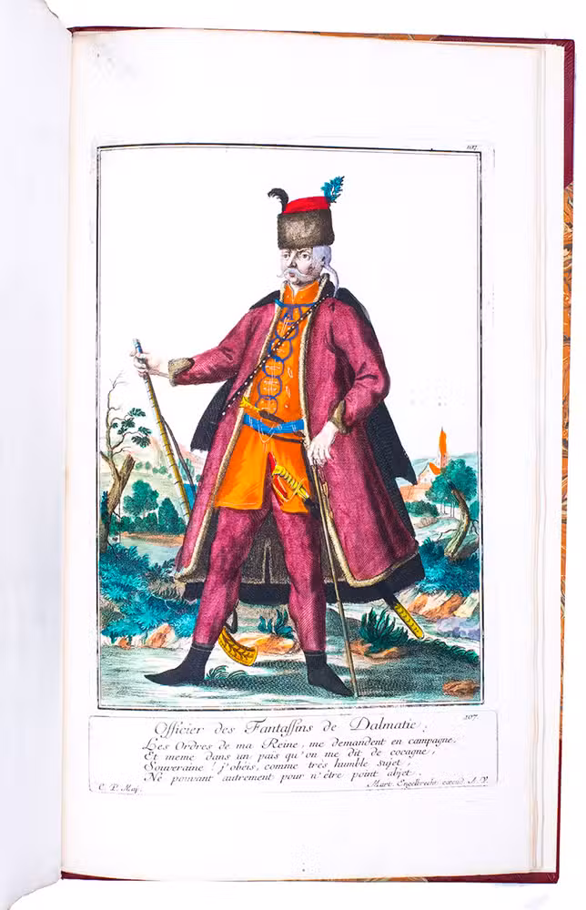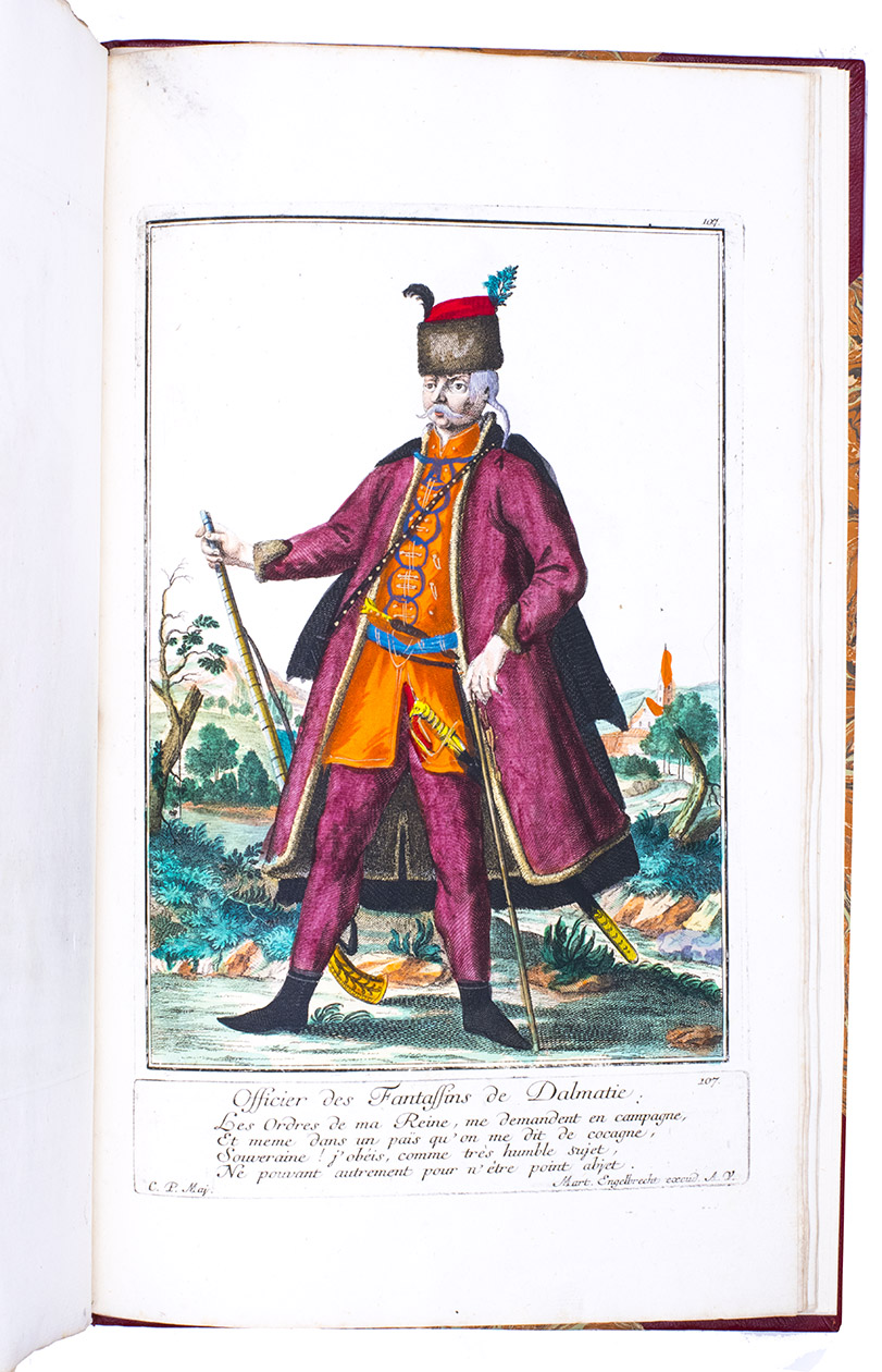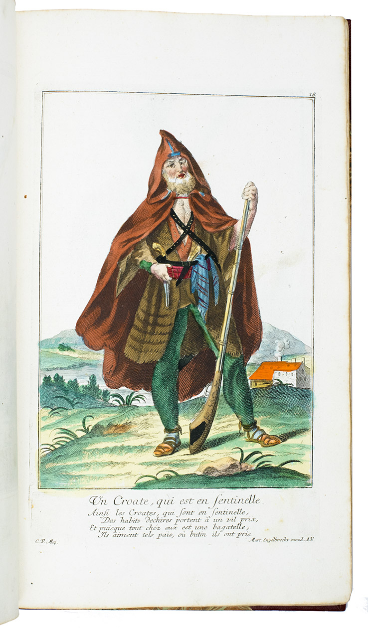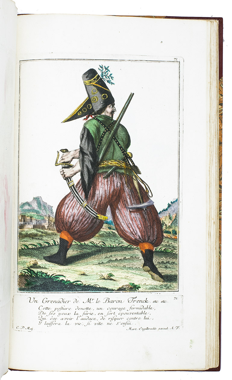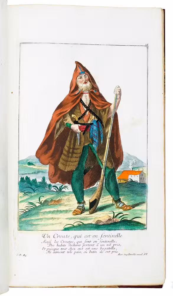 Thirty engravings are devoted to the Habsburg monarchy's military border, including a portrait of their famous commander Colonel Baron Francis von der Trenck (1711-1749), while fifteen more show Scottish Highlanders ("Montagnards dEcosse"), eleven Hungarian foot soldiers ("Tolpatches"), six Prussian Hussars from the regiment of Baron Johann Daniël von Menzel, including a portrait of him, six Fantasins (infantry from Carlstadt (Karlovac, Croatia), Uhlanen (light Polish-Lithuanian cavalry), Hajduk (irregular infantry), Dalmatians (Morlachs), Serbs and Croats (Varasdin). There are plates of officers and commanders as well as common soldiers, many fighting on horseback; some soldiers waving the flag of their unit, or playing the flute, trumpet, drums or bagpipes. Some are depicted with their wives (or mistresses) and children, including a plate of a sutler (someone who sold provisions); many apear against an interesting background picturing camps, cities, fortresses and soldiers cooking or being punished.