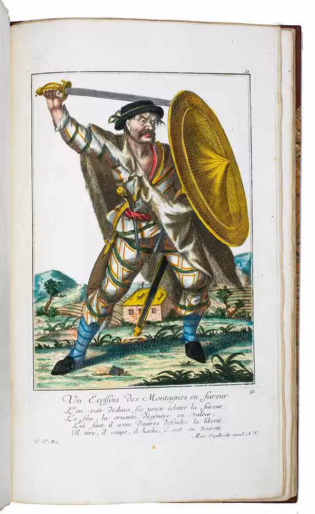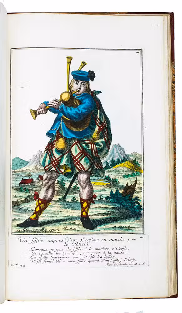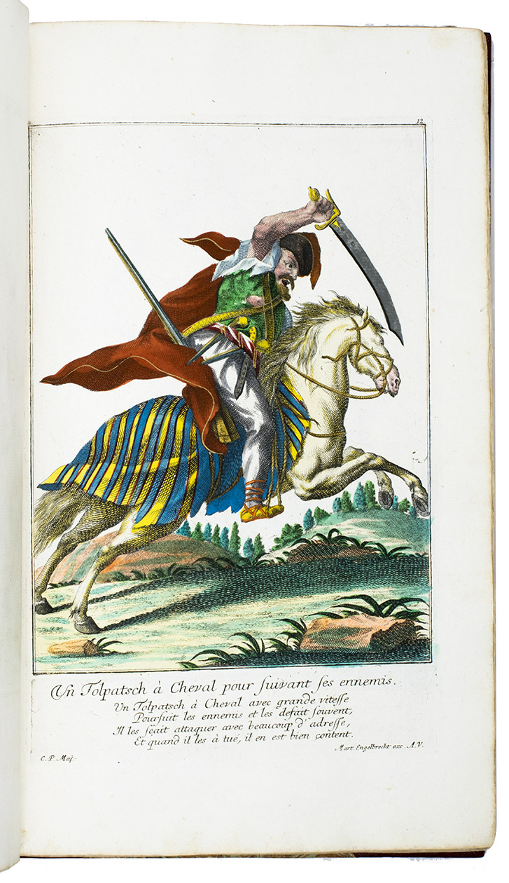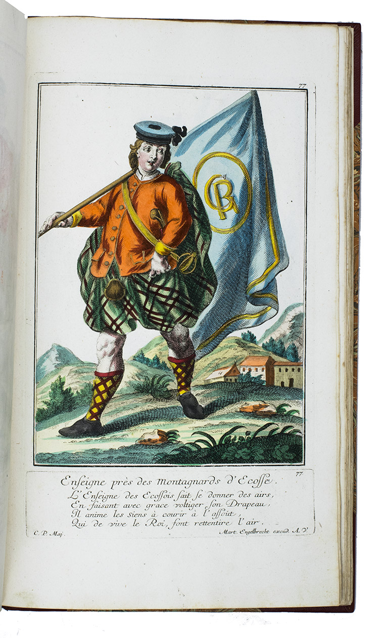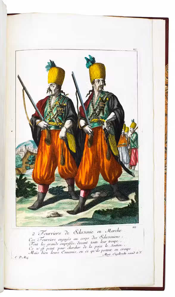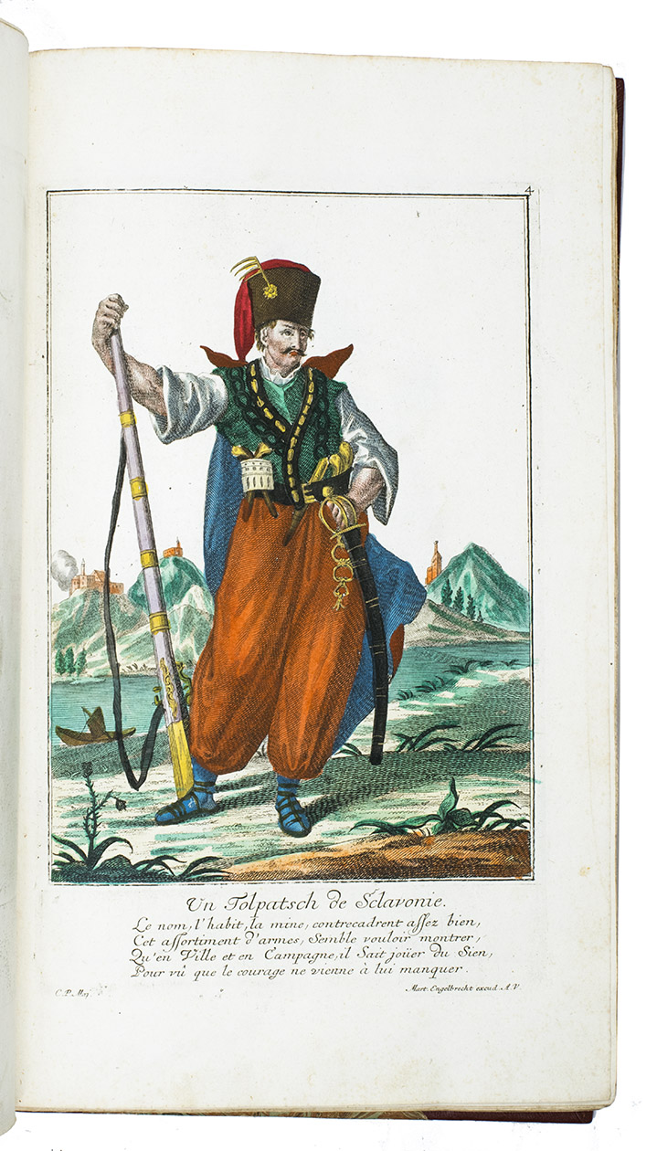 Thirty engravings are devoted to the Habsburg monarchy's military border, including a portrait of their famous commander Colonel Baron Francis von der Trenck (1711-1749), while fifteen more show Scottish Highlanders ("Montagnards dEcosse"), eleven Hungarian foot soldiers ("Tolpatches"), six Prussian Hussars from the regiment of Baron Johann Daniël von Menzel, including a portrait of him, six Fantasins (infantry from Carlstadt (Karlovac, Croatia), Uhlanen (light Polish-Lithuanian cavalry), Hajduk (irregular infantry), Dalmatians (Morlachs), Serbs and Croats (Varasdin). There are plates of officers and commanders as well as common soldiers, many fighting on horseback; some soldiers waving the flag of their unit, or playing the flute, trumpet, drums or bagpipes. Some are depicted with their wives (or mistresses) and children, including a plate of a sutler (someone who sold provisions); many apear against an interesting background picturing camps, cities, fortresses and soldiers cooking or being punished.