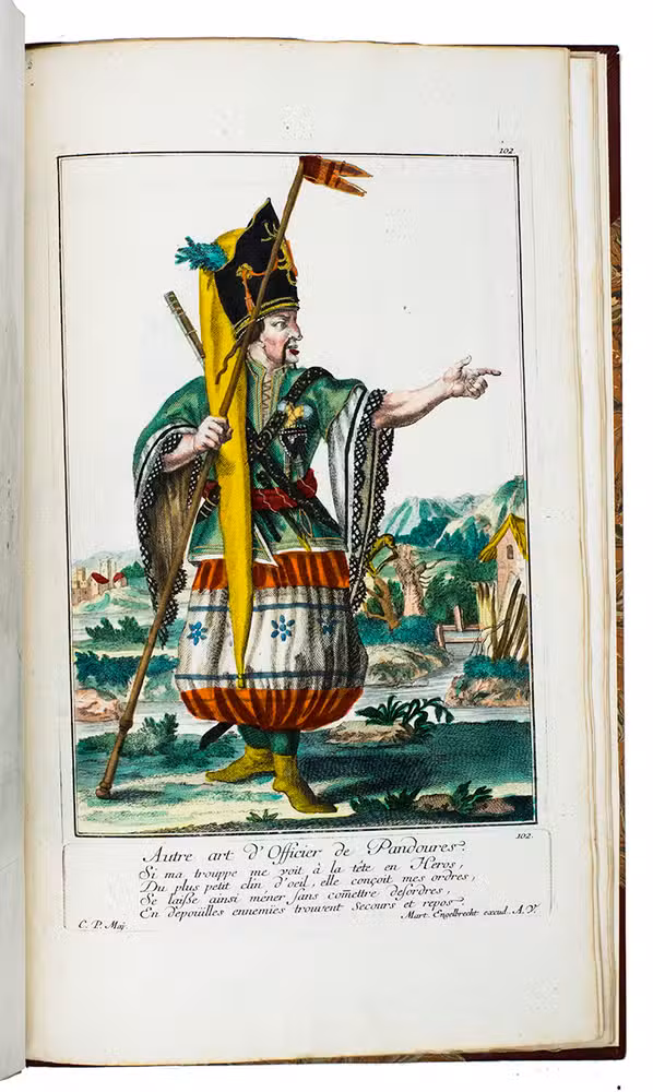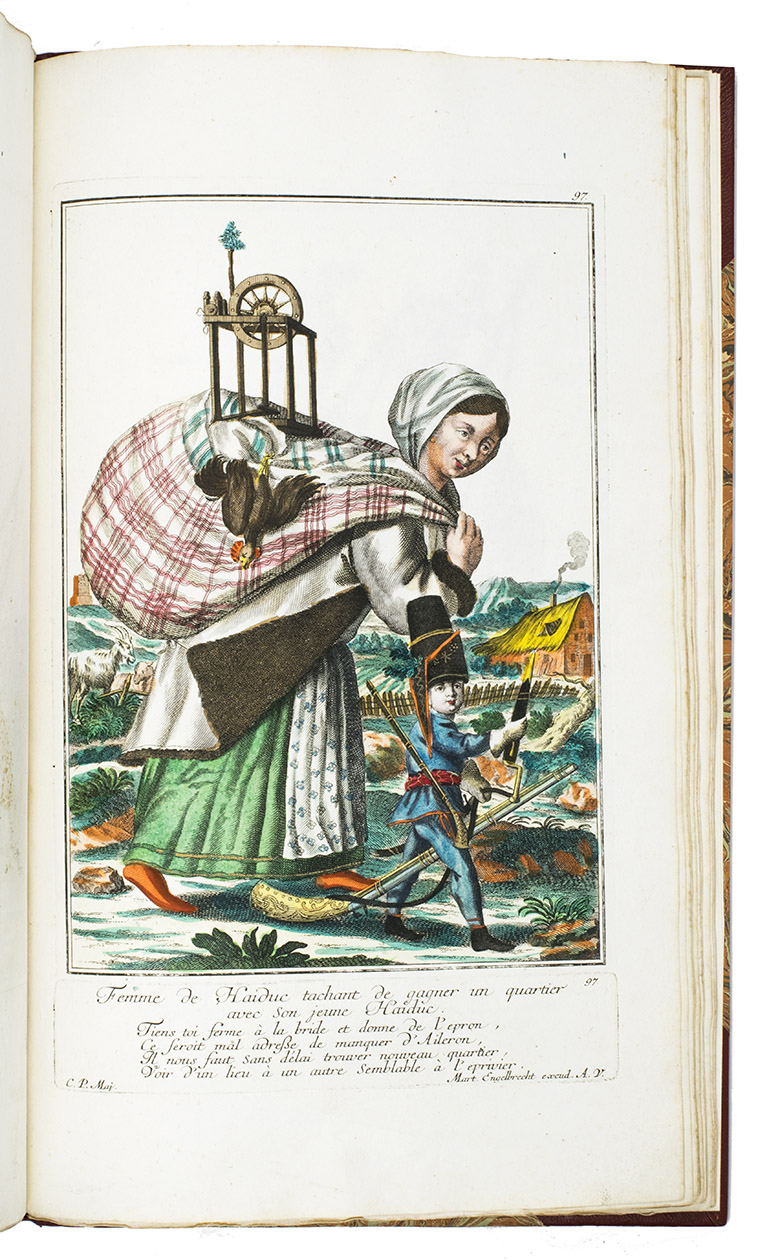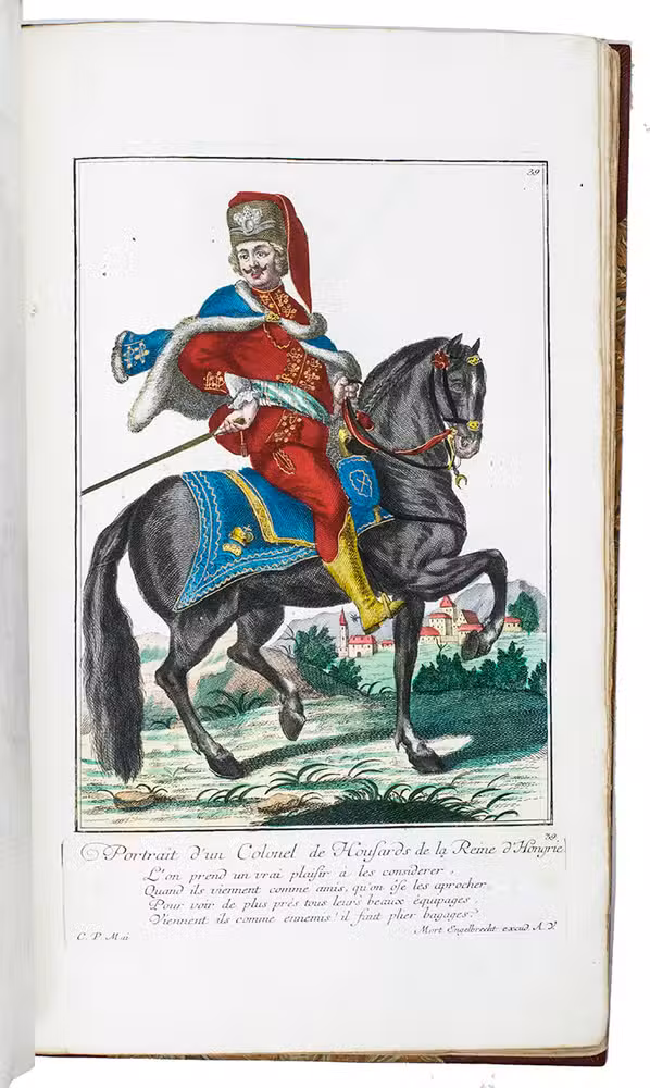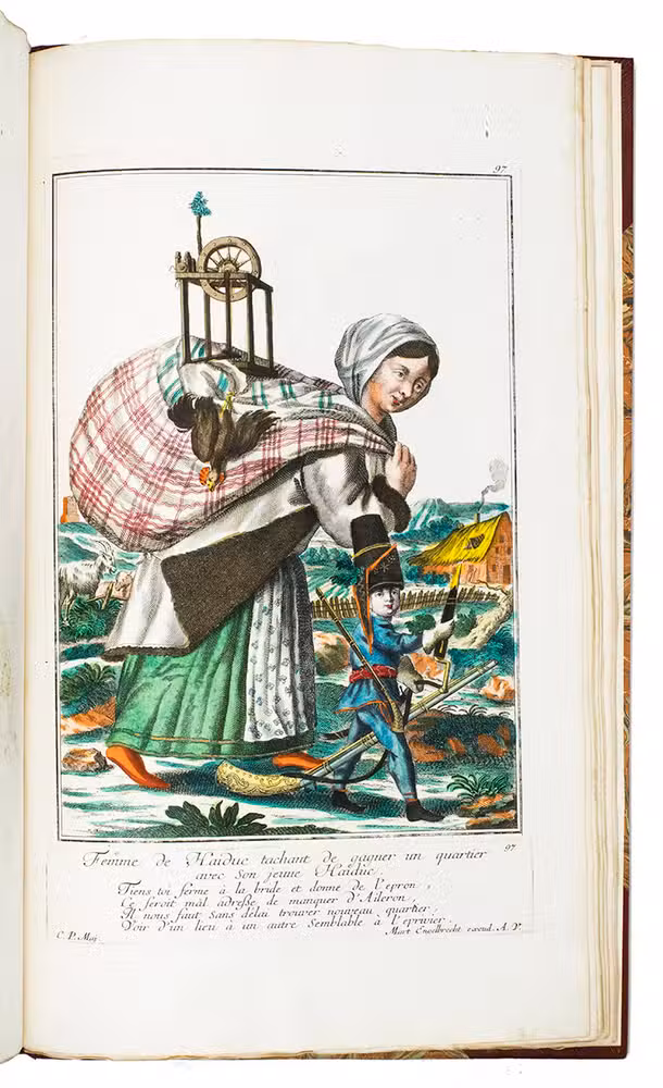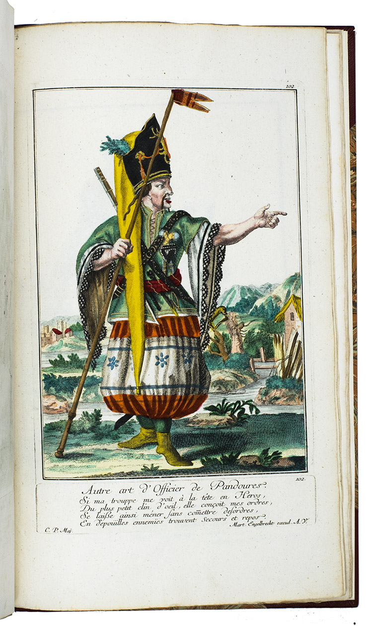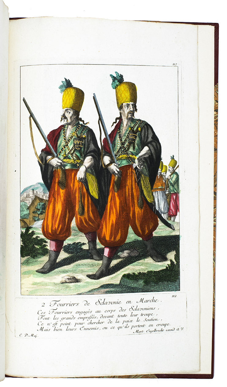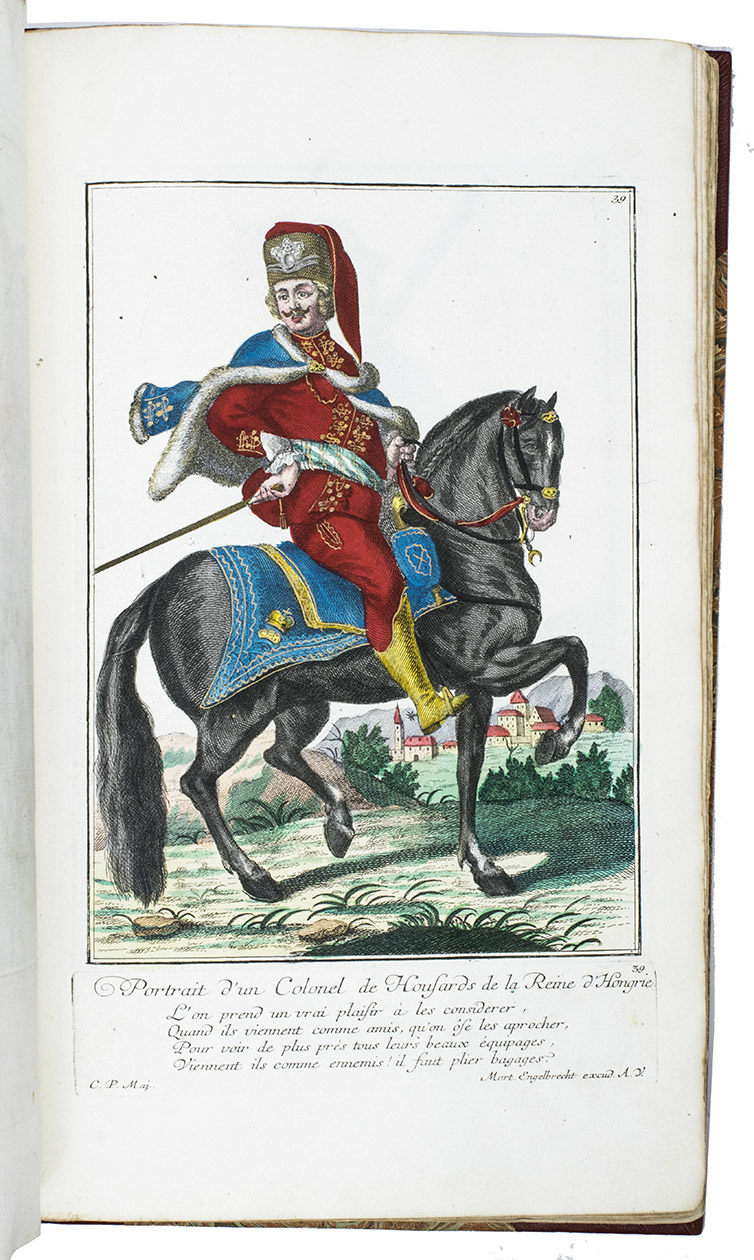 Extremely rare suite with 115 hand-coloured plates of the protagonists of the Austrian Succession wars. This collection of costume plates is very rare: neither Lipperheide nor Colas records it and we find only a few separate plates on the market and in libraries. We find only 7 sets recorded in the last 100 years with varing make-up and number of plates.