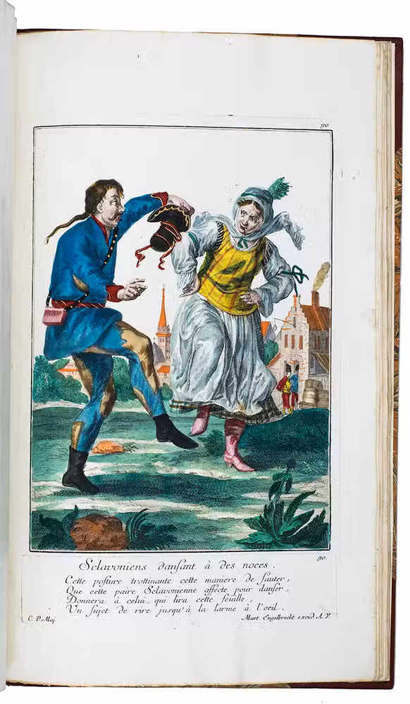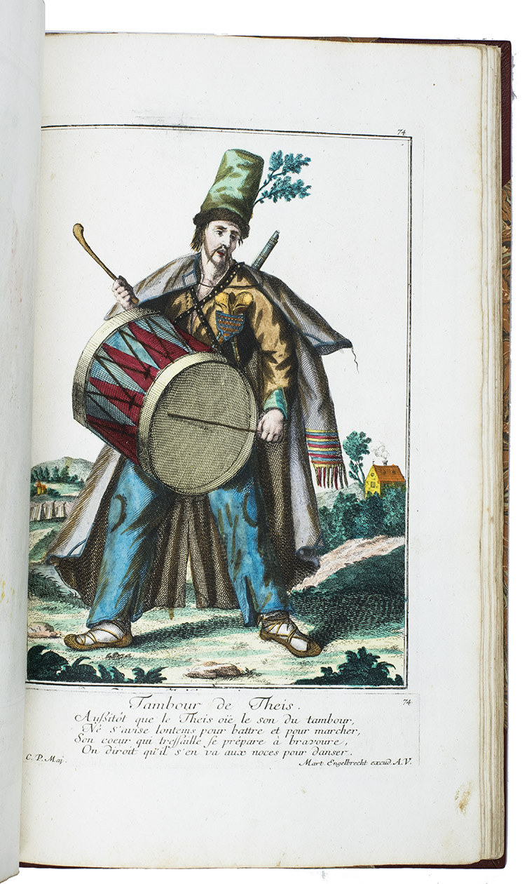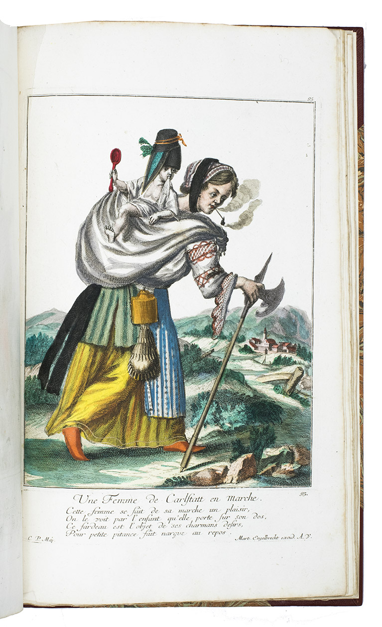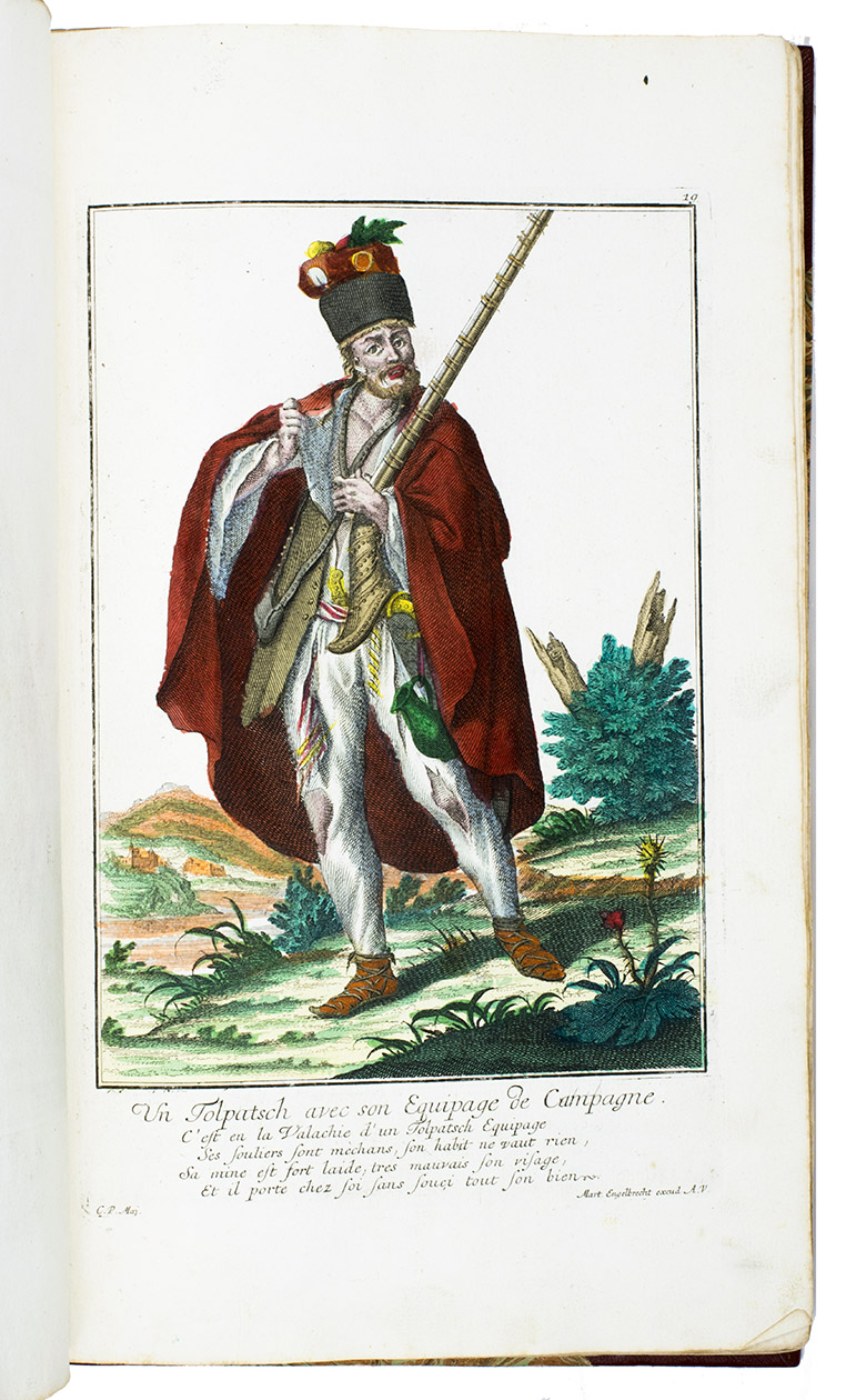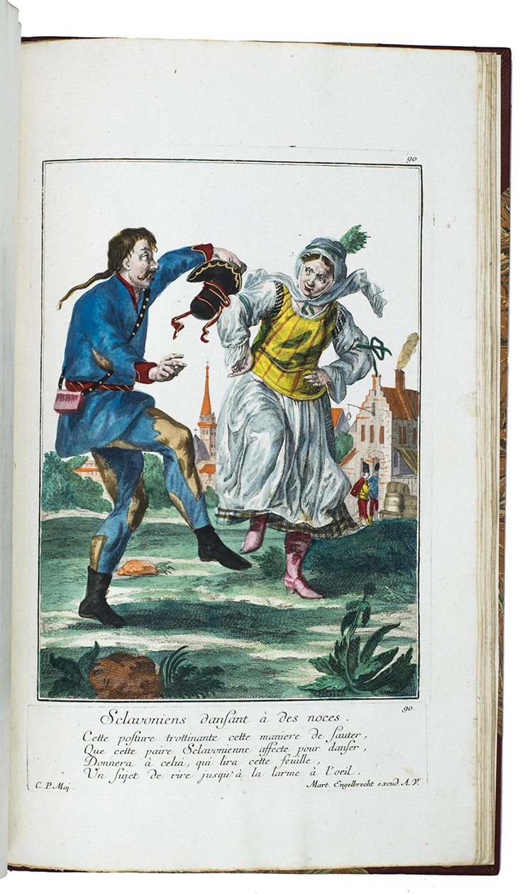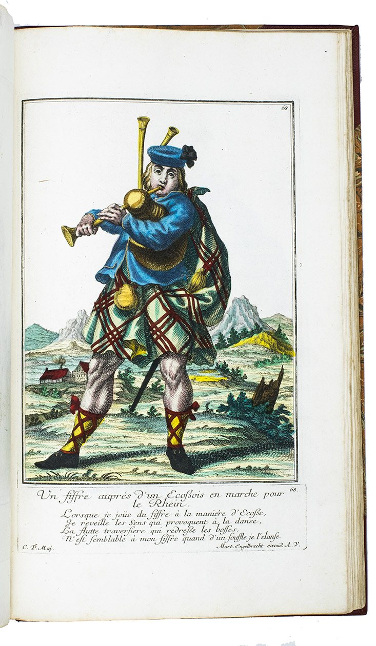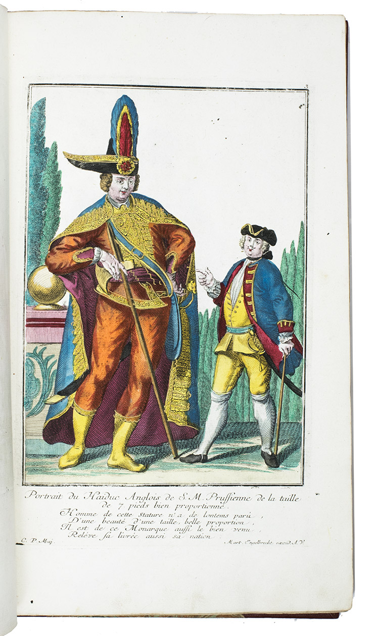 Augsburg, Martin Engelbrecht, ca. 1742. Folio. 115 engraved and magnificent hand-coloured plates, highlighted with gold and silver, drawn by C.P. Maj and executed and printed by the Augsburg engraver and art publisher Martin Engelbrecht (1684-1756). With separately printed engraved captions consisting of a (sometimes 2-line) title and a poem of 4 or 5 lines in French below each plate (except plates 55-56 which have a German caption printed below and a French caption in the plate), pointing out the characteristics of the man depicted. Modern red morroco, marbled sides. 115 plates.