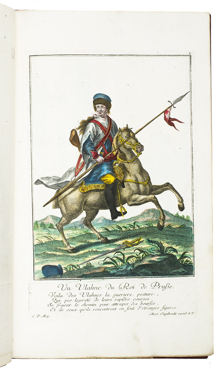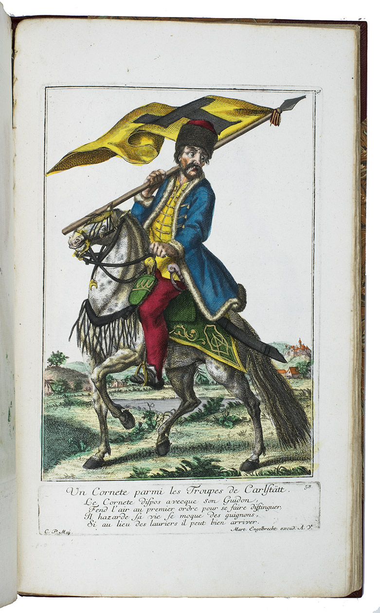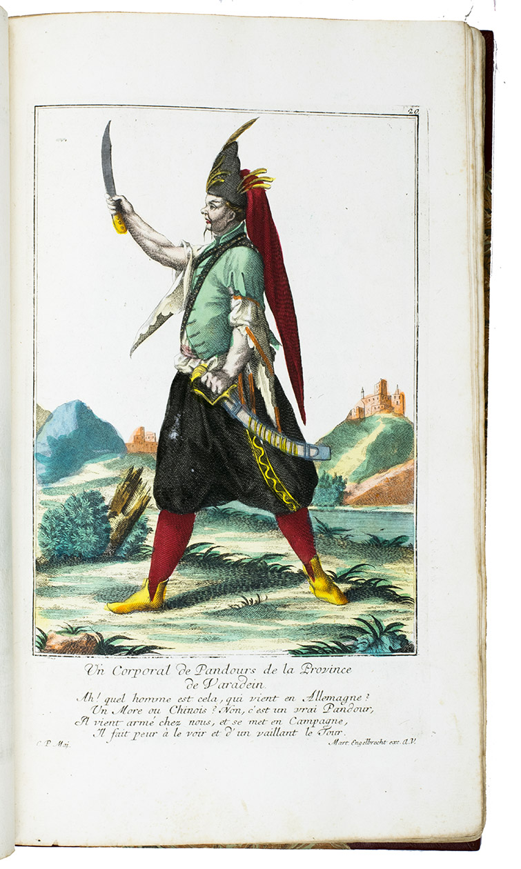 The work was apparently also published and sold with the title Theatre de la milice etrangere: Schau-Bühne verschiedener bisher in Teutschland unbekant gewester Soldaten von ausländischer Nationen, also published by Engelbrecht (ca. 1746?), but with other, bilingual French and German captions printed below the plates. The plates show us lively pictures of the protagonists, especially of the foreign mercenaries, in action - often fiercely and ruthlessly - on the battlefields of 18th-century Europe during the War of the Austrian Succession and the first and second Selesian wars (ca. 1740-1748), the last Great Power conflict with the Bourbon-Habsburg dynastic conflict at its heart, and marked by the rise of Prussia as a major power.