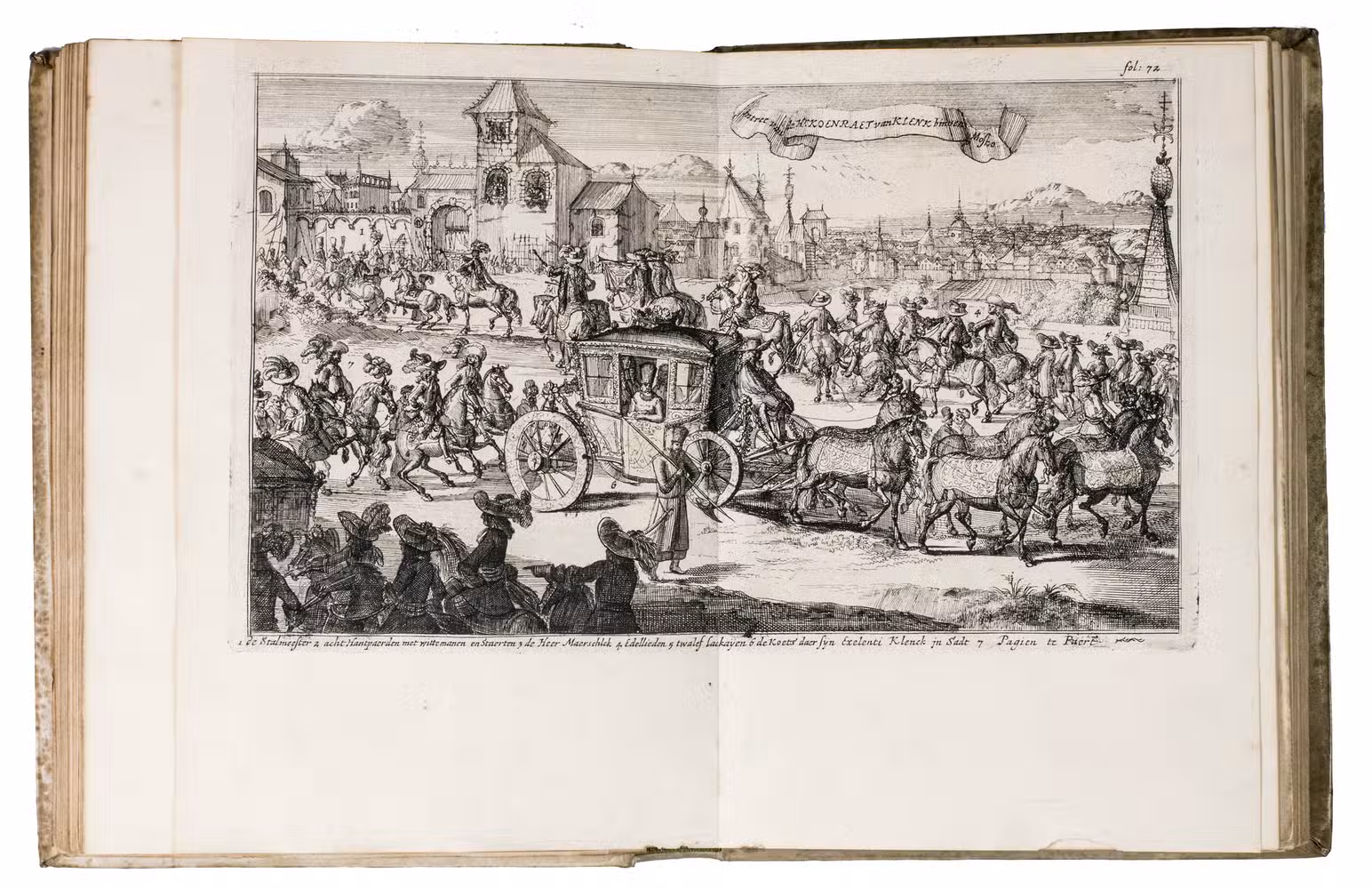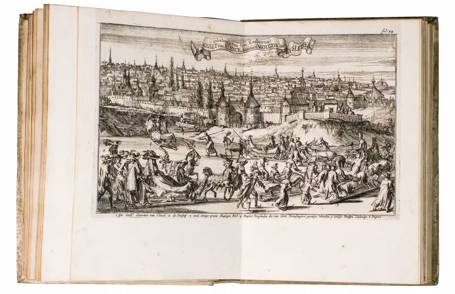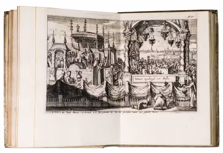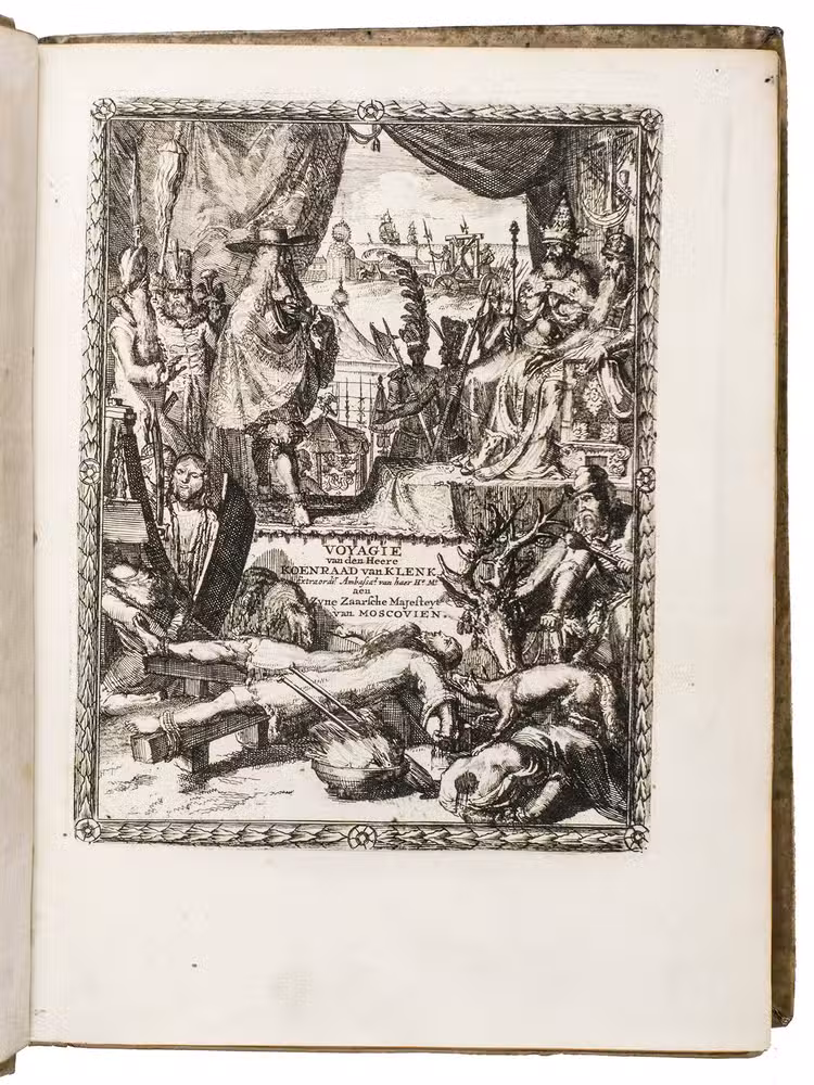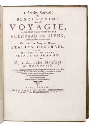 In 1775, a group lead by the rich merchant Coenraad van Klenck (1628-1691) was sent to Russia by the Dutch government in order to persuade Tsar Alexei to start a war with Sweden (which would benefit the Dutch Republic), as well as to obtain a Dutch monopoly for the trade with Persia via Russia. Klenck was chosen as the leader because he was the director of an important trading company which sold fish and caviar on the Russian market. He also owned multiple houses in Russia and spoke the language well. Another member of the party was Balthasar Coyett (ca. 1650-1725), the son of Frederick Coyett (1615-1675), who was the last governor of Dutch Formosa. Balthasar is most likely the author of the present work.