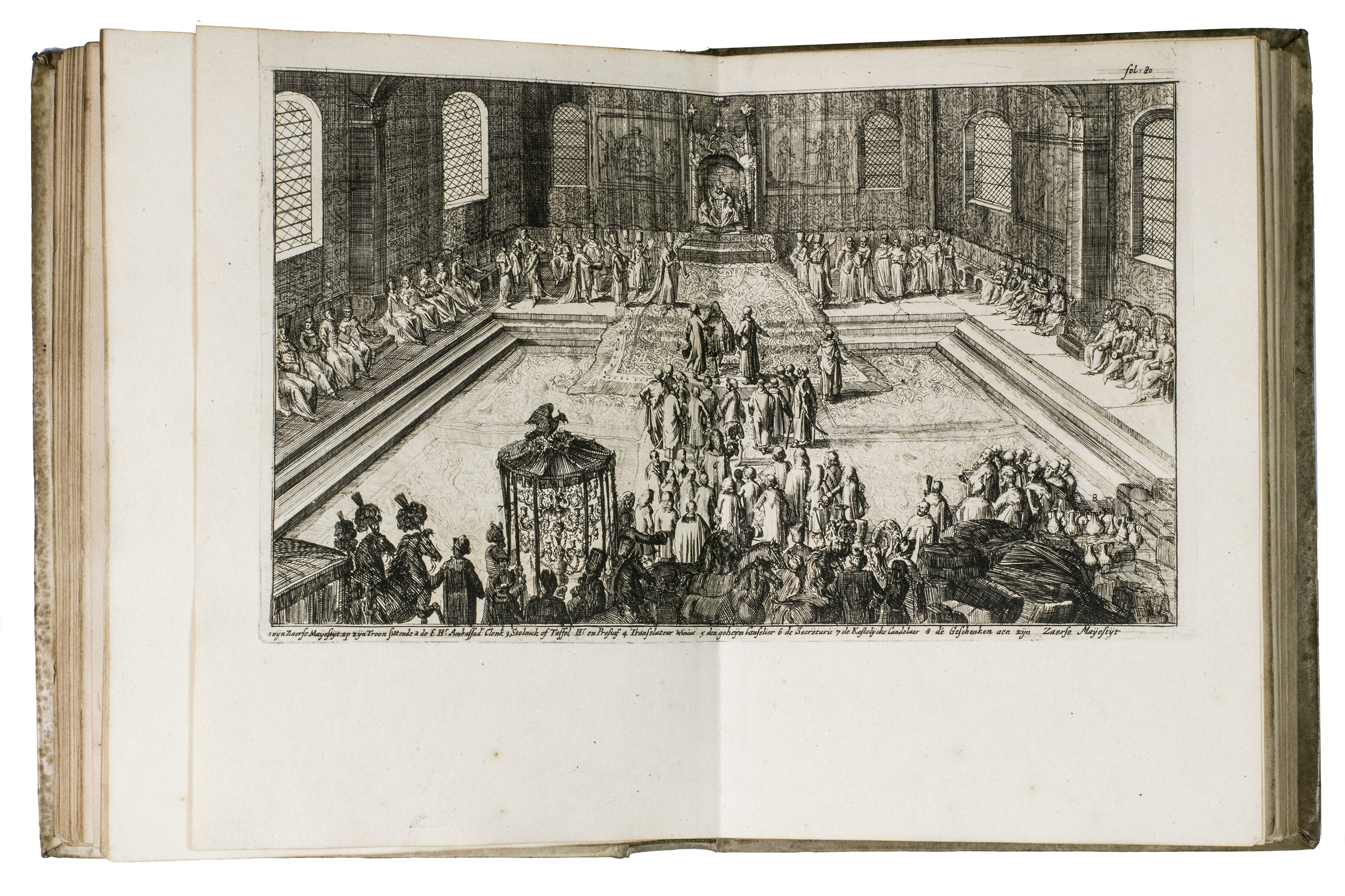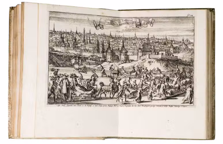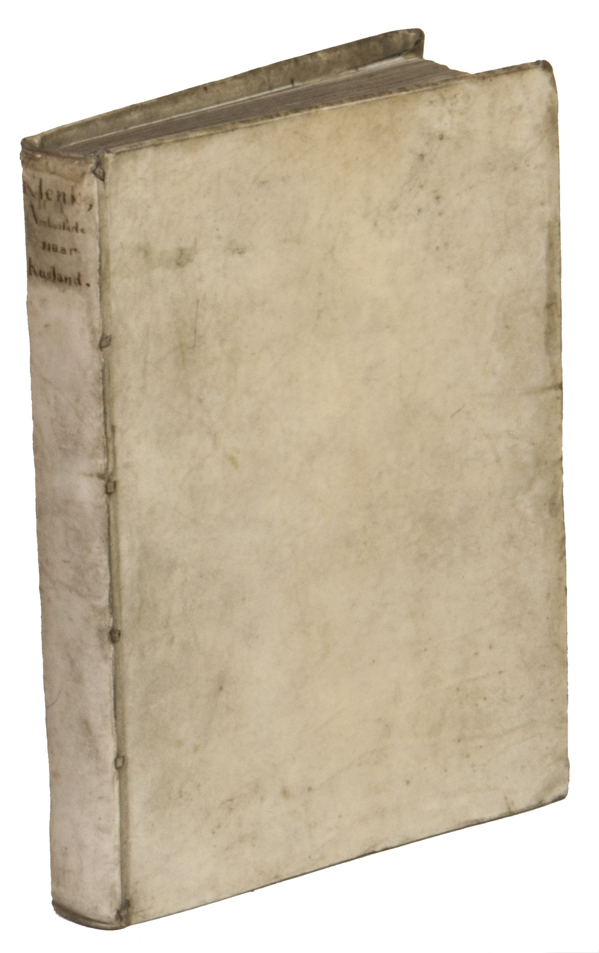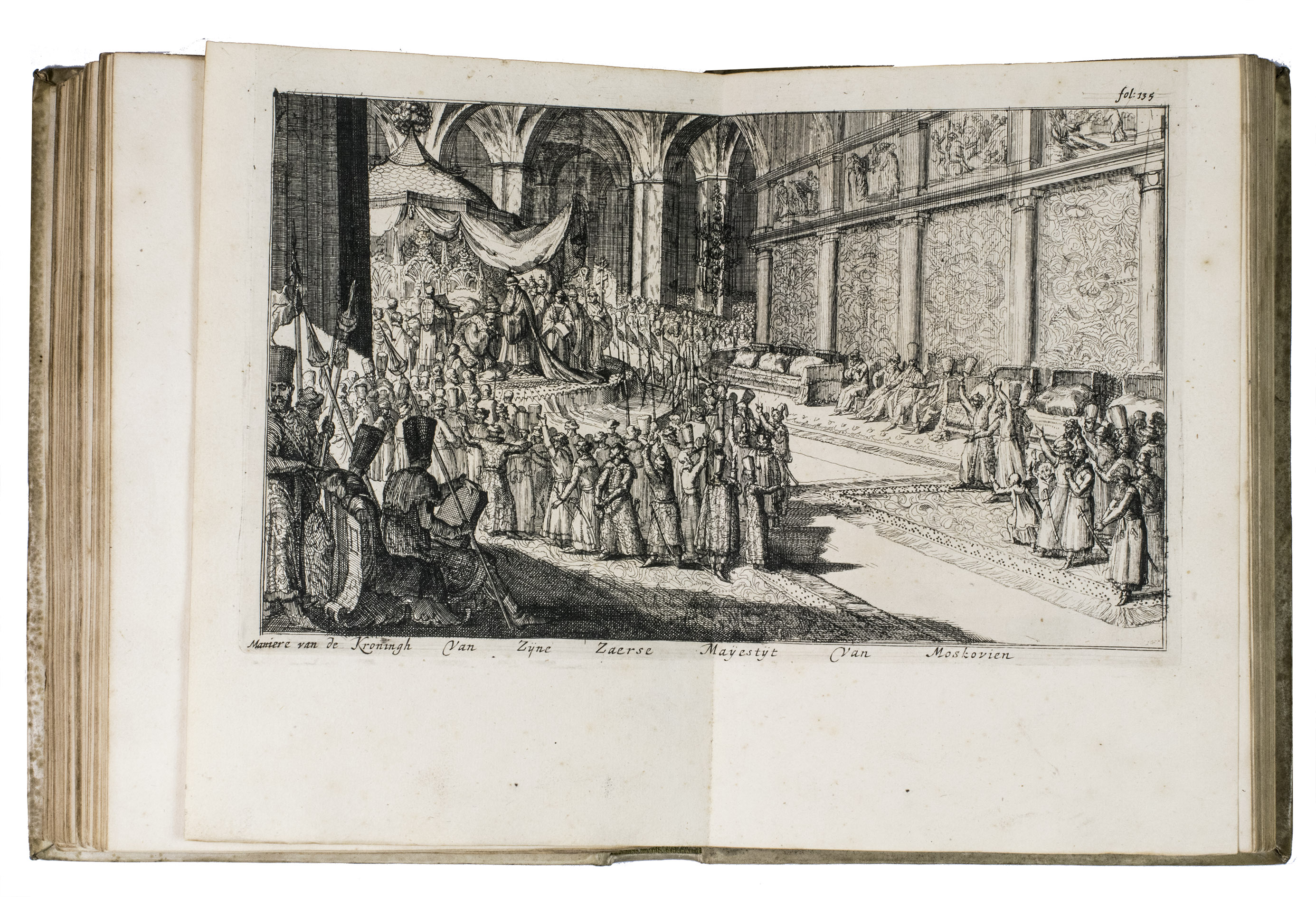 The vellum is somewhat scratched and lightly soiled. The bottom sewing thread has broken in quire L, causing pages 83-90 to be partly detached. This large paper copy with wide margins is otherwise in excellent condition. Adelung II, 124; Bibliothèque Impériale de St.-Pétersbourg, Catalogue de la section des Russica, vol. 1, K583; Landwehr, Romeyn de Hooghe as book illustrator 46; Muller, Bibl. Neerlando-Russe 200; STCN 850449480 (9 copies); Tiele, Bibl. 602; USTC 1813721 (8 copies); Van Gestel-Van het Schip, P., Maps in books of Russia and Poland, p. 546-547; cf. Boterbloem, "Russia and Europe: The Koenraad van Klenk Embassy to Moscow (1675-76)", in: Journal of Early Modern History vol. 14 (May 2010), no. 3, pp. 187-217.