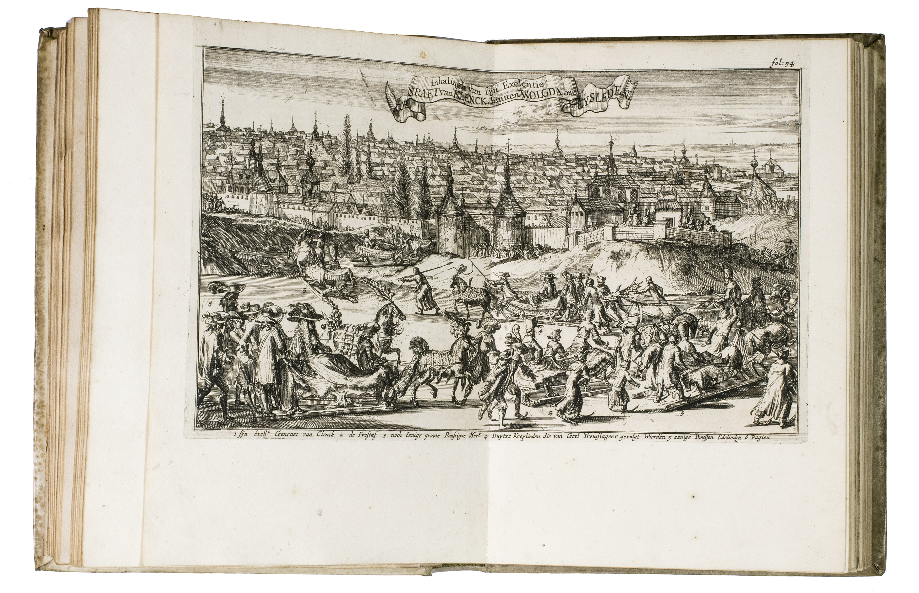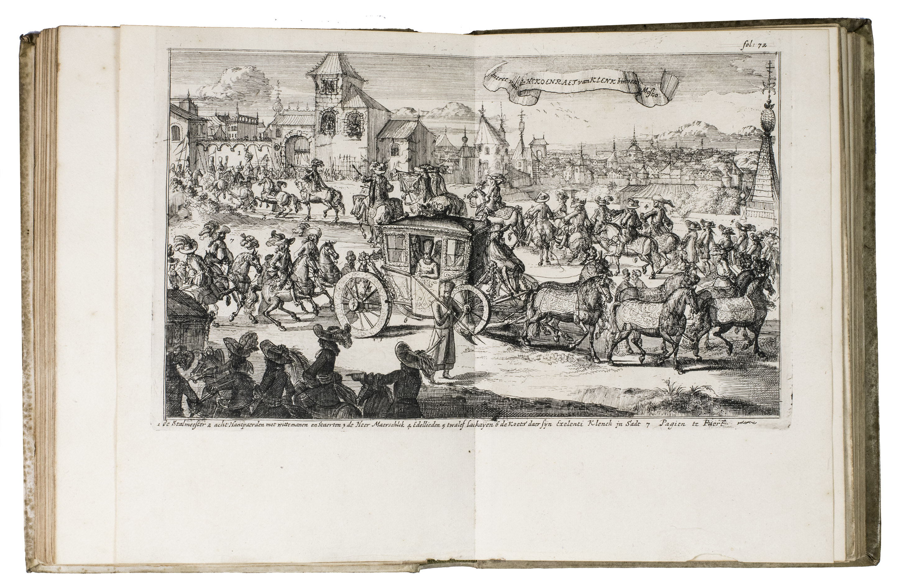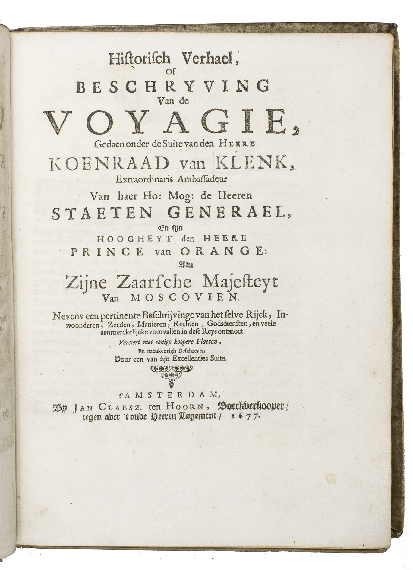 Rare large paper copy of the first edition of an important account detailing a Dutch embassy to Russia (1675-1676), with a frontispiece and six beautiful evocative etchings by Romeyn de Hooghe (1645-1708). Written by a member of the party, the work includes detailed descriptions of Russian manners and customs. Both Muller and Van Genkel-Van het Schip write that the work is considered to be the best source for the history of foreign relations of Russia during the reign of Tsar Alexei Mikhailovich (1645-1676) and the most important publication on Russia in the 17th century.