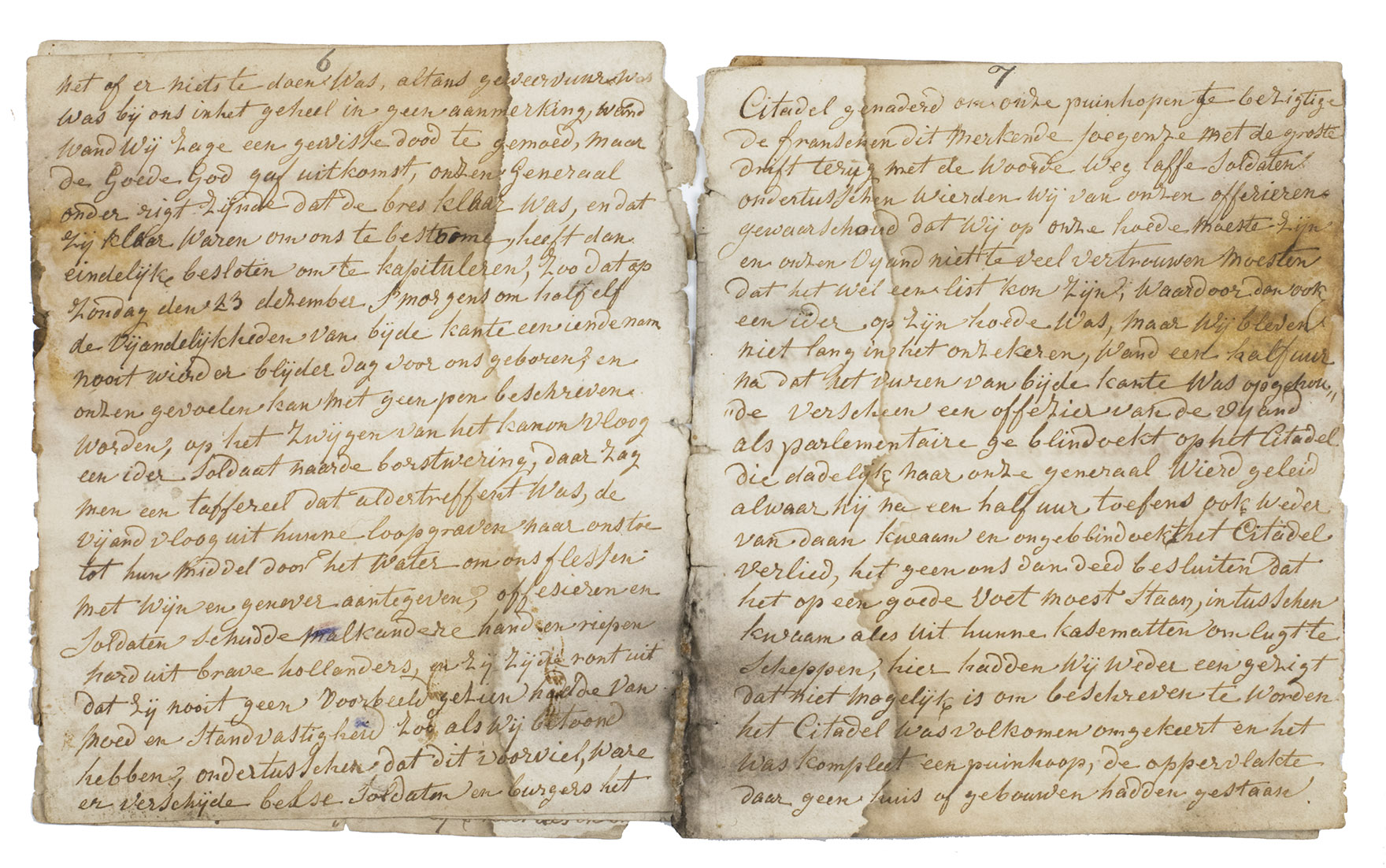 A very lively day-to-day eyewitness account of the siege of the Antwerp citadel from 12 November 1832 to the authors imprisonment in St. Omer as a result of the 23 December 1832 surrender. He remained in prison until June 1833, when he returned to Amsterdam. The account testifies to the intensity of the bombardments and exhausting battles as well as to the good treatment of prisoners by the French troops after surrender. The manuscript is written in Dutch in a legible hand of, apparently, a Dutch soldier possibly named Defourny. At the end of the letter, three members of the Defourny family testify that they have read the text: W[illem]. Defourny on 21 August 1897 (1864-1922), his son Engelbertus Jozephus Defourny W[illem]zn. (1901-1957), and E.J.s son Jacobus Cornelis Defourny (b. 1939). They may have been the grandson, great- and great-great grandson of Pierre Josephus Defourny (1808-pre 1880), a gunmaker who lived in Amsterdam after 1833, possibly the author of this account.