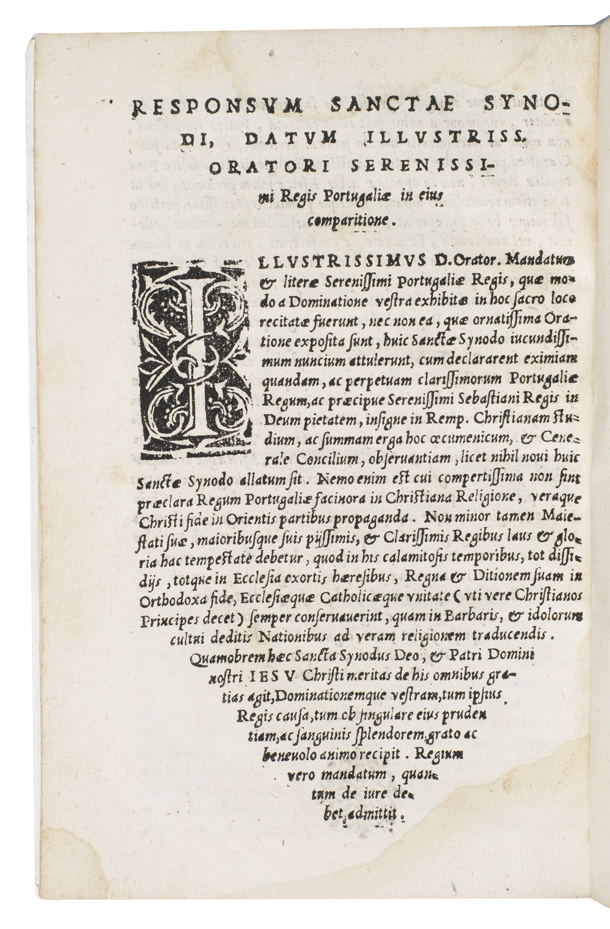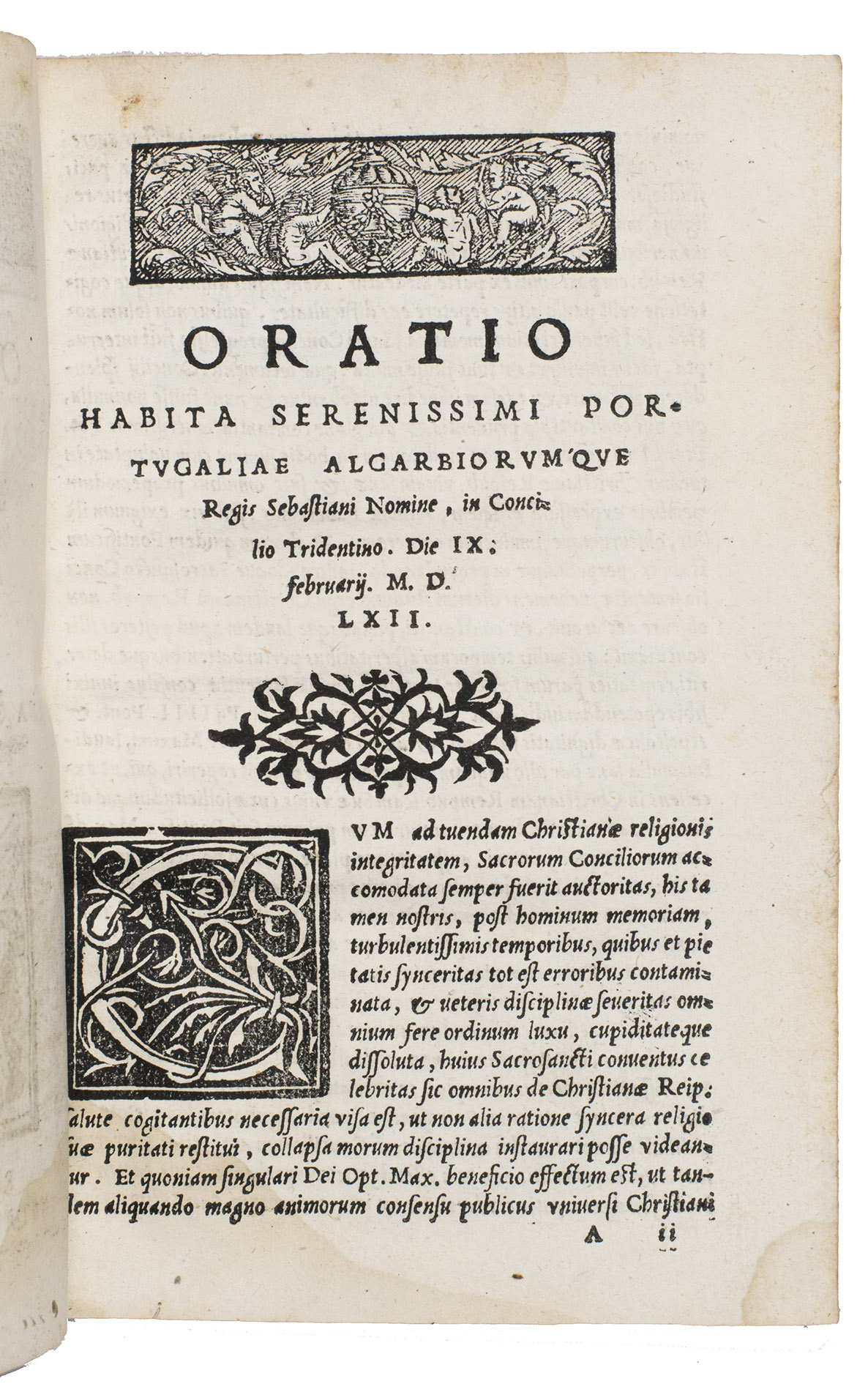 Rare copy of the speech written in name of King Sebastião of Portugal (1554-1578) for the Council of Trent (1545-1563). The speech was given on February 9, 1562, in front of the bishops and other attendants of the council, when King Sebastião was just 8 years old. The speeches provided by the Kings of the European nations were to be measured carefully, as the position taken by the Church in many matters carried geo-political changes; not a century ago, the Pope had granted a large portion of the South American territories to Portugal through the Treaty of Tordesillas, a line that took centuries to properly determine. It is unknown who wrote this speech, but it is often attributed to Giovanni Strozzi (active 1547-1562), who wrote another similar work. The text makes clear that the kings of Portugal have always been good Christians and promises that Sebastião will be as well. The last page contains the response from the Synod. This work rarely appears on the market.