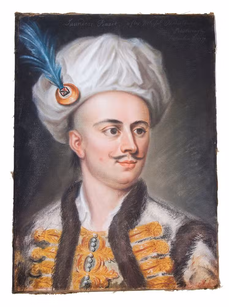 A pastel portrait drawn by the prolific itinerant portraitist John Saunders (1682-ca.1758) at Peterborough in September 1739. Saunders is recorded as active in East Anglia, the Midlands and elsewhere in the mid-18th century. The sitter John Sturges appears in Turkish costume, wearing a white turban with blue feather and a coat with gold trimmings and a fur collar. Saunders probably based it on a 1733 mezzotint drawn and engraved by Francis Kyte (d. 1744) after a painting (or the ink-wash drawing noted below?) by John Vanderbank (1694-1739). The pastel is of interest as an example of mid-18th century depiction of Turkish costume.