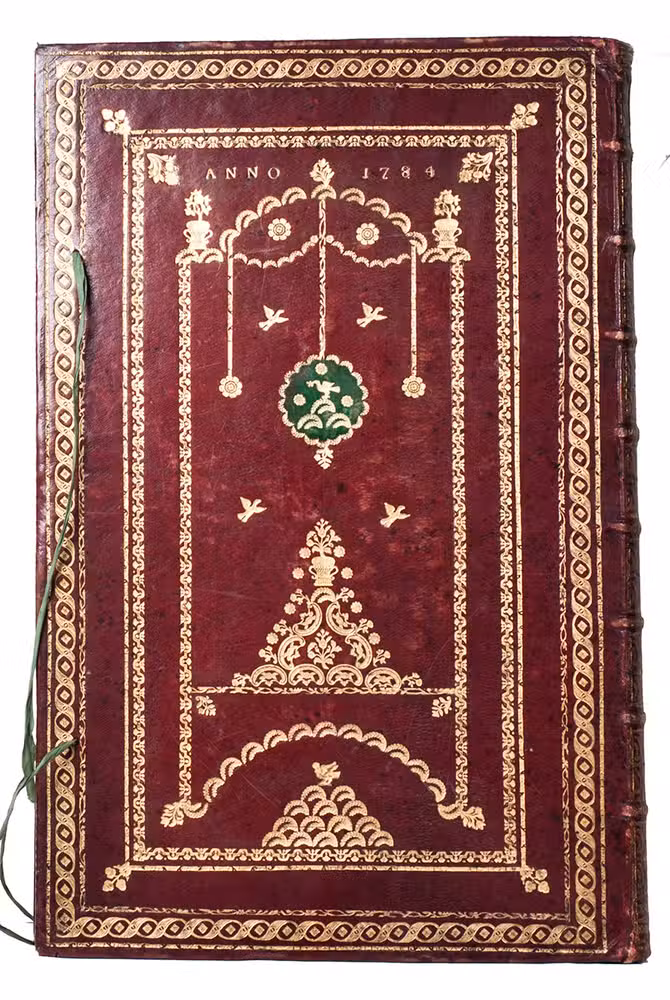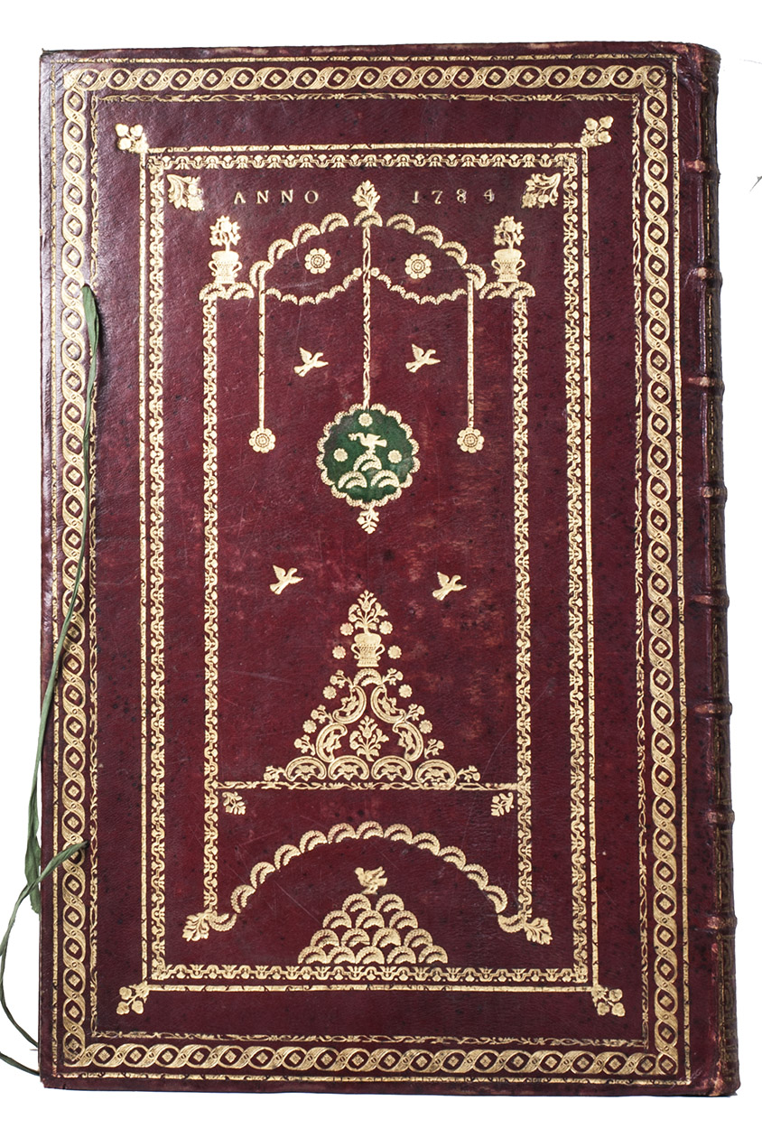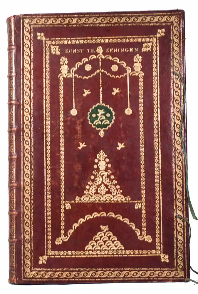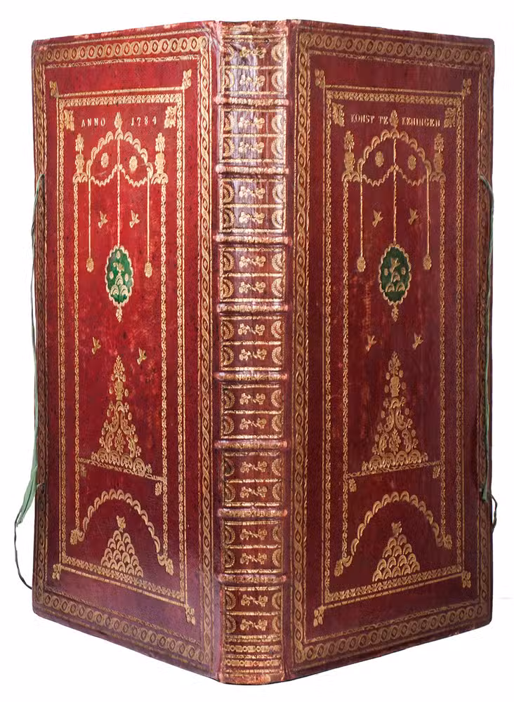 [The Netherlands], binding dated 1784. Large folio (52 x 33.5 cm). With 18 large, beautifully hand-drawn and coloured illustrations of birds.Contemporary richly gold-tooled red morocco over boards, sewn on 8 supports, each board with a round, gold-tooled, green morocco inlaid centre piece, gold-tooled board edges, 2 pairs of green cloth ties, gilt edges, and block-printed paste-paper endpapers in red and yellow. The spine is also richly gold-tooled with 2 different rolls to frame the compartments and underline the leaf and flower stamps. The front and back boards match, except for the gold lettering: on the front board "konst tekeningen" and on the back board "anno 1784". The tooling shows 4 different rolls, used for multiple frames, and numerous stamps of leaves, flowers, vases, birds and other decorative elements. 90 ll.