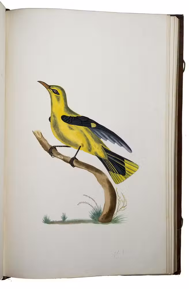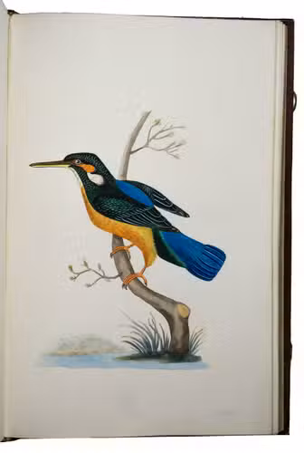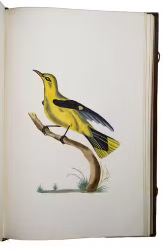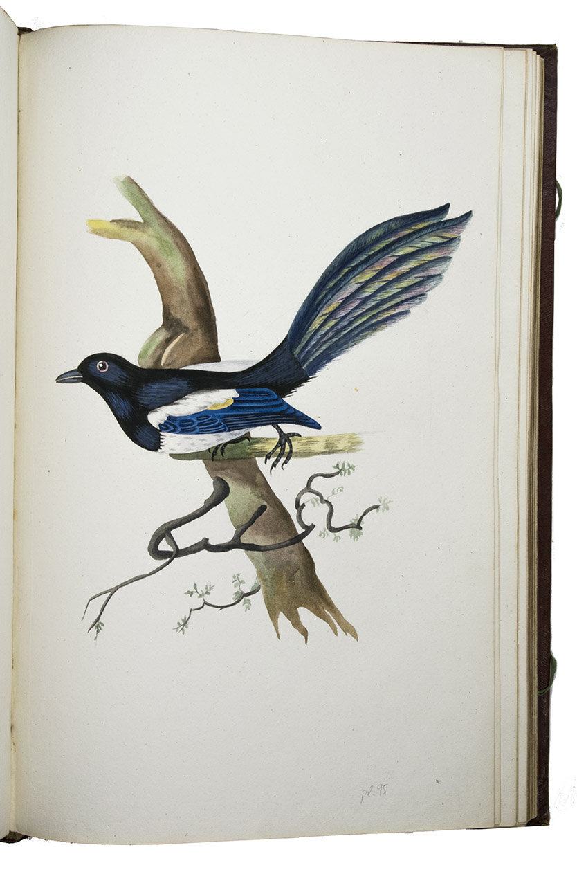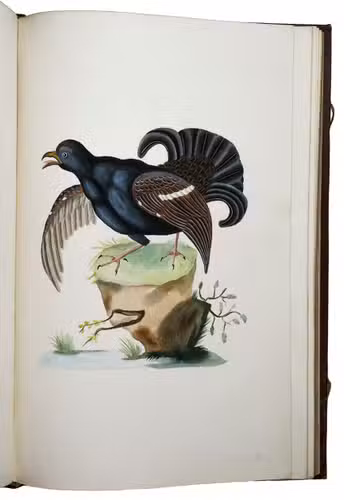 Splendidly bound drawing book containing 18 unsigned, detailed, watercolour and gouache drawings of birds. The colourful birds appear to be drawn after the plates in Edward Donovan's The natural history of British birds, first published in instalments between 1794 and 1819. If so, the present drawings must have been added to the drawing book at least 10 years after it was bound.