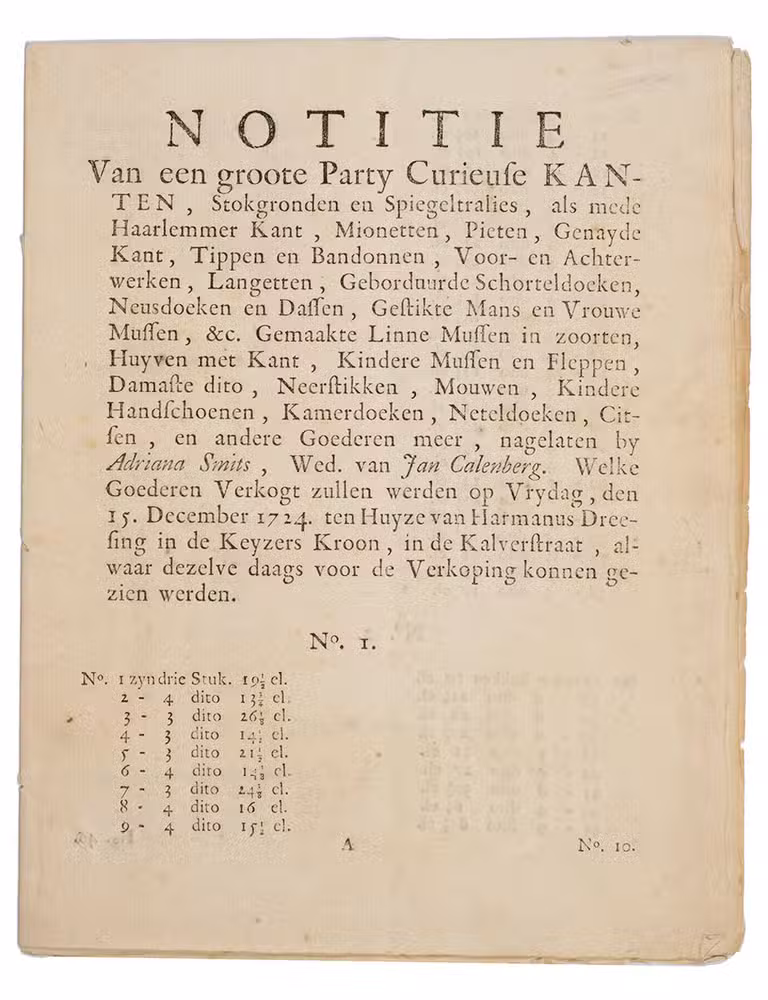 [Drop-title:] Notitie van een groote party curieuse kanten, stokgronden en spiegeltralies, als mede Haarlemmer kant, mionetten, pieten, genayde kant, tippen en bandonnen, voor-en achter- werken, langetten, geborduurde schorteldoeken, neusdoeken en dassen, gestikte mans en vrouwe mussen, &c. ... nagelaten by Adriana Smits, wed. van Jan Calenberg. Welke goederen verkogt zullen werden op vrydag, den 15. December 1724. Ten huyze van Harmanus Dreesing in de Keyzers Kroon, in de Kalverstraat ...